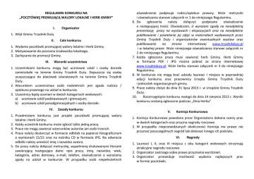 REGULAMIN KONKURSU NA „POCZTÓWKĘ PROMUJĄCĄ WALORY LOKALNE I HERB GMINY” I. Organizator 1. Wójt Gminy Trzydnik Duży II. Cele konkursu 1. Wydanie pocztówki promującej walory lokalne i Herb Gminy. 2. Motywowanie do poznania środowiska lokalnego. 3. Zachęcanie do promocji Gminy. III. Warunki uczestnictwa 1. Uczestnikami konkursu mogą być uczniowie szkół i osoby dorosłe zamieszkałe na terenie Gminy Trzydnik Duży. Dopuszcza się osoby uczęszczające do placówek oświatowych na terenie Gminy Trzydnik Duży. 2. Warunkiem uczestnictwa osób małoletnich jest zgoda rodzica / opiekuna prawnego na udział w konkursie. 3. Uczestnicy będą oceniani w dwóch kategoriach wiekowych: a) uczniowie szkół podstawowych i gimnazjum; b) uczniowie szkół ponadgimnazjalnych i osoby dorosłe. IV. Zasady konkursu 1. Przedmiotem konkursu jest projekt pocztówki promującej walory lokalne i Herb Gminy. 2. Każdy uczestnik konkursu może zgłosić tylko jedną pracę. 3. Prace nie mogą zawierać wizerunków autorów ani osób trzecich. 4. Prace należy dostarczyć w formacie odbitek na papierze fotograficznym o wymiarach 15/21 oraz na nośniku CD w formacie JPG. Na odwrocie odbitki należy umieścić imię i nazwisko autora. 5. Do pracy należy dołączyć metryczkę, wypełnioną drukowanymi literami zawierającą następujące dane: opis pracy, imię, nazwisko, wiek, kategoria, adres domowy, e-mail, telefon, oświadczenie o wyrażaniu zgody na udział w konkursie. W przypadku osób niepełnoletnich oświadczenie podpisuje rodzic/opiekun prawny. Wzór metryczki i oświadczenia stanowi załącznik nr 1 do niniejszego Regulaminu. 6. Do zgłoszenia należy dołączyć podpisane oświadczenie o następującej treści: Oświadczam, iż wyrażam zgodę na nieodpłatną prezentację pracy na wystawach i ekspozycjach oraz na nieodpłatne publikowanie i powielanie jej zdjęć w materiałach wydawanych przez Gminę Trzydnik Duży i organizatorów ewentualnych wystaw oraz publikowanie na stronie internetowej www.trzydnikduzy.pl i w lokalnej prasie. Wzór niniejszego oświadczenia stanowi załącznik nr 2 do niniejszego Regulaminu. 7. Każda zgłoszona praca musi zawierać herb Gminy. Herb Gminy w formacie PDF i JPG można pobrać ze strony internetowej www.trzydniduzy.pl. Wzór herbu stanowi załącznik nr 3 do niniejszego Regulaminu. 8. W konkursie nie mogą brać udziału laureaci I miejsca w poprzedniej edycji konkursu oraz pracownicy Urzędu Gminy Trzydnik Duży i jednostek organizacyjnych gminy. 9. Prace należy złożyć do dnia 31 lipca 2013 r. w Urzędzie Gminy Trzydnik Duży. 10. Rozstrzygnięcie konkursu nastąpi do dnia 14 sierpnia 2013 r. Wyniki konkursu zostaną ogłoszone podczas „Dnia Herbu” V. Komisja Konkursowa 1. Komisja Konkursowa powołana przez Organizatora dokona oceny prac w dwóch kategoriach oraz przyzna nagrody rzeczowe. 2. W przypadku nieprzewidzianych okoliczności Komisja ma prawo nie przyznać poszczególnych nagród lub dokonać innego ich podziału. VI. Nagrody 1. Laureaci I, II, oraz III miejsca z obu kategorii wiekowych otrzymają atrakcyjne nagrody rzeczowe. 2. Organizator zastrzega sobie prawo przyznania wyróżnień. 3. Organizator przewiduje możliwość wydania najlepszych prac w formie pocztówki. Załącznik Nr 1 do Regulaminu 4. Organizator zastrzega sobie prawo do wykorzystania zgłoszonych prac bądź ich elementów do opracowania własnego projektu i wydania pocztówki promującej Herb i Gminę Trzydnik Duży. VII. Postanowienia końcowe 1. Zgłoszenie pracy do konkursu jest jednoznaczne z przyjęciem warunków niniejszego regulaminu i oświadczeniem, że prace złożone na konkurs wykonane zostały osobiście, wykorzystane zdjęcia przedstawiają teren Gminy Trzydnik Duży i stanowią własność autora. Organizator nie ponosi odpowiedzialności za złamanie tego punktu Regulaminu przez Uczestnika. 2. Prace zgłoszone do konkursu nie będą zwracane. 3. Organizator konkursu zastrzega sobie prawo do nieodpłatnego wystawiania prac konkursowych podczas wystawy zorganizowanej z okazji „Dnia Herbu” oraz nieodpłatnego wykorzystania zgłoszonych prac w celach promocyjnych. 4. Organizator nie ponosi odpowiedzialności za ewentualne szkody spowodowane opublikowaniem nieprawdziwych danych bądź innych nieprawdziwych informacji opartych na zgłoszeniach sporządzonych przez Uczestników. 5. Decyzje Komisji Konkursowej są ostateczne i wiążące dla Uczestników. Metryczka Zgłoszenie udziału w konkursie na „POCZTÓWKĘ PROMUJĄCĄ WALORY LOKALNE I HERB GMINY” Opis pracy: (wskazanie miejsca obiektu, jaki został przedstawiony itd.) Imię: Nazwisko: Wiek: Kategoria: (zaznaczyć właściwe znakiem x) uczniowie szkół podstawowych i gimnazjum uczniowie szkół ponadgimnazjalnych i osoby dorosłe Adres domowy: VII. Informacje dodatkowe 1. Szczegółowych informacji 15 8731879, wew. 321. udziela: Katarzyna Janiec, tel. E-mail: Telefon: Oświadczam, iż wyrażam zgodę na udział syna/córki………………………1,2 w konkursie na „Pocztówkę promującą walory lokalne i Herb Gminy Trzydnik Duży” oraz akceptuję warunki Regulaminu konkursu. ...................................... ........................................... (miejscowość, data) 1 (Czytelny podpis uczestnika konkursu)3 niepotrzebne skreślić wypełnić w przypadku osób małoletnich 3 podpis rodzica/opiekuna prawnego w przypadku osób małoletnich 2 Załącznik Nr 2 do Regulaminu Oświadczenie Oświadczam, iż wyrażam zgodę na nieodpłatną prezentację pracy na wystawach i ekspozycjach oraz na nieodpłatne publikowanie i powielanie jej zdjęć w materiałach wydawanych przez Gminę Trzydnik Duży i organizatorów ewentualnych wystaw oraz publikowanie na stronie internetowej www.trzydnikduzy.pl i w lokalnej prasie. ...................................... (miejscowość, data) ........................................... (Czytelny podpis uczestnika konkursu) podpis rodzica/opieku