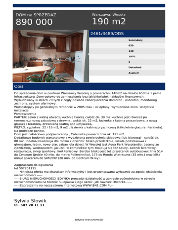 DOM na SPRZEDAŻ 890 000 Warszawa, Wesoła 190 m2 2461/3489/ODS Secondary 650 140 1970 5 Detached Asphalt Opis Do sprzedania dom w centrum Warszawy Wesołej o powierzchni 140m2 na działce 650m2 z pełna infrastrukturą .Dom gotowy do zamieszkania bez jakichkolwiek nakładów finansowych. Wybudowany w latach 70 tych z cegły posiada zabezpieczenia domofon , wideofon, monitoring ,ochrona, system alarmowy. Wolnostojący po generalnym remoncie w 2005 roku ; ocieplony, wymienione okna, wszystkie instalacje. Pomieszczenia PARTER: salon z widną otwartą kuchnią tworzą całość ok. 30 m2 kuchnia jest również po remoncie,z nową zabudową z drewna , pokój ok. 22 m2, łazienka z kabiną prysznicową, z nową glazurą i terakotą, drewnianą szafką pod umywalką. PIĘTRO: sypialnie: 22 i 16 m2, 9 m2 ; łazienka z kabiną prysznicową (kilkuletnia glazura i terakota). Na podłodze panele. Dom jest całościowo podpiwniczony , Całkowita powierzchnia ok. 195 m2. Dodatkowo budynek warsztatowy z wydzieloną powierzchnią sklepową (lub biurową) - całość ok. 80 m2. Idealna lokalizacja dla rodzin z dziećmi: blisko przedszkole, szkoła podstawowa i gimnazjum, ładny, nowy plac zabaw dla dzieci. W Wesołej jest Aqua Park Wesolandia: baseny ze zjeżdżalnią, wodospadem, jacuzzi, w kompleksie tym znajdują się też sauny, salonik bilardowy, restauracja, sklep sportowy, kort tenisowy. Bardzo blisko jest też przystanek autobusowy: linia 514 do Centrum (jedzie 40 min. do metra Politechnika), 173 do Ronda Wiatraczna (35 min.) oraz kilka minut spacerem do SKM/PKP (20 min. do Centrum W-wy). Zaqpraszam do ogladania tel 507201111 -----Niniejsza oferta ma charakter informacyjny i jest prezentowana wyłącznie za zgodą właściciela nieruchomości.---------BIURO NIERUCHOMOŚCI JEDYNKA prowadzi działalność w zakresie pośrednictwa w obrocie nieruchomościami na terenie Sulejówka i jego okolic, jak również Otwocka.---------Zapraszamy na naszą stronę internetową WWW.BN1.COM.PL-- Sylwia Slowik tel. 507 20 11 11 Jedynka Nieruchomości tel. 22 783 22 80 email: [email protected] Jedynka Nieruchomości Powered by TCPDF (www.tcpdf.org)