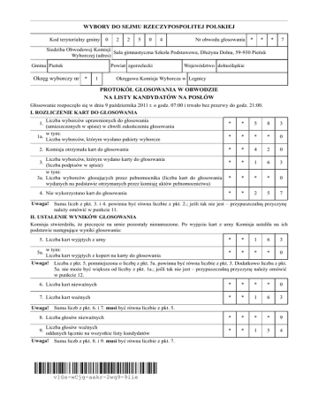 WYBORY DO SEJMU RZECZYPOSPOLITEJ POLSKIEJ Kod terytorialny gminy 0 2 2 5 0 4 Nr obwodu głosowania * * * 7 Siedziba Obwodowej Komisji Sala gimnastyczna Szkoła Podstawowa, Dłużyna Dolna, 59-930 Pieńsk Wyborczej (adres) Gmina Pieńsk Okręg wyborczy nr * Powiat zgorzelecki 1 Województwo dolnośląskie Okręgowa Komisja Wyborcza w Legnicy PROTOKÓŁ GŁOSOWANIA W OBWODZIE NA LISTY KANDYDATÓW NA POSŁÓW Głosowanie rozpoczęło się w dniu 9 października 2011 r. o godz. 07:00 i trwało bez przerwy do godz. 21:00. I. ROZLICZENIE KART DO GŁOSOWANIA Liczba wyborców uprawnionych do głosowania (umieszczonych w spisie) w chwili zakończenia głosowania w tym: 1a. Liczba wyborców, którym wysłano pakiety wyborcze 1. 2. Komisja otrzymała kart do głosowania Liczba wyborców, którym wydano karty do głosowania (liczba podpisów w spisie) w tym: 3a. Liczba wyborców głosujących przez pełnomocnika (liczba kart do głosowania wydanych na podstawie otrzymanych przez komisję aktów pełnomocnictwa) 3. 4. Nie wykorzystano kart do głosowania * * 5 8 3 * * * * 0 * * 4 2 0 * * 1 6 3 * * * * 0 * * 2 5 7 Uwaga! Suma liczb z pkt. 3. i 4. powinna być równa liczbie z pkt. 2.; jeśli tak nie jest – przypuszczalną przyczynę należy omówić w punkcie 11. II. USTALENIE WYNIKÓW GŁOSOWANIA Komisja stwierdziła, że pieczęcie na urnie pozostały nienaruszone. Po wyjęciu kart z urny Komisja ustaliła na ich podstawie następujące wyniki głosowania: 5. Liczba kart wyjętych z urny 5a. w tym: Liczba kart wyjętych z kopert na karty do głosowania * * 1 6 3 * * * * 0 Uwaga! Liczba z pkt. 5. pomniejszona o liczbę z pkt. 5a. powinna być równa liczbie z pkt. 3. Dodatkowo liczba z pkt. 5a. nie może być większa od liczby z pkt. 1a.; jeśli tak nie jest – przypuszczalną przyczynę należy omówić w punkcie 12. 6. Liczba kart nieważnych * * * * 0 7. Liczba kart ważnych * * 1 6 3 * * * * 9 * * 1 5 4 Uwaga! Suma liczb z pkt. 6. i 7. musi być równa liczbie z pkt. 5. 8. Liczba głosów nieważnych 9. Liczba głosów ważnych oddanych łącznie na wszystkie listy kandydatów Uwaga! Suma liczb z pkt. 8. i 9. musi być równa liczbie z pkt. 7. v]Gs-wCjg-aakr-2wq9-9iie –2– 10. Na poszczególne listy kandydatów i umieszczonych na nich kandydatów oddano następujące liczby głosów ważnych: Lista nr 1 — KW Prawo i Sprawiedliwość Liczba głosów ważnych oddanych na listę: * * * 6 1 1. LIPIŃSKI Adam Józef * * * 1 2 2. WITEK Elżbieta Barbara * * * * 7 3. MACHAŁEK Marzena Anna * * * 2 1 4. ŚLUSARZ Rafał Józef * * * * 1 5. IDCZAK Witold Lech * * * * 1 6. STACHYRA Jerzy Grzegorz * * * * 3 7. KUBÓW Krzysztof Jan * * * * 0 8. ZEMBIK Wojciech Bolesław * * * * 0 9. GROCKI Władysław Ryszard * * * * 0 10. SIDOROWICZ Dorota Małgorzata * * * * 0 11. HORZEMPA Mirosław * * * * 0 12. ZUBOWSKI Wojciech Michał * * * * 1 13. SZYMAŃSKI Rafał Piotr * * * * 3 14. GĘBORYS Jarosław Andrzej * * * * 0 15. BUCIUTO Jadwiga Barbara * * * * 5 16. MAJSNER Iwona * * * * 0 17. LACHOWICZ Julian * * * * 0 18. ZAWIŚLAK Katarzyna Małgorzata * * * * 1 19. BIRUT Teresa Mariola * * * * 2 20. TROCZYŃSKA Danuta Anna * * * * 0 21. DURAJ Joanna Edyta * * * * 0 22. ZATYLNA Irena * * * * 1 23. TARNOWSKI Jarosław Michał * * * * 0 24. ZOŁOTEŃKI Paweł * * * * 3 * * * 6 1 Na poszczególnych kandydatów z tej listy oddano następujące liczby głosów ważnych: Razem Uwaga! Suma głosów oddanych na wszystkich kandydatów z danej listy (rubryka „Razem”) równa się liczbie głosów ważnych oddanych na tę listę. Wyjątek od tej zasady może dotyczyć listy, na której znajduje się nazwisko kandydata skreślonego z listy. v]Gs-wCjg-aakr-2wq9-9iie –3– Lista nr 2 — KW Polska Jest Najważniejsza Liczba głosów ważnych oddanych na listę: * * * * 1 1. SWAKOŃ Jacek * * * * 0 2. SKIBIŃSKI Leszek Andrzej * * * * 0 3. WOJCIECHOWSKI Jan * * * * 0 4. GIERUS Mariusz Karol * * * * 1 5. OPALIŃSKI Krzysztof Adam * * * * 0 6. NIEDBALSKA Ewa Alicja * * * * 0 7. DERNOGA Paweł * * * * 0 8. ŁYCZKO Anna Agata * * * * 0 9. KULIKOWSKA Dorota Aleksandra * * * * 0 10. PTAK Anna Maria * * * * 0 11. LIBERA Stanisław Jan * * * * 0 12. PAŃKÓW Marian * * * * 0 13. MICHALISZYN Angelika * * * * 0 14. MYKYTJUK Anna * * * * 0 15. SZMATLOCH Łucja Ewa * * * * 0 16. MOLIŃSKA Izabela Katarzyna * * * * 0 17. SZYNAL Dariusz Wiesław * * * * 0 18. DOROŻYŃSKI Tomasz Dawid * * * * 0 19. NIERYCHŁY Artur Piotr * * * * 0 * * * * 1 Na poszczególnych kandydatów z tej listy oddano następujące liczby głosów ważnych: Razem Uwaga! Suma głosów oddanych na wszystkich kandydatów z danej listy (rubryka „Razem”) równa się liczbie głosów ważnych oddanych na tę listę. Wyjątek od tej zasady może dotyczyć listy, na której znajduje się nazwisko kandydata skreślonego z listy. v]Gs-wCjg-aakr-2wq9-9iie –4– Lista nr 3 — Komitet Wyborczy SLD Liczba głosów ważnych oddanych na listę: * * * * 6 1. ZBRZYZNY Ryszard * * * * 0 2. ZAKRZEWSKA Elżbieta * * * * 3 3. SEKUŁA-SZMAJDZIŃSKA Małgorzata Helena * * * * 0 4. KUSIAK Józef * * * * 0 5. ŚMIECHOWSKA Adrianna Inez * * * * 0 6. ZDANOWICZ Zbigniew * * * * 1 7. HUZARSKI Michał Seweryn * * * * 0 8. ŚWIĄTEK Andrzej Kazimierz * * * * 0 9. KRÓL Józef * * * * 1 10. SIENKIEWICZ Zbigniew Ryszard * * * * 0 11. MIARA Rafał * * * * 0 12. SZUDROWICZ Lucyna * * * * 0 13. KAMIŃSKI Paweł Ryszard * * * * 0 14. CHMIELEWSKA Sylwia * * * * 0 15. BACZMAŃSKI Henryk Stanisław * * * * 0 16. NICZYPORUK Jerzy Grzegorz * * * * 0 17. KUKLA Agnieszka Sylwia * * * * 0 18. TAZBIR-SUCHOCKA Magdalena * * * * 0 19. SPECYLAK Iwona Anna * * * * 0 20. DEMECKI Adam * * * * 0 21. JĘDRZEJEWSKA Elżbieta Urszula * * * * 0 22. ŚWIĘTOCHOWSKI Waldemar Wacław * * * * 1 23. PIOTROWICZ Joanna Agnieszka * * * * 0 * * * * 6 Na poszczególnych kandydatów z tej listy oddano następujące liczby głosów ważnych: Razem Uwaga! Suma głosów oddanych na wszystkich kandydatów z danej listy (rubryka