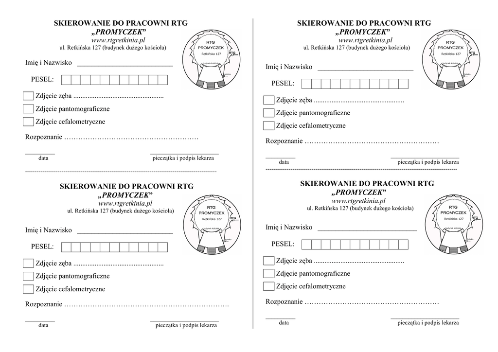 SKIEROWANIE DO PRACOWNI RTG „PROMYCZEK” SKIEROWANIE DO PRACOWNI RTG „PROMYCZEK” www.rtgretkinia.pl www.rtgretkinia.pl ul. Retkińska 127 (budynek duŜego kościoła) Imię i Nazwisko ___________________________ PESEL: ul. Retkińska 127 (budynek duŜego kościoła) Imię i Nazwisko ___________________________ PESEL: Zdjęcie zęba ................................................... Zdjęcie pantomograficzne Zdjęcie pantomograficzne Zdjęcie cefalometryczne Zdjęcie cefalometryczne Rozpoznanie ………………………………………………… __________ data Zdjęcie zęba ................................................... _______________________ pieczątka i podpis lekarza ---------------------------------------------------------------------------------------------------- Rozpoznanie ………………………………………………… __________ _______________________ data pieczątka i podpis lekarza ---------------------------------------------------------------------------------------------------- SKIEROWANIE DO PRACOWNI RTG „PROMYCZEK” SKIEROWANIE DO PRACOWNI RTG „PROMYCZEK” www.rtgretkinia.pl www.rtgretkinia.pl ul. Retkińska 127 (budynek duŜego kościoła) ul. Retkińska 127 (budynek duŜego kościoła) Imię i Nazwisko ___________________________ Imię i Nazwisko ____________________________ PESEL: PESEL: Zdjęcie zęba ................................................... Zdjęcie zęba ................................................... Zdjęcie pantomograficzne Zdjęcie pantomograficzne Zdjęcie cefalometryczne Zdjęcie cefalometryczne Rozpoznanie ……………………………………………………………. Rozpoznanie ………………………………………………… __________ data __________ data _______________________ pieczątka i podpis lekarza _______________________ pieczątka i podpis lekarza
