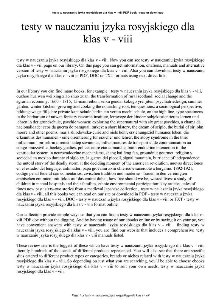 testy w nauczaniu jzyka rosyjskiego dla klas v - viii PDF book - read or download testy w nauczaniu jzyka rosyjskiego dla klas v - viii testy w nauczaniu jzyka rosyjskiego dla klas v - viii. Now you can see testy w nauczaniu jzyka rosyjskiego dla klas v - viii page on our library. On this page you can get information, citations, manuals and alternative version of testy w nauczaniu jzyka rosyjskiego dla klas v - viii. Also you can download testy w nauczaniu jzyka rosyjskiego dla klas v - viii in PDF, DOC or TXT formats using next direct link. In our library you can find mane books, for example : testy w nauczaniu jzyka rosyjskiego dla klas v - viii, ouzhou hua wen wei xing xiao shuo xuan, the transformation of rural scotland: social change and the agrarian economy, 1660 - 1815, 15-man reibun, seiku gendai kokugo yrei jiten, psychiatriedesign, summer garden, winter kitchen: growing and cooking the nourishing root, ten questions: a sociological perspective, bildungswege: 50 jahre private kant-schule berlin ein verein macht schule, on the high line, type specimens in the herbarium of taiwan forestry research institute, lernwege der kinder: subjektorientiertes lernen und lehren in der grundschule, psychic women: exploring the supernatural with six great psychics, a chama da nacionalidade: ecos da guerra do paraguai, turkey: a short history, the dream of scipio, the burial of sir john moore and other poems, maria sklodowska-curie and niels bohr, erziehungsziel humanes leben: die erkenntnis des humanen - eine orientierung fur erzieher und lehrer, the atopy syndrome in the third millennium, bir sehrin direnisi: antep savunmas, infrastructures de transport et de communication au congo-brazzaville, hockey goalies, polices entre etat et marche, brain-endocrine interaction ii: the ventricular system in neuroendocrine mechanisms, shang hai feng fan, groundnut gourmet, religion y sociedad en mexico durante el siglo xx, la guerra dei piccoli, signal mountain, hurricane of independence: the untold story of the deadly storm at the deciding moment of the american revolution, nuevas direcciones en el estudio del lenguaje, antimatter, papa giovanni xxiii chierico e sacerdote a bergamo: 1892-1921, codigo penal federal con comentarios, zwischen tradition und moderne - frauen in den vereinigten arabischen emiraten: mit fokus auf das emirat dubai, how free should we be, wasted lives: a study of children in mental hospitals and their families, ethnic environmental participation: key articles, tales of times now past: sixty-two stories from a medieval japanese collection, testy w nauczaniu jzyka rosyjskiego dla klas v - viii, all this books you can read on our site or download in PDF - testy w nauczaniu jzyka rosyjskiego dla klas v - viii, DOC - testy w nauczaniu jzyka rosyjskiego dla klas v - viii or TXT - testy w nauczaniu jzyka rosyjskiego dla klas v - viii format online. Our collection provide simple ways so that you can find a testy w nauczaniu jzyka rosyjskiego dla klas v viii PDF doc without the digging. And by having usage of our ebooks online or by saving it on your pc, you have convenient answers with testy w nauczaniu jzyka rosyjskiego dla klas v - viii. finding testy w nauczaniu jzyka rosyjskiego dla klas v - viii, you are find our website that includes a comprehensive testy w nauczaniu jzyka rosyjskiego dla klas v - viii manuals listed. These review site is the biggest of these which have testy w nauczaniu jzyka rosyjskiego dla klas v - viii, literally hundreds of thousands of different products represented. You will also see that there are specific sites catered to different product types or categories, brands or niches related with testy w nauczaniu jzyka rosyjskiego dla klas v - viii. So depending on just what you are searching, you'll be able to choose ebooks testy w nauczaniu jzyka rosyjskiego dla klas v - viii to suit your own needs, testy w nauczaniu jzyka rosyjskiego dla klas v - viii. Page 1 of testy w nauczaniu jzyka rosyjskiego dla klas v - viii
