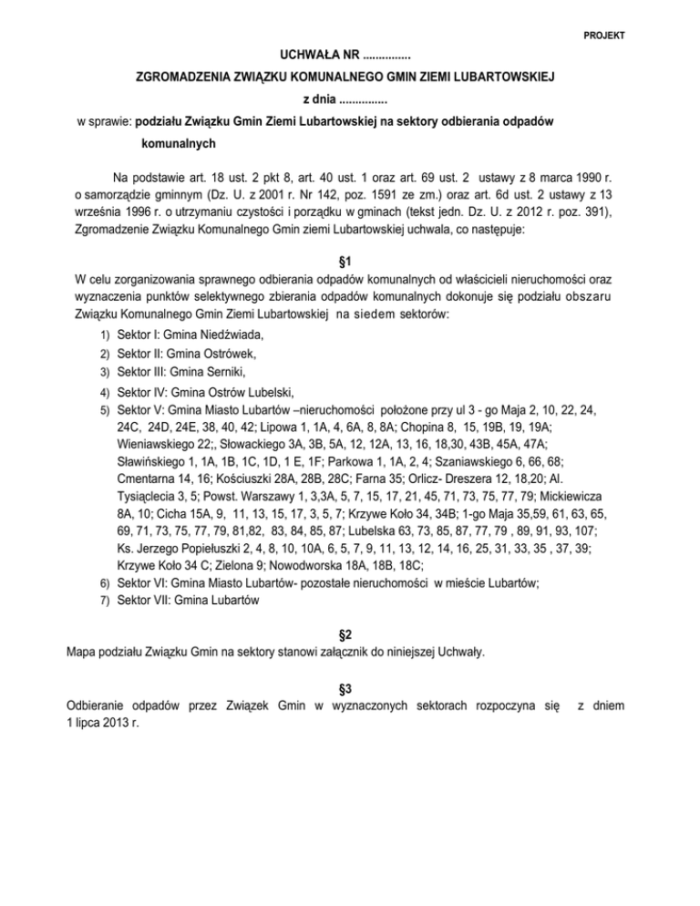 PROJEKT UCHWAŁA NR ............... ZGROMADZENIA ZWIĄZKU KOMUNALNEGO GMIN ZIEMI LUBARTOWSKIEJ z dnia ............... w sprawie: podziału Związku Gmin Ziemi Lubartowskiej na sektory odbierania odpadów komunalnych Na podstawie art. 18 ust. 2 pkt 8, art. 40 ust. 1 oraz art. 69 ust. 2 ustawy z 8 marca 1990 r. o samorządzie gminnym (Dz. U. z 2001 r. Nr 142, poz. 1591 ze zm.) oraz art. 6d ust. 2 ustawy z 13 września 1996 r. o utrzymaniu czystości i porządku w gminach (tekst jedn. Dz. U. z 2012 r. poz. 391), Zgromadzenie Związku Komunalnego Gmin ziemi Lubartowskiej uchwala, co następuje: §1 W celu zorganizowania sprawnego odbierania odpadów komunalnych od właścicieli nieruchomości oraz wyznaczenia punktów selektywnego zbierania odpadów komunalnych dokonuje się podziału obszaru Związku Komunalnego Gmin Ziemi Lubartowskiej na siedem sektorów: 1) Sektor I: Gmina Niedźwiada, 2) Sektor II: Gmina Ostrówek, 3) Sektor III: Gmina Serniki, 4) Sektor IV: Gmina Ostrów Lubelski, 5) Sektor V: Gmina Miasto Lubartów –nieruchomości położone przy ul 3 - go Maja 2, 10, 22, 24, 24C, 24D, 24E, 38, 40, 42; Lipowa 1, 1A, 4, 6A, 8, 8A; Chopina 8, 15, 19B, 19, 19A; Wieniawskiego 22;, Słowackiego 3A, 3B, 5A, 12, 12A, 13, 16, 18,30, 43B, 45A, 47A; Sławińskiego 1, 1A, 1B, 1C, 1D, 1 E, 1F; Parkowa 1, 1A, 2, 4; Szaniawskiego 6, 66, 68; Cmentarna 14, 16; Kościuszki 28A, 28B, 28C; Farna 35; Orlicz- Dreszera 12, 18,20; Al. Tysiąclecia 3, 5; Powst. Warszawy 1, 3,3A, 5, 7, 15, 17, 21, 45, 71, 73, 75, 77, 79; Mickiewicza 8A, 10; Cicha 15A, 9, 11, 13, 15, 17, 3, 5, 7; Krzywe Koło 34, 34B; 1-go Maja 35,59, 61, 63, 65, 69, 71, 73, 75, 77, 79, 81,82, 83, 84, 85, 87; Lubelska 63, 73, 85, 87, 77, 79 , 89, 91, 93, 107; Ks. Jerzego Popiełuszki 2, 4, 8, 10, 10A, 6, 5, 7, 9, 11, 13, 12, 14, 16, 25, 31, 33, 35 , 37, 39; Krzywe Koło 34 C; Zielona 9; Nowodworska 18A, 18B, 18C; 6) Sektor VI: Gmina Miasto Lubartów- pozostałe nieruchomości w mieście Lubartów; 7) Sektor VII: Gmina Lubartów §2 Mapa podziału Związku Gmin na sektory stanowi załącznik do niniejszej Uchwały. §3 Odbieranie odpadów przez Związek Gmin w wyznaczonych sektorach rozpoczyna się 1 lipca 2013 r. z dniem §4 Wykonanie uchwały powierza się Zarządowi Związku. §5 Uchwala wchodzi w życie po upływie 14 dni od dnia jej ogłoszenia w Dzienniku Urzędowym Województwa Lubelskiego. PRZEWODNICZĄCY ZGROMADZENIA ZWIĄZKU Janusz Bodziacki Sprawdzono pod względem formalno-prawnym Lublin, 08.02.2013