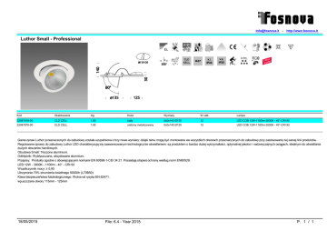 [email protected] - http://www.fosnova.it Luthor Small - Professional Kod Okablowanie Kg Kolor Wymiary W całk. Lampa 22087818-00 CLD CELL 1.00 biały 0x0x140 Ø135 12 LED COB 12W-1100lm-3000K - 40°-CRI 92 22087878-00 CLD CELL 1.00 srebrny metalizowany 0x0x140 Ø135 12 LED COB 12W-1100lm-3000K - 40°-CRI 92 Gama opraw Luthor przeznaczonych do zabudowy została uzupełniona o trzy nowe wymiary: dzięki temu mogą być montowane we wszystkich otworach przeznaczonych do zabudowy przy zastosowaniu tej samej linii produktów. Regulowane oprawy do zabudowy Luthor LED charakteryzują się zaawansowanym technologicznie oświetleniem: są produktem o bardzo dużej wytrzymałości, optymalnej jakości i nadzwyczajnych osiągach, idealnym do oświetlania dużych obszarów handlowych. Obudowa Small: Tłoczone aluminium. Odbłyśnik: Wybłyszczane, oksydowane alumnium. Przepisy: Produkty zgodne z obowiązującymi normami EN 60598-1-CEI 34 21. Posiadają stopień ochrony według norm EN60529. LED:12W - 3000K - 1100lm - 40° - CRI 92 Współczynnik mocy: ≥ 0,95 Utrzymanie 70% strumienia świetlnego 50000h (L70B50) Klasa bezpieczeństwa fotobiologicznego: Wolna od ryzyka EN 62471. wpuszczane otwory 115mm - 125mm 18/05/2015 File: 6.4 - Year 2015 P. 1 / 1