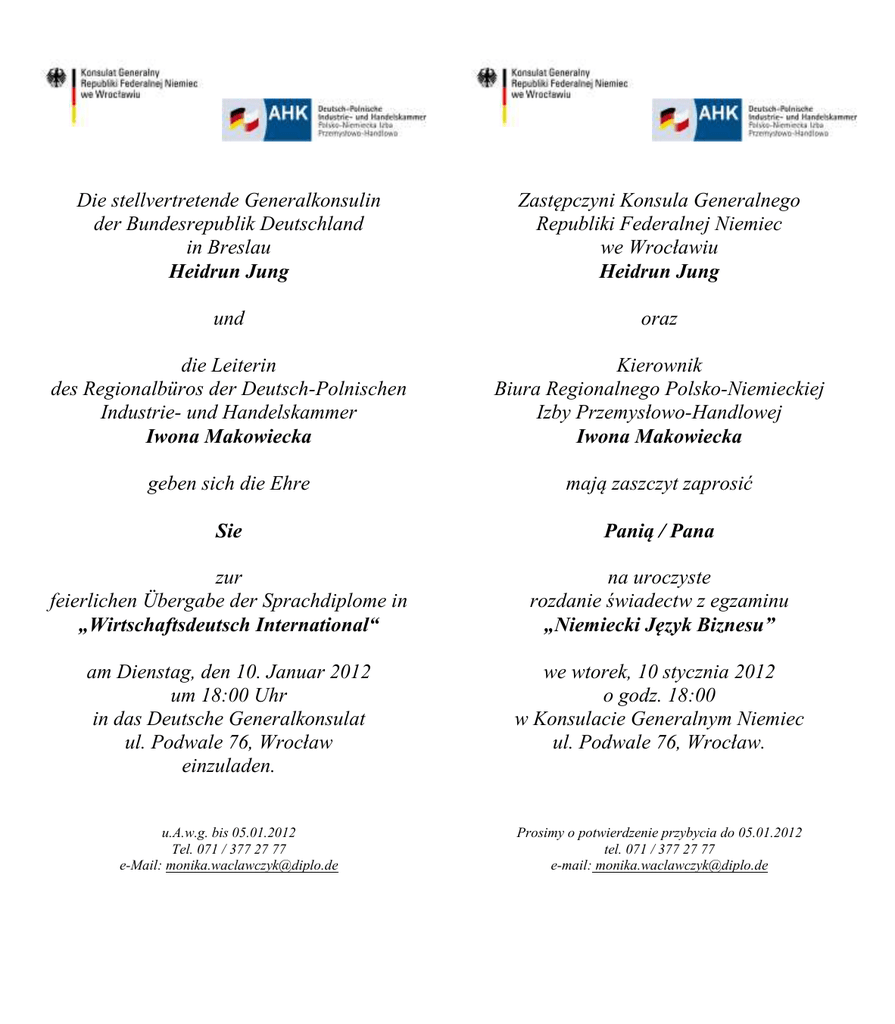 Die stellvertretende Generalkonsulin der Bundesrepublik Deutschland in Breslau Heidrun Jung Zastępczyni Konsula Generalnego Republiki Federalnej Niemiec we Wrocławiu Heidrun Jung und oraz die Leiterin des Regionalbüros der Deutsch-Polnischen Industrie- und Handelskammer Iwona Makowiecka Kierownik Biura Regionalnego Polsko-Niemieckiej Izby Przemysłowo-Handlowej Iwona Makowiecka geben sich die Ehre mają zaszczyt zaprosić Sie Panią / Pana zur feierlichen Übergabe der Sprachdiplome in „Wirtschaftsdeutsch International“ na uroczyste rozdanie świadectw z egzaminu „Niemiecki Język Biznesu” am Dienstag, den 10. Januar 2012 um 18:00 Uhr in das Deutsche Generalkonsulat ul. Podwale 76, Wrocław einzuladen. we wtorek, 10 stycznia 2012 o godz. 18:00 w Konsulacie Generalnym Niemiec ul. Podwale 76, Wrocław. u.A.w.g. bis 05.01.2012 Tel. 071 / 377 27 77 e-Mail: [email protected] Prosimy o potwierdzenie przybycia do 05.01.2012 tel. 071 / 377 27 77 e-mail: [email protected]