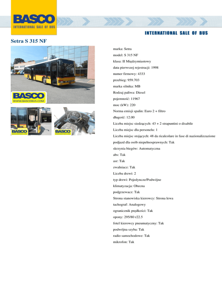 Setra S 315 NF marka: Setra model: S 315 NF klasa: II Międzymiastowy data pierwszej rejestracji: 1998 numer firmowy: 4333 przebieg: 959.703 marka silnika: MB Rodzaj paliwa: Diesel pojemność: 11967 moc (kW): 220 Norma emisji spalin: Euro 2 + filtro długość: 12.00 Liczba miejsc siedzących: 43 + 2 strapuntini o disabile Liczba miejsc dla personelu: 1 Liczba miejsc stojących: 48 da ricalcolare in fase di nazionalizzazione podjazd dla osób niepełnosprawnych: Tak skrzynia biegów: Automatyczna abs: Tak asr: Tak zwalniacz: Tak Liczba drzwi: 2 typ drzwi: Pojedyncze/Podwójne klimatyzacja: Obecna podgrzewacz: Tak Strona stanowiska kierowcy: Strona lewa tachograf: Analogowy ogranicznik prędkości: Tak opony: 295/80 r22.5 fotel kierowcy pneumatyczny: Tak podwójna szyba: Tak radio samochodowe: Tak mikrofon: Tak