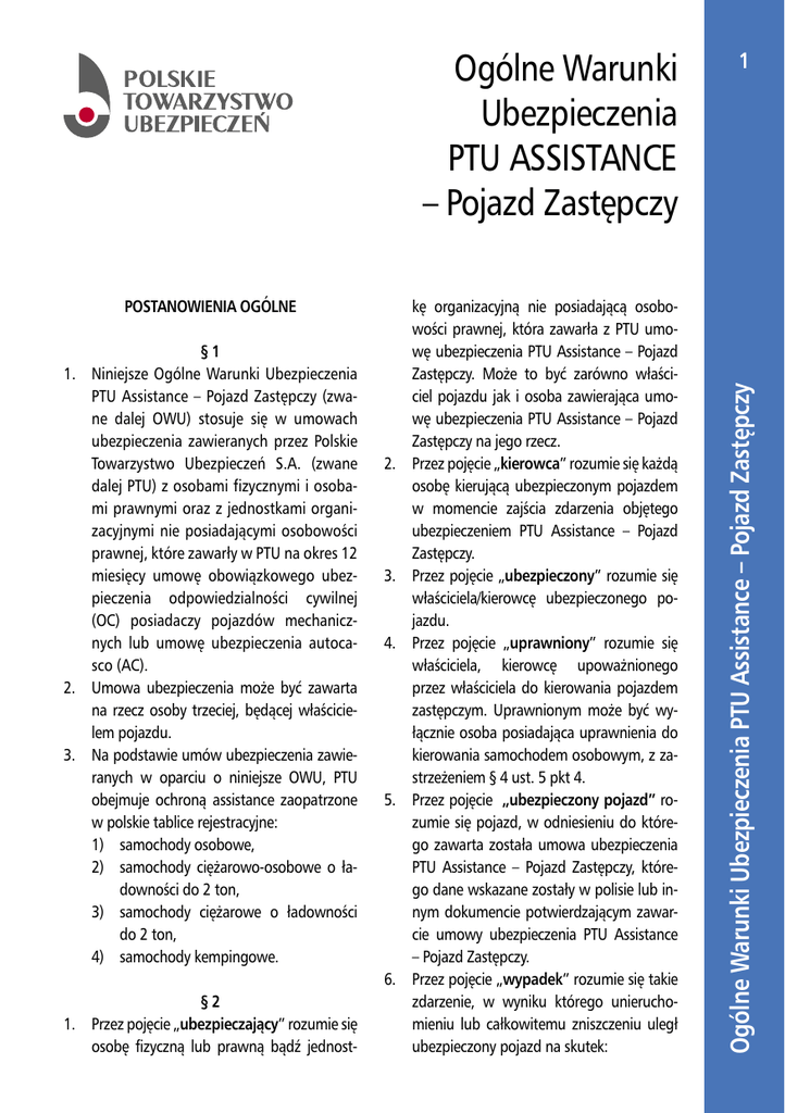 POSTANOWIENIA OGÓLNE §1 1. Niniejsze Ogólne Warunki Ubezpieczenia PTU Assistance – Pojazd Zastępczy (zwane dalej OWU) stosuje się w umowach ubezpieczenia zawieranych przez Polskie Towarzystwo Ubezpieczeń S.A. (zwane dalej PTU) z osobami fizycznymi i osobami prawnymi oraz z jednostkami organizacyjnymi nie posiadającymi osobowości prawnej, które zawarły w PTU na okres 12 miesięcy umowę obowiązkowego ubezpieczenia odpowiedzialności cywilnej (OC) posiadaczy pojazdów mechanicznych lub umowę ubezpieczenia autocasco (AC). 2. Umowa ubezpieczenia może być zawarta na rzecz osoby trzeciej, będącej właścicielem pojazdu. 3. Na podstawie umów ubezpieczenia zawieranych w oparciu o niniejsze OWU, PTU obejmuje ochroną assistance zaopatrzone w polskie tablice rejestracyjne: 1) samochody osobowe, 2) samochody ciężarowo-osobowe o ładowności do 2 ton, 3) samochody ciężarowe o ładowności do 2 ton, 4) samochody kempingowe. 2. 3. 4. 5. 6. §2 1. Przez pojęcie „ubezpieczający” rozumie się osobę fizyczną lub prawną bądź jednost- kę organizacyjną nie posiadającą osobowości prawnej, która zawarła z PTU umowę ubezpieczenia PTU Assistance – Pojazd Zastępczy. Może to być zarówno właściciel pojazdu jak i osoba zawierająca umowę ubezpieczenia PTU Assistance – Pojazd Zastępczy na jego rzecz. Przez pojęcie „kierowca” rozumie się każdą osobę kierującą ubezpieczonym pojazdem w momencie zajścia zdarzenia objętego ubezpieczeniem PTU Assistance – Pojazd Zastępczy. Przez pojęcie „ubezpieczony” rozumie się właściciela/kierowcę ubezpieczonego pojazdu. Przez pojęcie „uprawniony” rozumie się właściciela, kierowcę upoważnionego przez właściciela do kierowania pojazdem zastępczym. Uprawnionym może być wyłącznie osoba posiadająca uprawnienia do kierowania samochodem osobowym, z zastrzeżeniem § 4 ust. 5 pkt 4. Przez pojęcie „ubezpieczony pojazd” rozumie się pojazd, w odniesieniu do którego zawarta została umowa ubezpieczenia PTU Assistance – Pojazd Zastępczy, którego dane wskazane zostały w polisie lub innym dokumencie potwierdzającym zawarcie umowy ubezpieczenia PTU Assistance – Pojazd Zastępczy. Przez pojęcie „wypadek” rozumie się takie zdarzenie, w wyniku którego unieruchomieniu lub całkowitemu zniszczeniu uległ ubezpieczony pojazd na skutek: 1 Ogólne Warunki Ubezpieczenia PTU Assistance – Pojazd Zastępczy Ogólne Warunki Ubezpieczenia PTU ASSISTANCE – Pojazd Zastępczy 2 Ogólne Warunki Ubezpieczenia PTU Assistance – Pojazd Zastępczy 7. 8. 9. 10. 11. 1) nagłego działania siły mechanicznej w momencie zetknięcia się pojazdu z osobami, zwierzętami lub przedmiotami, 2) działania osób trzecich (m.in. aktu wandalizmu lub włamania), 3) pożaru lub wybuchu, wynikających z działania czynnika termicznego lub chemicznego (pochodzącego z zewnątrz lub wewnątrz pojazdu). Przez pojęcie „kradzież” rozumie się działanie sprawcy o znamionach określonych w art. 278 k.k. (kradzież) lub w art. 280 k.k. (rozbój), które doprowadziło do zaboru pojazdu. Przez pojęcia „pojazd unieruchomiony” rozumie się ubezpieczony pojazd, który dopuszczony jest do ruchu i posiada ważne badania techniczne, ale z powodu stanu technicznego w jakim znalazł się w wyniku wypadku, nie może być aktualnie użytkowany na drogach. Przez pojęcie „pojazd zastępczy” rozumie się samochód osobowy klasy A lub B, według standardów podmiotów świadczących usługi wynajmu pojazdów (zwanych dalej agencją), wraz z dokumentami umożliwiającymi jego użytkowanie zgodnie z przeznaczeniem, udostępniany uprawnionemu zgodnie z postanowieniami § 4 OWU w przypadku zajścia zdarzenia objętego ochroną ubezpieczenia PTU Assistance – Pojazd Zastępczy. Przez pojęcie „miejsce zamieszkania właściciela pojazdu” rozumie się adres miejsca zamieszkania/siedziby właściciela pojazdu na terytorium Polski, wpisany do polisy lub innego dokumentu potwierdzającego zawarcie umowy ubezpieczenia PTU Assistance – Pojazd Zastępczy. Przez pojęcie „Centrum Alarmowe PTU” rozumie się firmę organizującą i świadczącą usługi assistance, działającą w imieniu i na zlecenie PTU. PRZEDMIOT I ZAKRES UBEZPIECZENIA §3 1. Przedmiotem ubezpieczenia są wyłącznie koszty świadczenia usług assistance przez PTU na rzecz Ubezpieczonego/Uprawnionego, za pośrednictwem Centrum Alarmowego PTU, na zasadach określonych w niniejszych OWU. 2. Świadczenie usług assistance nie obejmuje wykonania bezpośrednio przez PTU usług wymienionych w OWU, lecz zorganizowanie lub zorganizowanie i pokrycie kosztów tych usług przez PTU. 3. Usługi assistance w ramach PTU Assistance – Pojazd Zastępczy w zakresie: 1) wynajmu pojazdu zastępczego, o którym mowa w §4, świadczone są wyłącznie w przypadku zaistnienia na terytorium Polski wypadku albo kradzieży ubezpieczonego pojazdu zgłoszonych na policji, 2) pomocy informacyjnej, o której mowa w § 5, świadczone są w przypadku zaistnienia wypadku, kradzieży ubezpieczonego pojazdu, a także w razie awarii lub innego zdarzenia losowego na terytorium Polski. §4 Wynajem pojazdu zastępczego 1. Ubezpieczenie PTU Assistance – Pojazd Zastępczy może być zawarte, w zależności od rodzaju szkody i maksymalnego okresu wynajmu pojazdu zastępczego, w następujących wariantach: 1) wariant PZ3 - w razie wypadku - 3 dni wynajmu pojazdu, 2) wariant PZ7 - w razie wypadku lub kradzieży - 7 dni wynajmu pojazdu, 3) wariant PZ14 - w razie wypadku lub kradzieży - 14 dni wynajmu pojazdu. 2. W odniesieniu do jednego zdarzenia, z jednej umowy ubezpieczenia, przysługuje tylko jeden pojazd zastępczy. 1) uprzednie wykonanie holowania (transportu) unieruchomionego pojazdu, zorganizowanego i opłaconego przez Centrum Alarmowe PTU w ramach ubezpieczenia PTU Assistance I albo PTU Assistance II (warunek ten nie dotyczy kradzieży pojazdu), 2) umożliwienie Centrum Alarmowemu PTU prze