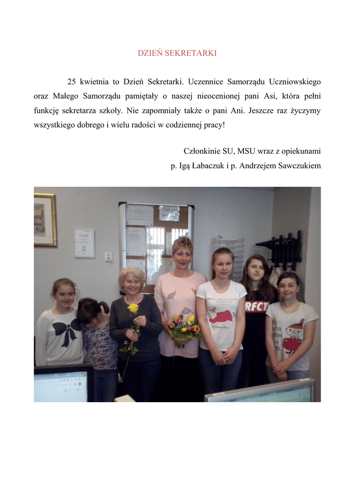 DZIEŃ SEKRETARKI 25 kwietnia to Dzień Sekretarki. Uczennice Samorządu Uczniowskiego oraz Małego Samorządu pamiętały o naszej nieocenionej pani Asi, która pełni funkcję sekretarza szkoły. Nie zapomniały także o pani Ani. Jeszcze raz życzymy wszystkiego dobrego i wielu radości w codziennej pracy! Członkinie SU, MSU wraz z opiekunami p. Igą Łabaczuk i p. Andrzejem Sawczukiem