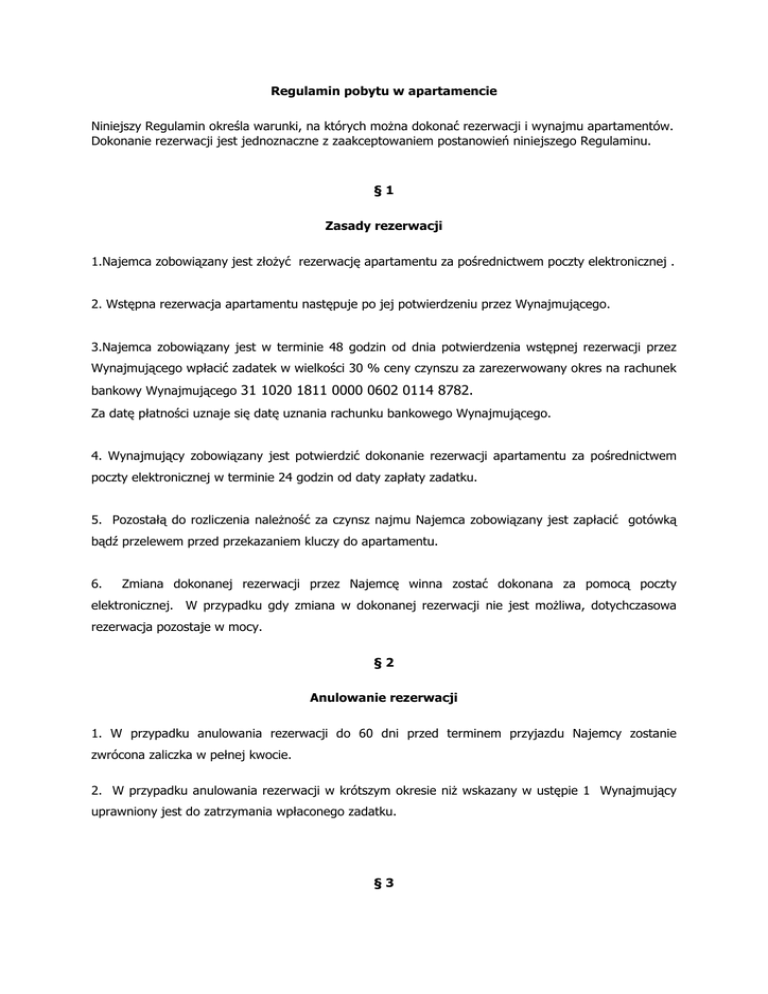 Regulamin pobytu w apartamencie Niniejszy Regulamin określa warunki, na których moŜna dokonać rezerwacji i wynajmu apartamentów. Dokonanie rezerwacji jest jednoznaczne z zaakceptowaniem postanowień niniejszego Regulaminu. §1 Zasady rezerwacji 1.Najemca zobowiązany jest złoŜyć rezerwację apartamentu za pośrednictwem poczty elektronicznej . 2. Wstępna rezerwacja apartamentu następuje po jej potwierdzeniu przez Wynajmującego. 3.Najemca zobowiązany jest w terminie 48 godzin od dnia potwierdzenia wstępnej rezerwacji przez Wynajmującego wpłacić zadatek w wielkości 30 % ceny czynszu za zarezerwowany okres na rachunek bankowy Wynajmującego 31 1020 1811 0000 0602 0114 8782. Za datę płatności uznaje się datę uznania rachunku bankowego Wynajmującego. 4. Wynajmujący zobowiązany jest potwierdzić dokonanie rezerwacji apartamentu za pośrednictwem poczty elektronicznej w terminie 24 godzin od daty zapłaty zadatku. 5. Pozostałą do rozliczenia naleŜność za czynsz najmu Najemca zobowiązany jest zapłacić gotówką bądź przelewem przed przekazaniem kluczy do apartamentu. 6. Zmiana dokonanej rezerwacji przez Najemcę winna zostać dokonana za pomocą poczty elektronicznej. W przypadku gdy zmiana w dokonanej rezerwacji nie jest moŜliwa, dotychczasowa rezerwacja pozostaje w mocy. §2 Anulowanie rezerwacji 1. W przypadku anulowania rezerwacji do 60 dni przed terminem przyjazdu Najemcy zostanie zwrócona zaliczka w pełnej kwocie. 2. W przypadku anulowania rezerwacji w krótszym okresie niŜ wskazany w ustępie 1 Wynajmujący uprawniony jest do zatrzymania wpłaconego zadatku. §3 Ceny 1. Podana w cenniku apartamentu cena jest ceną brutto i obejmuje: a) Pobyt w apartamencie maksymalnej ustalonej ilości osób za jedną dobę, b) Koszt zuŜytych przez Wynajmującego mediów (energia, woda, ogrzewanie), o ile nie jest to zuŜycie w wyraźnym stopniu nadmierne. §4 Przekazanie przedmiotu najmu 1.Apartament wynajmowany jest na doby. Doba rozpoczyna się o godz. 13-tej, a kończy o godz. 11tej dnia następnego. Meldowanie w apartamencie odbywa się do godz. 18. W przypadku późniejszego przyjazdu Najemcy konieczne jest uprzednie zgłoszenie tego faktu pod numerem +48 601 693 693 . 2. Najemca wspólnie z przedstawicielem Wynajmującego uda się do apartamentu i na miejscu dokona jego przyjęcia, m.in. poprzez sprawdzenie stanu zastanego ze spisem inwentarza. 3. Przekazanie kluczy przedstawicielowi Wynajmującego odbywa się zawsze w apartamencie. §5 Zasady korzystania z przedmiotu najmu 1. W apartamencie mogą przebywać maksymalnie 4 osoby. 2.W apartamencie zabronione jest palenie tytoniu oraz wprowadzanie zwierząt. KaŜdy z Klientów zobowiązuje się do przestrzegania tych zaleceń, poszanowania mienia Właściciela oraz przestrzegania ogólnie przyjętego porządku publicznego. 3.W apartamencie obowiązuje cisza nocna od godz. 22 do godz. 6 dnia następnego. W przypadku naruszenia ciszy nocnej Wynajmujący uprawniony jest do rozwiązania umowy ze skutkiem natychmiastowym z zachowaniem wszelkich wpłaconych przez Najemcę kwot z tytułu najmu apartamentu. 3. W przypadku przekroczenia ilości zamieszkujących osób, stwierdzenia dewastacji lub raŜącego naruszania porządku publicznego, Wynajmujący ma prawo rozwiązać umowę ze skutkiem natychmiastowym. W takim przypadku Wynajmujący uprawniony jest do zatrzymania wszelkich wpłaconych przez Najemcę kwot z tytułu Najmu. 4. Najemca zobowiązany jest do naleŜytego zabezpieczenia apartamentu, przez co jest rozumiane dokładne zamykanie drzwi wejściowych i okien przy kaŜdorazowym jego opuszczeniu oraz staranne przechowywanie kluczy bez dostępu do nich osób trzecich a nadto zachowanie w tajemnicy kodów wejściowych do budynku oraz na teren osiedla. 5. JeŜeli w trakcie pobytu Najemcy dojdzie z jego winy do uszkodzenia lub zaginięcia części wyposaŜenia apartamentu, Wynajmujący zastrzega sobie prawo dochodzenia od Najemcy odszkodowania na pokrycie powstałych strat. 6.Najemca moŜe odmówić wynajęcia apartamentu Najemcy, który podczas poprzedniego pobytu w apartamencie raŜąco naruszył regulamin, wyrządził szkodę w mieniu Wynajmującego, szkodę na osobie innego Najemcy lub pracownika Wynajmującego albo teŜ w inny sposób zakłócił pobyt innych Najemców, , współlokatorów budynku lub sprawne funkcjonowanie apartamentów. 7.Wynajmujący nie ponosi odpowiedzialności za utratę mienia Najemcy znajdującego się w apartamencie, pomieszczeniach do niego przynaleŜnych, garaŜach itp.