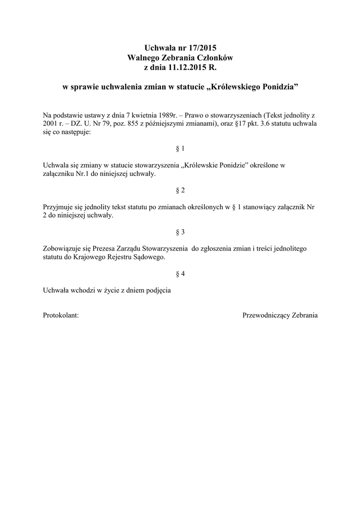 Uchwała nr 17/2015 Walnego Zebrania Członków z dnia 11.12.2015 R. w sprawie uchwalenia zmian w statucie „Królewskiego Ponidzia” Na podstawie ustawy z dnia 7 kwietnia 1989r. – Prawo o stowarzyszeniach (Tekst jednolity z 2001 r. – DZ. U. Nr 79, poz. 855 z późniejszymi zmianami), oraz §17 pkt. 3.6 statutu uchwala się co następuje: §1 Uchwala się zmiany w statucie stowarzyszenia „Królewskie Ponidzie” określone w załączniku Nr.1 do niniejszej uchwały. §2 Przyjmuje się jednolity tekst statutu po zmianach określonych w § 1 stanowiący załącznik Nr 2 do niniejszej uchwały. §3 Zobowiązuje się Prezesa Zarządu Stowarzyszenia do zgłoszenia zmian i treści jednolitego statutu do Krajowego Rejestru Sądowego. §4 Uchwała wchodzi w życie z dniem podjęcia Protokolant: Przewodniczący Zebrania Załącznik Nr 1 do uchwały nr 17/2015 z dnia 11.12.2015 r. w sprawie uchwalenia zmian w statucie „Królewskiego Ponidzia” 1. w § 1 pkt. 2 dodaje się następujące cele: 2.11). działalność wśród dzieci i młodzieży w zakresie oświaty, wychowania, nauki i techniki, kultury fizycznej i sportu 2. § 17 pkt. 3 otrzymuje brzmienie: 3. Do kompetencji Walnego Zebrania Członków należy w szczególności: 3.1) uchwalanie kierunków i programu działania Stowarzyszenia, 3.2) wybór członków Zarządu, Rady i Komisji Rewizyjnej z zastrz. § 18 ust. 2 oraz § 20 ust.2 3.3) odwołanie członków Zarządu, Rady i Komisji Rewizyjnej, 3.4) rozpatrywanie i zatwierdzanie sprawozdań Zarządu, Rady i Komisji Rewizyjnej, w szczególności dotyczących projektów realizowanych w ramach LSR, 3.5) udzielanie absolutorium ustępującemu Zarządowi, 3.6) uchwalanie zmian Statutu, 3.7) podejmowanie uchwał w sprawie przystąpienia Stowarzyszenia do innych organizacji lub związków organizacji, 3.8) podejmowanie uchwały w sprawie rozwiązania Stowarzyszenia, 3.9) rozpatrywanie odwołań od uchwał Zarządu, wniesionych przez członków Stowarzyszenia, lub wnioskodawców i beneficjentów działania PROW 3.10) uchwalanie Regulaminu Pracy Rady. 3.11) uchwalenie Regulaminu Pracy Zarządu 3.12) opiniowanie projektu LSR opracowanej przez Zarząd, 3.13) przyznawanie członkom władz Stowarzyszenia wymienionych w § 1 5 ust.1 pkt. 1.2, 1.3 i 1.4 wykonującym bieżące zadania statutowe i organizacyjne diety ryczałtowej. 3.14) ustalanie wysokości składek członkowskich 3. § 18 pkt. 4 ppkt.4.6 otrzymuje brzmienie: 4.6) opracowanie, aktualizowanie oraz podejmowanie uchwał w sprawie LSR, oraz innych wymaganych przepisami PROW dokumentów, celem przystąpienia do konkursu na realizację LSR 4. z § 18 pkt 4 usuwa się ppkt. 4.15 i 4.16 5. § 19 otrzymuje brzmienie: 1. Rada jest wybierana przez walne zgromadzenie członków LGD spośród członków tego zebrania. 2. Liczba członków Rady jest ustalana przez Walne Zebranie Członków, z zastrzeżeniem ust. 3. 3. W skład Rady wchodzą przedstawiciele sektora społecznego, gospodarczego, publicznego oraz lokalni mieszkańcy w proporcjach zgodnych z artykułem 32 ust. 2 lit b) rozporządzenia Parlamentu Europejskiego i Rady (UE) nr 1303/2013 z uwzględnieniem proporcji wynikających ze składu członków LGD, z zastrzeżeniem ust. 4 i 5. 4. Na poziomie podejmowania decyzji dotyczących wyboru operacji do finansowania w ramach LSR co najmniej połowę członków Rady stanowią partnerzy reprezentujący podmioty nie będące instytucjami sektora finansów publicznych. 5. Do kompetencji Rady należy wybór operacji oraz ustalanie kwoty wsparcia zgodnie z art. 34 ust. 3 rozporządzenia Parlamentu Europejskiego i Rady (UE) nr 1303/2013 z dnia 17 grudnia 2013 r. 6. W skład Rady wchodzą przedstawiciele każdej z gmin wymienionych w § 5 ust.2 w równych proporcjach tj. po 1 osobie z obszaru każdej gminy 7. Wybór operacji o których mowa w ust. 5 dokonywany jest w formie uchwały Rady, podjętej bezwzględną większością głosów przy obecności co najmniej połowy członków uprawnionych do głosowania. Załącznik Nr 2 do Uchwały Nr 17/2015 z dnia 11.12.2015 r. w sprawie uchwalenia zmian w statucie „Królewskiego Ponidzia” STATUT STOWARZYSZENIA „Królewskie Ponidzie” (tekst jednolity) Rozdział I Postanowienia ogólne i cele działania §1 1. Stowarzyszenie posiada osobowość prawną i działa na podstawie przepisów ustawy z dnia 7 kwietnia 1989 r. Prawo o stowarzyszeniach (Dz. U. z 2001 r. Nr 79, poz. 855 z późn. zm.) ustawy z dnia 20 lutego 2015 r. o wspieraniu rozwoju obszarów wiejskich z udziałem środków Europejskiego Funduszu Rolnego na rzecz Rozwoju Obszarów Wiejskich w ramach Programu Rozwoju Obszarów Wiejskich na lata 2014–2020 (Dz. U. z 2015 r. poz. 349); ustawy z dnia 20 lutego 2015 r. o rozwoju lokalnym z udziałem lokalnej społeczności (Dz. U. z 2015 r. poz. 378); oraz niniejszego Statutu. 2. Stowarzyszenie „Królewskie Ponidzie” działając jako Lokalna Grupa Działania (LGD) jest partnerstwem trójsektorowym, składającym się z przedstawicieli sektora publicznego, gospodarczego i społecznego. LGD jest dobrowolnym, samorządnym, trwałym zrzeszeniem osób fizycznych i osób prawnych, w tym jednostek samorządu terytorialnego, mającym na celu działanie na rzecz rozwoju obszarów wiejskich, a w szczególności: 2.1) opracowanie i realizację Lokalnej Strategii Rozwoju (LSR) w rozumieniu ustawy z dnia 20 lutego 2015 r. o wspieraniu rozwoju obszarów wiejskich z udziałem środków Europejskiego Funduszu Rolnego na rzecz Rozwoju Obszarów Wiejskich w ramach Programu Rozwoju Obszarów Wiejskich na lata 2014–2020, przepisów wykonawczych do tej ustawy oraz przepisów Programu Rozwoju Obszarów Wiejskich 2014-2020, 2.2) podejmowanie inicjatyw i działań mających na celu pobudzenie aktywności społeczności lokalnych oraz ich czynny udział w opracowywaniu i realizacji LSR, 2.3) upowszechnianie i wymianę informacji o inicjatywach związanych z aktywizacją ludności na obszarach wiejskich położon