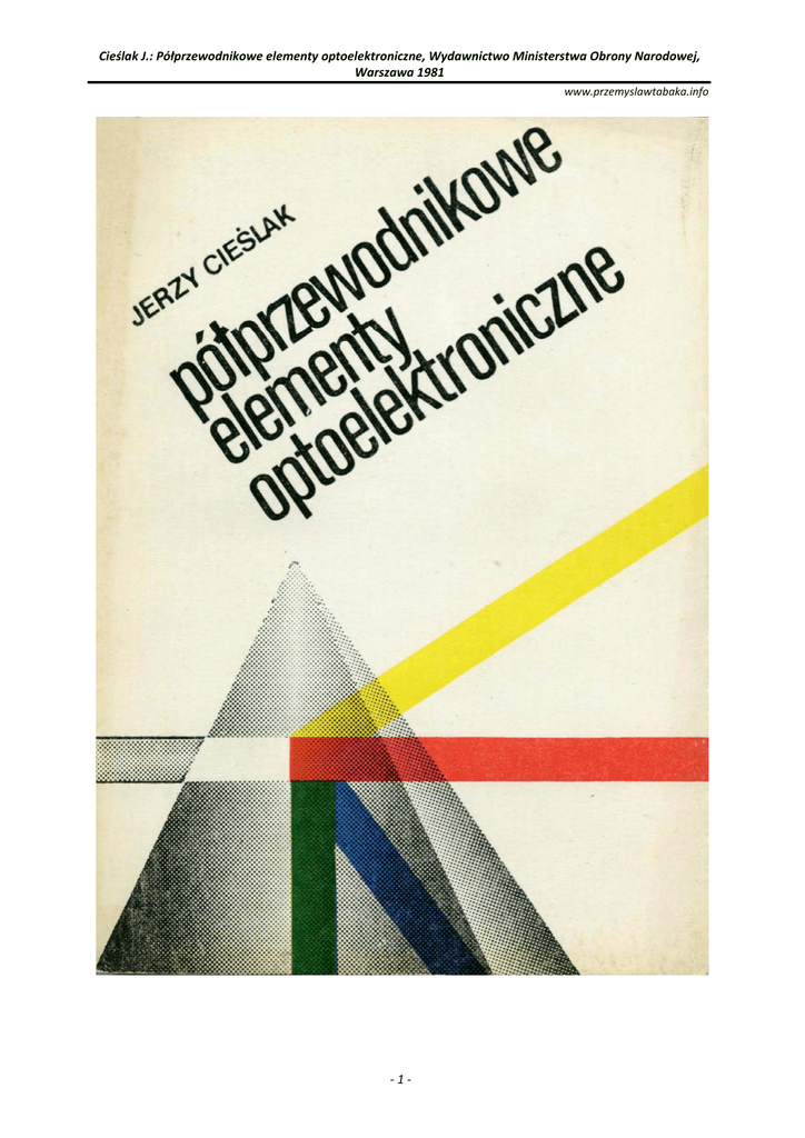 Cieślak J.: Półprzewodnikowe elementy optoelektroniczne, Wydawnictwo Ministerstwa Obrony Narodowej, Warszawa 1981 www.przemyslawtabaka.info Przemysław Tabaka ‐1‐ Cieślak J.: Półprzewodnikowe elementy optoelektroniczne, Wydawnictwo Ministerstwa Obrony Narodowej, Warszawa 1981 www.przemyslawtabaka.info SPIS TREŚCI Przedmowa Wykaz ważniejszych oznaczeń stosowanych w książce 1. WIADOMOŚCI PODSTAWOWE 1.1. Wstęp 1.2. Zjawiska i pojęcia ogólne 1.3. Rekombinacja promienista i niepromienista 1.4. Absorpcja promieniowania w półprzewodnikach 1.5. Elektroluminescencja 1.6. Emisja wymuszona i spontaniczna 1.7. Zjawiska fotoelektryczne 1.8. Podstawowe parametry i wielkości charakterystyczne 1.8.1. Parametry emisyjne 1.8.2. Parametry fotoelektryczne 1.8.3. Inne parametry i charakterystyki 2. PÓŁPRZEWODNIKOWE ŹRÓDŁA PROMIENIOWANIA (FOTOEMITERY PÓŁPRZEWODNIKOWE) 2.1. Fotoemitery dyskretne 2.1.1. Diody elektroluminescencyjne (DEL) 2.1.1.1. DEL emitujące promieniowanie widzialne 2.1.1.2. DEL emitujące promieniowanie podczerwone 2.1.2. Lasery półprzewodnikowe 2.1.2.1. Lasery heterozłączowe 2.1.2.2. Złączowe diody laserowe 2.1.2.3. Lasery paskowe 2.1.2.4. Laser DH z paskiem zagrzebanym 2.1.2.5. Laser TJS z paskiem poprzecznym (W. Suzukiego) 2.1.2.6. Laser paskowy CSP planarny z kanałem w podłożu (K. Aikiego) 2.1.2.7. Zastosowania laserów półprzewodnikowych 2.2. Fotoemitery scalone 2.2.1. Półprzewodnikowe wskaźniki cyfrowe (PWC) 2.2.2. Półprzewodnikowe wskaźniki alfanumeryczne 2.2.3. Półprzewodnikowe oświetlacze elektroluminescencyjne 2.3. Perspektywy rozwoju i zastosowań fotoemiterów 3. PÓŁPRZEWODNIKOWE DETEKTORY PROMIENIOWANIA (FOTODETEKTORY PÓŁPRZEWODNIKOWE) 3.1. Fotodetektory dyskretne 3.1.1. Fotorezystory 3.1.2. Ogniwa fotoelektryczne (fotoogniwa) 3.1.3. Fotodiody ‐2‐ 7 9 13 13 20 28 34 36 40 46 53 53 61 65 69 71 71 76 90 104 104 105 112 113 115 116 116 119 119 138 147 151 153 156 156 164 178 Cieślak J.: Półprzewodnikowe elementy optoelektroniczne, Wydawnictwo Ministerstwa Obrony Narodowej, Warszawa 1981 www.przemyslawtabaka.info 3.1.3.1. Fotodiody p‐i‐n 3.1.3.2. Fotodiody lawinowe 3.1.4. Fototranzystory 3.1.5. Fototyrystory 3.2. Fotodetektory scalone 3.2.1. Fotodetektory segmentowe 3.2.2. Matryce fotodetektorów 3.3. Zastosowania fotodetektorów 4. TRANSOPTORY 4.1. Budowa i charakterystyki transoptorów 4.2. Parametry i schematy transoptorów 4.3. Fotodarlington 4.4. Transoptory wielokanałowe 4.5. Transoptory refleksyjne i szczelinowe 4.6. Przegląd konstrukcji transoptorów 4.7. Przykłady zastosowań transoptorów Wykaz literatury ‐3‐ 190 199 208 220 227 228 231 239 241 241 246 251 253 255 257 270 286
