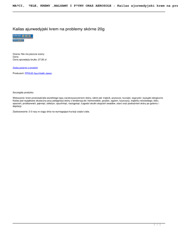 MA?CI, ?ELE, KREMY ,BALSAMY I P?YNY ORAZ AEROZOLE : Kailas ajurwedyjski krem na pro Kailas ajurwedyjski krem na problemy skórne 20g Ocena: Nie ma jeszcze oceny Cena Cena sprzedaży brutto: 27,50 zł Zadaj pytanie o produkt Producent: PPHUD AyurVedik Jawor Szczegóły produktu Wskazania: krem przeciwdziała wszelkiego typu zanieczyszczeniom skóry, takim jak: trądzik, pryszcze, kurzajki, wypryski i wysypki alergiczne. Kailas jest wyjątkowo skuteczny przy pielęgnacji skóry z tendencją do: hemoroidów, grzybic, egzem, łuszczycy, trądziku różowatego, bólu, oparzeń, przebarwień, pęknięć, odleżyn, opuchnięć, naciągnięć. Łagodzi skutki ukąszeń owadów, otarć oraz podrażnień skóry po goleniu i depilacji. Zastosowanie: 2-3 razy w ciągu dnia na wymagające kuracji części ciała. 1 / 1 Powered by TCPDF (www.tcpdf.org)