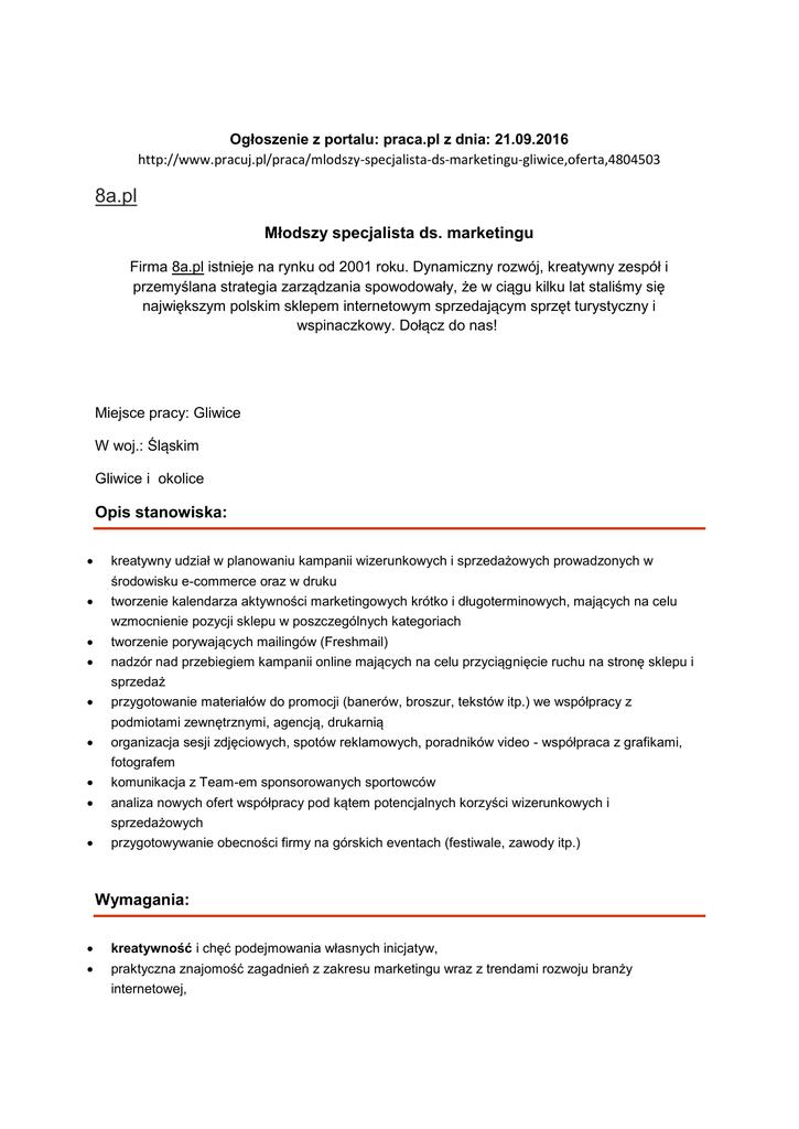 Ogłoszenie z portalu: praca.pl z dnia: 21.09.2016 http://www.pracuj.pl/praca/mlodszy-specjalista-ds-marketingu-gliwice,oferta,4804503 8a.pl Młodszy specjalista ds. marketingu Firma 8a.pl istnieje na rynku od 2001 roku. Dynamiczny rozwój, kreatywny zespół i przemyślana strategia zarządzania spowodowały, że w ciągu kilku lat staliśmy się największym polskim sklepem internetowym sprzedającym sprzęt turystyczny i wspinaczkowy. Dołącz do nas! Miejsce pracy: Gliwice W woj.: Śląskim Gliwice i okolice Opis stanowiska: kreatywny udział w planowaniu kampanii wizerunkowych i sprzedażowych prowadzonych w środowisku e-commerce oraz w druku tworzenie kalendarza aktywności marketingowych krótko i długoterminowych, mających na celu wzmocnienie pozycji sklepu w poszczególnych kategoriach tworzenie porywających mailingów (Freshmail) nadzór nad przebiegiem kampanii online mających na celu przyciągnięcie ruchu na stronę sklepu i sprzedaż przygotowanie materiałów do promocji (banerów, broszur, tekstów itp.) we współpracy z podmiotami zewnętrznymi, agencją, drukarnią organizacja sesji zdjęciowych, spotów reklamowych, poradników video - współpraca z grafikami, fotografem komunikacja z Team-em sponsorowanych sportowców analiza nowych ofert współpracy pod kątem potencjalnych korzyści wizerunkowych i sprzedażowych przygotowywanie obecności firmy na górskich eventach (festiwale, zawody itp.) Wymagania: kreatywność i chęć podejmowania własnych inicjatyw, praktyczna znajomość zagadnień z zakresu marketingu wraz z trendami rozwoju branży internetowej, bardzo dobra znajomość serwisów społecznościowych i zagadnień związanych z wykorzystaniem social media w marketingu, znajomość programu do tworzenia oraz wysyłki newsletterów (FreshMail lub podobny), doskonałe zdolności organizacyjne, umiejętność zarządzania czasem i pracą nad kilkoma projektami jednocześnie wykształcenie wyższe doświadczenie na podobnym stanowisku (sklep internetowy lub agencja reklamowa), znajomość rynku outdoor będzie dużym atutem komunikatywność i zdolności interpersonalne Oferujemy: pracę w stabilnej firmie o ugruntowanej pozycji na rynku, atrakcyjne wynagrodzenie adekwatne do umiejętności i zaangażowania, pracę w dynamicznie rozwijającej się branży, możliwość rozwoju oraz doskonalenia już zdobytych umiejętności, nowoczesne biuro w atrakcyjnej lokalizacji – Nowe Gliwice Zainteresowane osoby prosimy o składnie dokumentów poprzez „Aplikuj” Prosimy o dołączenie zgody na przetwarzanie danych osobowych8a.pl celu przeprowadzenia procesu rekrutacji. Uprzejmie informujemy, że skontaktujemy się tylko z wybranymi osobami. Aplikuj na stronie: https://www.pracuj.pl/aplikuj/Home/FirstStep?oid=4804503