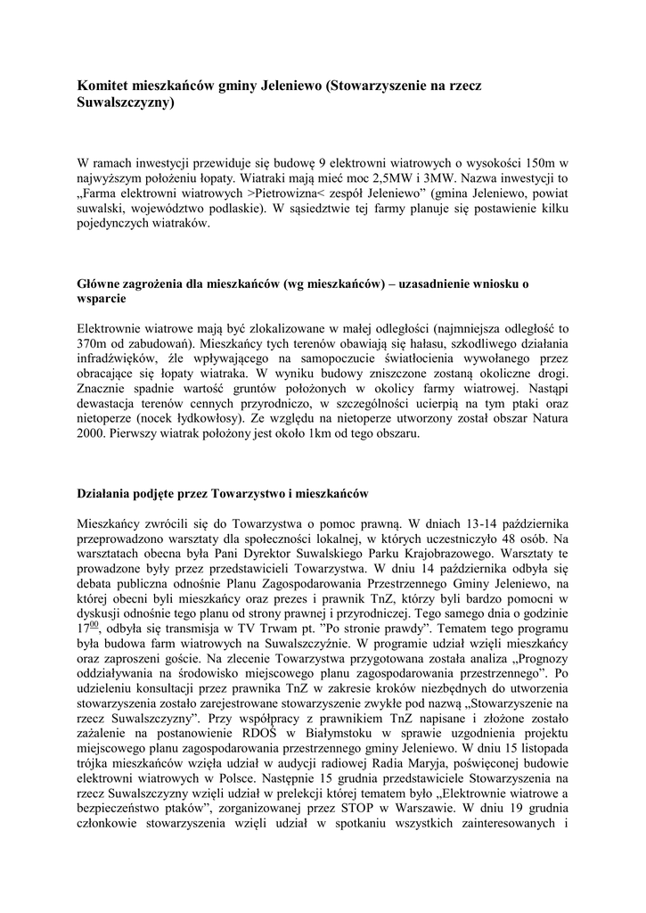 Komitet mieszkańców gminy Jeleniewo (Stowarzyszenie na rzecz Suwalszczyzny) W ramach inwestycji przewiduje się budowę 9 elektrowni wiatrowych o wysokości 150m w najwyższym położeniu łopaty. Wiatraki mają mieć moc 2,5MW i 3MW. Nazwa inwestycji to „Farma elektrowni wiatrowych >Pietrowizna< zespół Jeleniewo” (gmina Jeleniewo, powiat suwalski, województwo podlaskie). W sąsiedztwie tej farmy planuje się postawienie kilku pojedynczych wiatraków. Główne zagrożenia dla mieszkańców (wg mieszkańców) – uzasadnienie wniosku o wsparcie Elektrownie wiatrowe mają być zlokalizowane w małej odległości (najmniejsza odległość to 370m od zabudowań). Mieszkańcy tych terenów obawiają się hałasu, szkodliwego działania infradźwięków, źle wpływającego na samopoczucie światłocienia wywołanego przez obracające się łopaty wiatraka. W wyniku budowy zniszczone zostaną okoliczne drogi. Znacznie spadnie wartość gruntów położonych w okolicy farmy wiatrowej. Nastąpi dewastacja terenów cennych przyrodniczo, w szczególności ucierpią na tym ptaki oraz nietoperze (nocek łydkowłosy). Ze względu na nietoperze utworzony został obszar Natura 2000. Pierwszy wiatrak położony jest około 1km od tego obszaru. Działania podjęte przez Towarzystwo i mieszkańców Mieszkańcy zwrócili się do Towarzystwa o pomoc prawną. W dniach 13-14 października przeprowadzono warsztaty dla społeczności lokalnej, w których uczestniczyło 48 osób. Na warsztatach obecna była Pani Dyrektor Suwalskiego Parku Krajobrazowego. Warsztaty te prowadzone były przez przedstawicieli Towarzystwa. W dniu 14 października odbyła się debata publiczna odnośnie Planu Zagospodarowania Przestrzennego Gminy Jeleniewo, na której obecni byli mieszkańcy oraz prezes i prawnik TnZ, którzy byli bardzo pomocni w dyskusji odnośnie tego planu od strony prawnej i przyrodniczej. Tego samego dnia o godzinie 1700, odbyła się transmisja w TV Trwam pt. ”Po stronie prawdy”. Tematem tego programu była budowa farm wiatrowych na Suwalszczyźnie. W programie udział wzięli mieszkańcy oraz zaproszeni goście. Na zlecenie Towarzystwa przygotowana została analiza „Prognozy oddziaływania na środowisko miejscowego planu zagospodarowania przestrzennego”. Po udzieleniu konsultacji przez prawnika TnZ w zakresie kroków niezbędnych do utworzenia stowarzyszenia zostało zarejestrowane stowarzyszenie zwykłe pod nazwą „Stowarzyszenie na rzecz Suwalszczyzny”. Przy współpracy z prawnikiem TnZ napisane i złożone zostało zażalenie na postanowienie RDOŚ w Białymstoku w sprawie uzgodnienia projektu miejscowego planu zagospodarowania przestrzennego gminy Jeleniewo. W dniu 15 listopada trójka mieszkańców wzięła udział w audycji radiowej Radia Maryja, poświęconej budowie elektrowni wiatrowych w Polsce. Następnie 15 grudnia przedstawiciele Stowarzyszenia na rzecz Suwalszczyzny wzięli udział w prelekcji której tematem było „Elektrownie wiatrowe a bezpieczeństwo ptaków”, zorganizowanej przez STOP w Warszawie. W dniu 19 grudnia członkowie stowarzyszenia wzięli udział w spotkaniu wszystkich zainteresowanych i zaangażowanych przeciw wiatrakom w Brańszczyku koło Warszawy, celem spotkania było utworzenie ogólnopolskiego porozumienia dotyczącego budowy elektrowni wiatrowych blisko zabudowań. Kontakt z grupą: Stowarzyszenie na rzecz Suwalszczyzny; Suchodoły 8, 16-404 Jeleniewo; tel. 0-87 5683111, 504670823; e-mail: [email protected]
