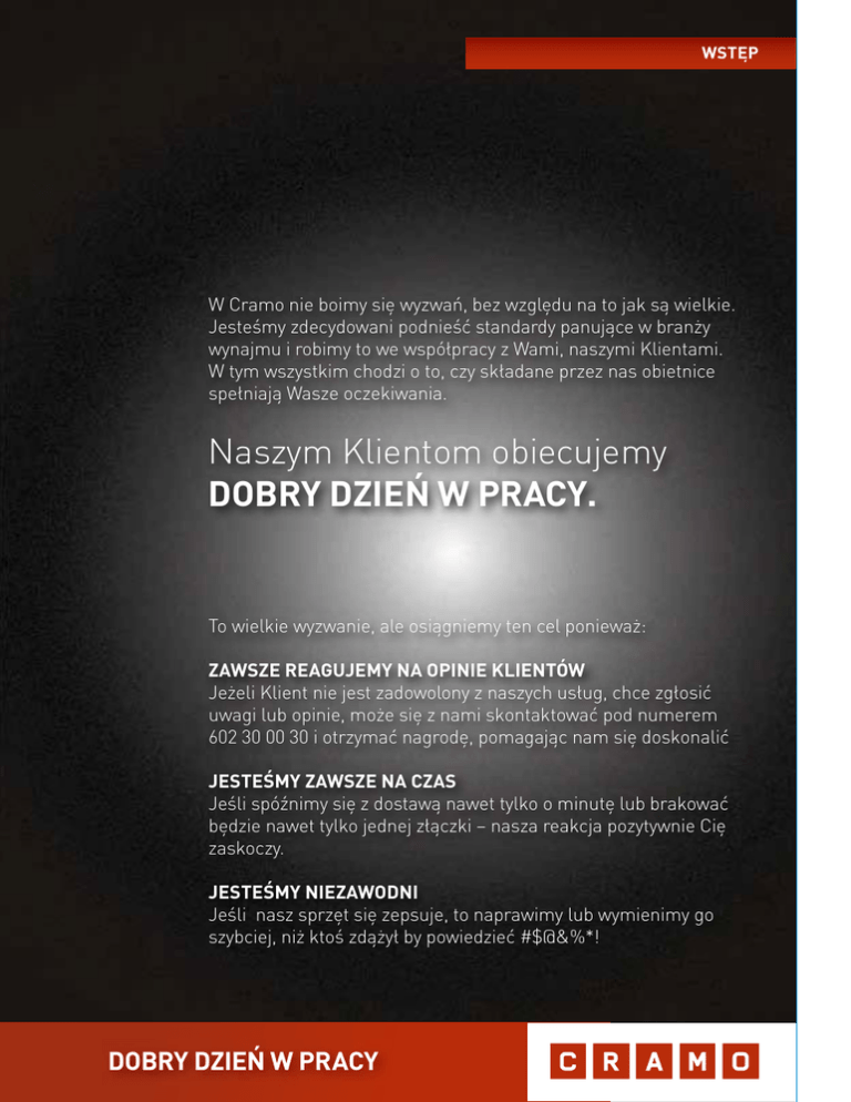 WSTĘP W Cramo nie boimy się wyzwań, bez względu na to jak są wielkie. Jesteśmy zdecydowani podnieść standardy panujące w branży wynajmu i robimy to we współpracy z Wami, naszymi Klientami. W tym wszystkim chodzi o to, czy składane przez nas obietnice spełniają Wasze oczekiwania. Naszym Klientom obiecujemy DOBRY DZIEŃ W PRACY. To wielkie wyzwanie, ale osiągniemy ten cel ponieważ: ZAWSZE REAGUJEMY NA OPINIE KLIENTÓW Jeżeli Klient nie jest zadowolony z naszych usług, chce zgłosić uwagi lub opinie, może się z nami skontaktować pod numerem 602 30 00 30 i otrzymać nagrodę, pomagając nam się doskonalić JESTEŚMY ZAWSZE NA CZAS Jeśli spóźnimy się z dostawą nawet tylko o minutę lub brakować będzie nawet tylko jednej złączki – nasza reakcja pozytywnie Cię zaskoczy. JESTEŚMY NIEZAWODNI Jeśli nasz sprzęt się zepsuje, to naprawimy lub wymienimy go szybciej, niż ktoś zdążył by powiedzieć #$@&%*! DOBRY DZIEŃ W PRACY 1 WYMAGANE DOKUMENTY WYMAGANE DOKUMENTY PRZEDSIĘBIORCY Spółki prawa handlowego (jawna, komandytowa, partnerska, akcyjna, z ograniczoną odpowiedzialnością): oryginał aktualnego odpisu z rejestru przedsiębiorców bądź rejestru sądowego regon NIP SPÓŁDZIELNIE, PRZEDSIĘBIORSTWA PAŃSTWOWE aktualny oryginał wpisu do właściwych rejestrów regon NIP SPÓŁKI CYWILNE ORAZ OSOBY PROWADZĄCE DZIAŁALNOŚĆ GOSPODARCZĄ aktualne wpisy każdego ze wspólników REGON NIP Jeżeli odbiór dokonywany jest przez osoby nie wymienione w dokumentach rejestrowych, wymagane jest pisemne upoważnienie do zawarcia umowy i odbioru jej przedmiotu. Pełnomocnik zobowiązany jest do przedłożenia dowodu osobistego w celu sprawdzenia jego tożsamości. KLIENCI INDYWIDUALNI nie prowadzący działalności gospodarczej: dowód osobisty i dodatkowo drugi dokument ze zdjęciem potwierdzenie zamieszkania w miejscu zameldowania w postaci rachunku za ostatni miesiąc (np. rachunek za gaz, telefon, energię elektryczną) PRZY WYPOŻYCZANIU WYNAJMUJĄCY POZOSTAWIA DEPOZYT, O WYSOKOŚCI KTÓREGO, DECYDUJE WARTOŚĆ WYPOŻYCZANEJ MASZYNY ORAZ OKRES CZASU NA JAKI JEST ONA WYNAJMOWANA. Podstawowe warunki najmu sprzętu budowlanego: kwoty naliczane są bez niedziel i świąt. Ceny podane są w PLN za jedną dobę najmu wysokość stawki dziennej jest regulowana w zależności od długości najmu zgodnie z cennikiem oraz przyznanymi rabatami czynsz według stawki dobowej oznacza zwrot przed upływem 24 godzin. Zdanie maszyny po upływie 24 godzin powoduje naliczenie kolejnej stawki przy wynajmie na jeden dzień roboczy przetrzymanie maszyny przez niedzielę, czy dni świąteczne nie powoduje zmiany stawki najmu szczegółowe warunki najmu są przedstawione na umowie najmu. Cennik obowiązuje od 1 stycznia 2016. Dotychczasowe cenniki tracą ważność. Niniejszy katalog nie stanowi ofert handlowej w rozumieniu art. 66 §1 kodeksu cywilnego oraz innych właściwych przepisów prawnych. 2 SPIS TREŚCI SPIS TREŚCI PRACE ZIEMNE Koparki Ładowarki Zamiatarki Walce Zagęszczarki 4 5 6 6 8 10 OBRÓBKA BETONU Betoniarki Buławy Wibratory do betonu Wozidła Zacieraczki Listwy wibracyjne 12 13 14 15 15 16 17 SPRĘŻARKI, MŁOTY, WIERTARKI Sprężarki Młoty Wiertarki 20 21 22 24 PRĄD, SPAWANIE Agregaty Spawarki 26 27 29 OGRZEWANIE, POMPOWANIE Ogrzewacze Osuszacze Klimatyzatory Pompy 30 31 34 34 34 CIĘCIE, SZLIFOWANIE, POMIAR, CZYSZCZENIE Pilarki Bruzdownice Przecinarki Piły Przecinarki Szlifierki Giętarki 36 37 38 38 39 40 41 43 Gilotyny Frezarki Myjki Odkurzacze Niwelatory 43 44 45 45 45 TRANSPORT PIONOWY, DRABINY Transportery Zsypy Wciągarki Żuraw Drabiny Wieże jezdne 46 47 47 47 48 49 50 INFRASTRUKTURA PLACU BUDOWY 52 Systemy kontenerowe 53 PODESTY RUCHOME Wprowadzenie Użytkowanie Kontrola podestu Podesty nożycowe elektryczne Podesty nożycowe spalinowe Podesty teleskopowe elektryczne Podesty teleskopowe spalinowe Podesty teleskopowe zamontowane na przyczepie 58 59 60 61 62 63 64 70 AKCESORIA 74 72 3 prace Ziemne prace Ziemne Koparki 5 Ładowarki 6 Zamiatarki 6 Walce 8 Zagęszczarki 10 4 www.cramo.pl PRACE ZIEMNE KOPARKI MINIKOPARKA KUBOTA KX41-3V, TAKEUCHI TB0116A, YANMAR SV17 I SV18 2113113 masa 1.400 -1.900 kg; średnie spalanie 3 l/h; głębokość kopania 2,2 m-2,6 m 1 dzień netto brutto 2-7 dni 8-14 dni 15-21 dni CENA WYNAJMU DO UZGODNIENIA KOPARKA YANMAR VIO20 2113120 masa 2.335 kg; głębokość kopania 2,44 m; wysokość podnoszenia łyżki 2,45 m 1 dzień netto brutto 2-7 dni 8-14 dni 15-21 dni CENA WYNAJMU DO UZGODNIENIA YANMAR VIO 25, VIO 33, VIO 35 2113125, 211313 masa do 3.825 kg; głębokość kopania do 3,10 m; wysokość podnoszenia łyżki do 3,56 m 1 dzień netto brutto 2-7 dni 8-14 dni 15-21 dni CENA WYNAJMU DO UZGODNIENIA * Dobowy limit pracy wynosi 8h. Dopłata za każdą kolejną motogodzinę wynosi 1/8 stawki dziennej. Istnieje możliwość wynajęcia dodatkowego osprzętu. 5 PRACE ZIEMNE ŁADOWARKI | ZAMIATARKI ŁADOWARKI KRAMER 280* 2217472 masa 3.300 kg; średnie spalanie 6-8 l/h; ładowarka kołowa; pojemność łyżki 0,65 m ³ 1 dzień netto brutto 2-7 dni 8-14 dni 15-21 dni CENA WYNAJMU DO UZGODNIENIA BOBCAT S130* 2213130 masa 2.200 kg; średnie spalanie 3 l/h; zbiornik paliwa 50 l, udźwig 600 kg; max wysokość podnoszenia łyżki 2,7 m 1 dzień netto brutto 2-7 dni 8-14 dni 15-21 dni CENA WYNAJMU DO UZGODNIENIA ZAMIATARKA DO MINIŁADOWAREK BOBCAT 2219470 szerokość robocza 150-180 cm 1 dzień netto brutto * Dobowy limit pracy wynosi 8h. Dopłata za każdą kolejną motogodzinę wynosi 1/8 stawki dziennej. Istnieje możliwość wynajęcia dodatkowego osprzętu. 6 2-7 dni CENA WYNAJMU DO UZGODNIENIA 8-14 dni 15-21 dni PRACE ZIEMNE ŁADOWARKI ŁADOWARKI TELESKOPOWE MANITOU MT732* 1572113 masa 7.250 kg; średnie spalanie 11 l/h; udźwig 3.200 kg; max wysokość podnoszenia wideł 6,9 m 1 dzień netto brutto 2-7 dni 8-14 dni 15-21 dni CENA WYNAJMU DO UZGODNIENIA MANITOU MT1440* 1572124 masa 10.800 kg; średnie spalanie 11,5 l/h; u