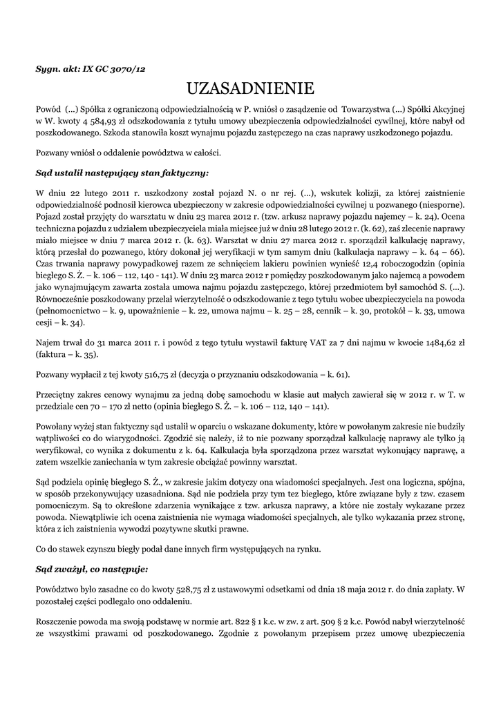Sygn. akt: IX GC 3070/12 UZASADNIENIE Powód (...) Spółka z ograniczoną odpowiedzialnością w P. wniósł o zasądzenie od Towarzystwa (...) Spółki Akcyjnej w W. kwoty 4 584,93 zł odszkodowania z tytułu umowy ubezpieczenia odpowiedzialności cywilnej, które nabył od poszkodowanego. Szkoda stanowiła koszt wynajmu pojazdu zastępczego na czas naprawy uszkodzonego pojazdu. Pozwany wniósł o oddalenie powództwa w całości. Sąd ustalił następujący stan faktyczny: W dniu 22 lutego 2011 r. uszkodzony został pojazd N. o nr rej. (...), wskutek kolizji, za której zaistnienie odpowiedzialność podnosił kierowca ubezpieczony w zakresie odpowiedzialności cywilnej u pozwanego (niesporne). Pojazd został przyjęty do warsztatu w dniu 23 marca 2012 r. (tzw. arkusz naprawy pojazdu najemcy – k. 24). Ocena techniczna pojazdu z udziałem ubezpieczyciela miała miejsce już w dniu 28 lutego 2012 r. (k. 62), zaś zlecenie naprawy miało miejsce w dniu 7 marca 2012 r. (k. 63). Warsztat w dniu 27 marca 2012 r. sporządził kalkulację naprawy, którą przesłał do pozwanego, który dokonał jej weryfikacji w tym samym dniu (kalkulacja naprawy – k. 64 – 66). Czas trwania naprawy powypadkowej razem ze schnięciem lakieru powinien wynieść 12,4 roboczogodzin (opinia biegłego S. Ż. – k. 106 – 112, 140 - 141). W dniu 23 marca 2012 r pomiędzy poszkodowanym jako najemcą a powodem jako wynajmującym zawarta została umowa najmu pojazdu zastępczego, której przedmiotem był samochód S. (...). Równocześnie poszkodowany przelał wierzytelność o odszkodowanie z tego tytułu wobec ubezpieczyciela na powoda (pełnomocnictwo – k. 9, upoważnienie – k. 22, umowa najmu – k. 25 – 28, cennik – k. 30, protokół – k. 33, umowa cesji – k. 34). Najem trwał do 31 marca 2011 r. i powód z tego tytułu wystawił fakturę VAT za 7 dni najmu w kwocie 1484,62 zł (faktura – k. 35). Pozwany wypłacił z tej kwoty 516,75 zł (decyzja o przyznaniu odszkodowania – k. 61). Przeciętny zakres cenowy wynajmu za jedną dobę samochodu w klasie aut małych zawierał się w 2012 r. w T. w przedziale cen 70 – 170 zł netto (opinia biegłego S. Ż. – k. 106 – 112, 140 – 141). Powołany wyżej stan faktyczny sąd ustalił w oparciu o wskazane dokumenty, które w powołanym zakresie nie budziły wątpliwości co do wiarygodności. Zgodzić się należy, iż to nie pozwany sporządzał kalkulację naprawy ale tylko ją weryfikował, co wynika z dokumentu z k. 64. Kalkulacja była sporządzona przez warsztat wykonujący naprawę, a zatem wszelkie zaniechania w tym zakresie obciążać powinny warsztat. Sąd podziela opinię biegłego S. Ż., w zakresie jakim dotyczy ona wiadomości specjalnych. Jest ona logiczna, spójna, w sposób przekonywujący uzasadniona. Sąd nie podziela przy tym tez biegłego, które związane były z tzw. czasem pomocniczym. Są to określone zdarzenia wynikające z tzw. arkusza naprawy, a które nie zostały wykazane przez powoda. Niewątpliwie ich ocena zaistnienia nie wymaga wiadomości specjalnych, ale tylko wykazania przez stronę, która z ich zaistnienia wywodzi pozytywne skutki prawne. Co do stawek czynszu biegły podał dane innych firm występujących na rynku. Sąd zważył, co następuje: Powództwo było zasadne co do kwoty 528,75 zł z ustawowymi odsetkami od dnia 18 maja 2012 r. do dnia zapłaty. W pozostałej części podlegało ono oddaleniu. Roszczenie powoda ma swoją podstawę w normie art. 822 § 1 k.c. w zw. z art. 509 § 2 k.c. Powód nabył wierzytelność ze wszystkimi prawami od poszkodowanego. Zgodnie z powołanym przepisem przez umowę ubezpieczenia odpowiedzialności cywilnej ubezpieczyciel zobowiązuje się do zapłacenia określonego w umowie odszkodowania za szkody wyrządzone osobom trzecim, wobec których odpowiedzialność za szkodę ponosi ubezpieczający albo ubezpieczony. Roszczenie powoda znajduje nadto podstawę w normie określonej w art. 34 ust. 1 Ustawy z dnia 22 maja 2003 r. o ubezpieczeniach obowiązkowych, Ubezpieczeniowym Funduszu Gwarancyjnym i Polskim Biurze Ubezpieczycieli Komunikacyjnych (Dz. U. z 2003 r. Nr. 124 poz. 1152 ze zm.). Nie budziło wątpliwości, iż odpowiedzialność za uszkodzenie pojazdu ponosił podmiot ubezpieczony w zakresie odpowiedzialności cywilnej u pozwanego. Koszt wynajęcia zaś samochodu zastępczego na okres naprawy uszkodzonego pojazdu stanowi szkodę, która może nieraz pozostawać ze zdarzeniem w adekwatnym związku przyczynowym w rozumieniu art. 361 k.c. Niewątpliwie mamy tutaj do czynienia ze szkodą majątkową polegającą na pozbawieniu możliwości korzystania z rzeczy, tym bardziej, iż dane poszkodowanego wskazują na prowadzenie przez niego działalności leczniczej. Między powodem a poszkodowanym zawarta została umowa najmu, opisana w art. 659 § 1 k.c. Poszkodowany godził się na zastosowaną stawkę najmu, która miała wynikać z cennika. Zwrócić należy jednak uwagę, iż przyjęty czas najmu pojazdu zastępczego nie był uzasadniony koniecznym czasem naprawy powyżej 5 dni. Podnieść bowiem należy, iż z adekwatnego związku przyczynowego między zdarzeniem a szkodą (art. 361 § 1 i 2 k.c.) winno wynikać, iż czas wynajmu, a co za tym idzie związany z tym koszt jako szkoda, nie może przekroczyć czasu koniecznej naprawy. Przekroczenie tego czasu czyni ów koszt niezwiązany ze szkodą i nie podlega refundacji w ramach odszkodowania. Z drugiej zaś strony należy wziąć pod uwagę wszystkie okoliczności konkretnego wypadku. Przyjąć również należy zasadę działania poszkodowanego w ramach minimalizacji następstw szkody. Miernik staranności działania poszkodowanego powinien być taki sam, niezależnie czy szkoda jest pokrywana przez ubezpieczyciela, czy też nie ma takiej sytuacji. Podnieść należy, iż ubezpieczyciel nie może ponosić konsekwencji niewłaściwej organizacji naprawy pojazdu czy wydłużonego czasu jej trwania. I tak, co 