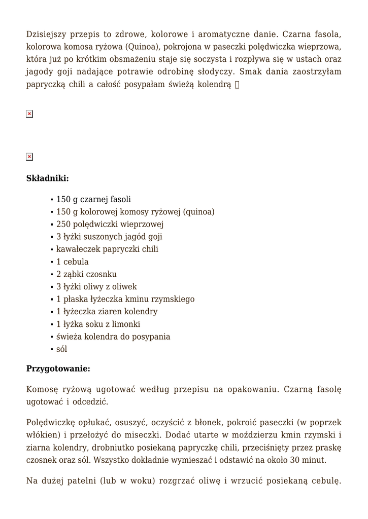 Dzisiejszy przepis to zdrowe, kolorowe i aromatyczne danie. Czarna fasola, kolorowa komosa ryżowa (Quinoa), pokrojona w paseczki polędwiczka wieprzowa, która już po krótkim obsmażeniu staje się soczysta i rozpływa się w ustach oraz jagody goji nadające potrawie odrobinę słodyczy. Smak dania zaostrzyłam papryczką chili a całość posypałam świeżą kolendrą Składniki: 150 g czarnej fasoli 150 g kolorowej komosy ryżowej (quinoa) 250 polędwiczki wieprzowej 3 łyżki suszonych jagód goji kawałeczek papryczki chili 1 cebula 2 ząbki czosnku 3 łyżki oliwy z oliwek 1 płaska łyżeczka kminu rzymskiego 1 łyżeczka ziaren kolendry 1 łyżka soku z limonki świeża kolendra do posypania sól Przygotowanie: Komosę ryżową ugotować według przepisu na opakowaniu. Czarną fasolę ugotować i odcedzić. Polędwiczkę opłukać, osuszyć, oczyścić z błonek, pokroić paseczki (w poprzek włókien) i przełożyć do miseczki. Dodać utarte w moździerzu kmin rzymski i ziarna kolendry, drobniutko posiekaną papryczkę chili, przeciśnięty przez praskę czosnek oraz sól. Wszystko dokładnie wymieszać i odstawić na około 30 minut. Na dużej patelni (lub w woku) rozgrzać oliwę i wrzucić posiekaną cebulę. Zeszklić. Następnie dodać pokrojoną polędwiczkę w przyprawach i smażyć na dużym ogniu przez 2 minuty, ciągle mieszając. Dodać jagody goji, ugotowaną fasolę i komosę ryżową oraz sok z limonki. Mieszając smażyć przez 1-2 minuty. Doprawić solą i posypać świeżą kolendrą. Smacznego Patelnię do niskotłuszczowego smażenia można nabyć w internetowym sklepie: www. sklep.dajar.pl Delikatne polędwiczki wieprzowe duszone w białym winie, a dookoła nich makaronowy warkocz. Całość polana sosem śmietankowym z czerwonym pieprzem. Warkocz sobie wymyśliłam, żeby ładnie wyglądało na talerzu, ale równie dobrze można makaron położyć obok polędwiczek. W takiej wersji jak na zdjęciu, danie bardziej wygląda jak przystawka Składniki: 1 polędwiczka wieprzowa 1,5 łyżki czerwonego pieprzu 2 łyżki klarowanego masła 1/3 szklanki białego wytrawnego wina makaron „Czarniecki gniazdko 2” (kilka gniazdek) 200 g śmietany kremówki 30 % 100 g słodkiej śmietanki 18 % sól Przygotowanie: Makaron ugotować al dente. Polędwiczkę oczyścić z błonki, umyć, osuszyć i pokroić w plastry (około 2,5 – 3 cm). Natrzeć łyżką rozgniecionego czerwonego pieprzu i solą. Na patelni rozgrzać masło klarowane i obsmażyć polędwiczki z dwóch stron. Dolać wino i dusić, aż wino odparuje (około 15 minut), następnie polędwiczki wyjąć i przykryć folią aluminiową. Do patelni po mięsie wlać śmietankę i kremówkę. Chwilę gotować i dodać łyżeczkę lekko rozgniecionego czerwonego pieprzu. Gotować, aż sos zgęstnieje. Doprawić solą. Polędwiczkę ułożyć na talerzu, na około położyć warkocz z zaplecionego makaronu (warkocz można delikatnie podgrzać na patelni, uważając aby się nie rozplótł). Całość polać sosem. Smacznego Delikatna polędwiczka wieprzowa marynowana w ostrej paście harissa z aromatyczną kaszą pęczak. Dzięki harissie polędwiczka nabiera innego wymiaru i oryginalnego smaku, a kasza z marchewką smażoną na masełku… pycha Dodatkiem do potrawy może być raita z ogórkiem, która świetnie komponuje się z tym daniem. Spróbujcie Składniki: Polędwiczka: 1 polędwiczka wieprzowa 1 pełna łyżka przyprawy harissa 2 łyżki oliwy z oliwek sól Kasza: 1,5 szklanki kaszy pęczak 1 cebula 3 ząbki czosnku 1 marchewka około 2,5 szklanki bulionu 0,5 pęczka natki pietruszki 1 łyżeczka pieprzu ziołowego 2 plasterki masła 2-3 łyżki oliwy z oliwek sól Przygotowanie: Polędwiczka: Harissę wymieszać z oliwą i solą i dokładnie natrzeć polędwiczkę. Odstawić na około 2 godziny do lodówki. Wyjąć, ogrzać do temperatury pokojowej i przełożyć do naczynia żaroodpornego. Piec w piekarniku nagrzanym do 180°C przez 20 minut. Upieczoną polędwiczkę wyjąć, przykryć folią aluminiową i odstawić na około 5 minut. Mięso musi odpocząć. Kasza: Na dużej i głębokiej patelni rozgrzać oliwę z oliwek, wrzucić posiekana cebulę i czosnek. Zeszklić. Następnie dodać suchy pęczak i chwilę podsmażać. Dodać bulion i wymieszać. Gotować na małym ogniu z lekko uchyloną pokrywką do miękkości kaszy, często mieszając. W razie potrzeby dolać więcej bulionu. W międzyczasie obrać i umyć marchewkę. Pokroić w kostkę i przełożyć na małą patelnię lub rondelka. Dodać masło, szczyptę soli i podsmażyć. Dolać odrobinę wody i gotować do miękkości. Gotową marchewkę dodać do kaszy, wsypać pieprz ziołowy i posiekaną natkę pietruszki. Wymieszać i doprawić solą. Kaszę przełożyć na talerz i ułożyć pokrojoną w plasterki polędwiczkę. Do dania świetnie pasuje raita ogórkowa. Smacznego Proste i smaczne szaszłyki z polędwiczek drobiowych marynowanych w kozim jogurcie z przyprawami, podane z ogórkową raitą. Danie jest przykładem tego, że niewielkim nakładem pracy można uzyskać coś wyjątkowego. Składniki: 14 polędwiczek drobiowych 1 czerwona papryka Marynata: 150 g jogurtu koziego 1 łyżeczka suszonego czosnku 1/2 łyżeczki kminu rzymskiego 1/2 łyżeczki ziaren kolendry 1/3 łyżeczki chilli 2 łyżeczki papryki słodkiej 1 łyżka oliwy z oliwek szczypta cukru sól Dodatkowo: 7 patyczków do szaszłyków raita ogórkowa Przygotowanie: Marynata: Polędwiczki umyć i osuszyć. Kmin rzymski i ziarna kolendry utrzeć w moździerzu. Do miseczki wlać jogurt kozi, dodać czosnek, paprykę, kmin rzymski, kolendrę, chilli i cukier. Dolać oliwę z oliwek, wymieszać i doprawić solą. Do powstałej marynaty włożyć polędwiczki, wymieszać i odstawić na około 2 godziny. Paprykę umyć, usunąć gniazdo nasienne i pokroić. Polędwiczki wyjąć z marynaty i nadziewać po dwie na każdy patyczek zwijając w harmonijkę. Między polędwiczk