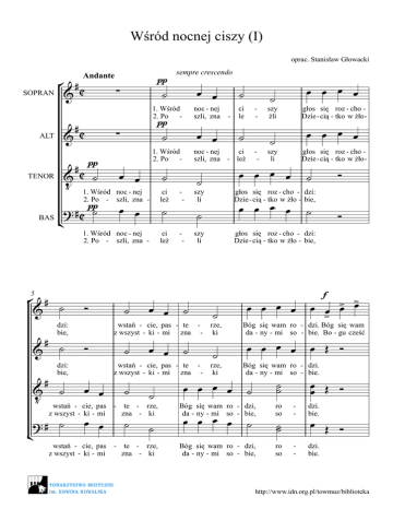 Wśród nocnej ciszy (I) oprac. Stanisław Głowacki ° # SOPRAN & C Andante # & C ALT # TENOR BAS ¢ ¢ & ‹ # dzi: bie, ˙ 1. Wśród 2. Po pp noc - nej szli, zna 1. Wśród 2. Po - ˙ ˙ - œ œ ˙ pp ci le - ˙ noc - nej ci szli, zna - leź - œ œ œ œ ˙ szy źli głos się roz - cho Dzie - cią - tko w żło - œ œ œ œ ˙ szy li głos się roz - cho Dzie - cią - tko w żło - œ œ œ œ ˙ ˙ Ó ˙ Ó szli, zna - ci leź - szy li głos się roz - cho - dzi: Dzie - cią - tko w żło - bie, 1. Wśród noc - nej 2. Po - szli, zna - ci leź - szy li głos się roz - cho - dzi: Dzie - cią - tko w żło - bie, 2. Po pp Ó Ó dzi: bie, ˙ œ œ ˙ ∑ ? #C ˙ 5 # ∑ œ œ & C ˙ ‹ 1. Wśród noc - nej ° # & ˙ & pp sempre crescendo œ œ ˙ ˙ œ œ ˙ ˙ œ œ ˙ wstań - cie, pas - te z wszyst - ki - mi zna - wstań - cie, pas - te z wszyst - ki - mi zna - œ œ ˙ œ œ ˙ ˙ œ œ œ œ ˙ ˙ rze, ki ˙ rze, ki œ œ œ œ œ œ œ œ > œ œ >œ œ > f Bóg się wam ro - dzi. Bóg się wam da - ny - mi so - bie. Bo - gu cześć œ œ œ œ œ Œ Ó Bóg się wam ro - dzi. da - ny - mi so - bie. ˙˙ ˙ œ Œ Ó œ wstań - cie, pas - te - rze, z wszyst - ki - mi zna - ki Bóg się wam ro - dzi, da - ny - mi so - bie, ro so - dzi. bie. wstań - cie, pas - te - rze, z wszyst - ki - mi zna - ki Bóg się wam ro - dzi, da - ny - mi so - bie, ro so - dzi. bie. ?# ˙ ˙ œ œ œ œ ˙ ˙˙ œ Œ Ó http://www.idn.org.pl/towmuz/biblioteka 10 > ° # ™ w & ™ 2 w ro da f - - # ™ & ™ œ œ œ œ Czem prę - dzej się Ja - ko Bo - gu f # ™ œ œ œ œ & ™ ‹ Czem prę - dzej się ? # ™™ œ œ œ œ ¢ Ja - ko f Bo - gu Czem prę - dzej się Ja - ko Bo - gu ° # w & dzi, li, œ œ œ œ œ œ œ œ œ™ # & œ - - - œ œ œ œ œ œ ¢ & œ ‹ przy œ œœ - wi - tać Pa z wiel - kiej ra - doś ?# œ œœ przy - wi - tać Pa z wiel - kiej ra - doś na, ci, - - - œ >œ >œ Ó na ci œ Œ œ œ Œ Ó na ci na ci wi jąc - cie ła - Bet - le - jem wi - ta - jąc, - tać z ra - j œ œ œ œ™ po - śpie - szaj - cie, za - wo - ła - li œ œ do a po - śpie - szaj - cie za - wo - ła - li Bet - le - jem wi - ta - jąc, Bet - le - jem wi - ta - jąc, >œ wam cześć œ œ œ œ œ œ po - śpie - szaj - cie za - wo - ła - li ™™ w 2. n c n c ™™ w n c ™™ w w nc ™™ na. ści. ˙ na. ści. na. ści. Ó ˙ œ œ œ œ do a Bóg się Bo - gu Œ idź wo œ œ œ œ wy - bie - raj - cie, cześć Mu da - li, przy - wi - tać Pa z wiel - kiej ra - doś # œ œ œ J œ ˙ do a wy - bie - raj - cie, cześć Mu da - li, 1. œ œ œ œ œ œ œ œ wy - bie - raj - cie, cześć Mu da - li, 14 Pa doś mf Ó na. ści. http://www.idn.org.pl/towmuz/biblioteka meno mosso a tempo ° fw&c 17 Ach! & c ww Ach! wi - taj, Zbaw ˙˙ œœ œœ ˙ ˙ ? ¢ cŒ Ach, f œ œ f œ œ Zbaw œ 21 czte ˙˙ ny, czte ? œ œ œ œ ¢ ny, czte - ry co, ach, ˙ ˙ co, ach, ˙ ry - œœ œœ ˙ ˙ ∑ ˙ ry ty - sią ty - sią czte - - ˙ ˙ ce, czte - - - ˙ co, ˙ co, ˙ œ œ œ œ z daw - na œ œ œœ z daw - na wi - taj, œ z daw - na œ œ wi - taj, z daw - na œœ œœ œœ œ ce lat ˙ œ œ œœ œ œ œ œ żą - da - żą - da - œ w w wy - glą - da - ny. ce lat œ œ œ œ œ œ œ J J w j j œ œ œ œ œ w ry œ żą - da - w ry œ żą - da - œ œ wy - glą - da - ny. ty - sią - ce wy - glą - da - ny. œ œ - œœ œ ˙ - ˙ ty - sią - œ œ ˙ & w & w ‹ ny, Zbaw f ny, - - Zbaw ˙ ˙ Ach, wi - taj, ° w & w wi - taj, ˙ œ Ach, wi - taj, ˙ œ Ach, f &c Œ ‹ œ ˙ 3 ty - sią - ce wy - glą - da - ny. http://www.idn.org.pl/towmuz/biblioteka ° ™ >œ & ™ 4 >œ 26 Na & ™™ >˙ >œ >œ Cie - bie kró ° & 29 bie >œ >œ >œ >œ Cie - bie kró le, pro >œ >œ le, pro œ œ J j œ œ li, >œ >œ & ‹ Tyś tej ? >œ >œ Tyś œ tej no - cy & œ™ ¢ >œ Cie - bie Tyś tej œ™ œ - >œ kró - œ œ J œ j œ œ œ - - œ œ œ nam się ob - ja œ œ œ œ ro - cy œ œ ro - cy nam się ob - ja >œ œ œ œ œ w nam się ob - ja - wił. œ œ się ob - ja no - cy >œ œ œ œ no - cy - nam - œ wił, œ - wił, a >˙ ka - >œ >œ >œ >œ li, a >œ >œ cze - ka - >œ >œ li, a U ™™ w 2. wił. œ œ œ li, - w - >œ cze 1. œ >œ >˙ cze - ka - >œ tej no - cy œ cze - ka - pro - ro - cy >œ >œ >œ pro - ro - cy - >œ >œ ™ le, Cie >œ Na - >˙ Na >œ ™ & ™ ‹ Na >œ ? ™ ¢ ™ >œ ™ wił. œ œ œ ob - ja - wił. U ™™ w wił. U ™™ w wił. œ œ œ ob - ja - wił. U ™™ w w wił. http://www.idn.org.pl/towmuz/biblioteka