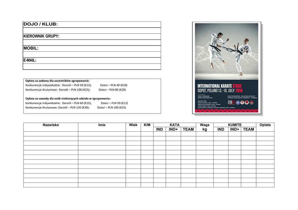 DOJO / KLUB: KIEROWNIK GRUPY: MOBIL: E-MAIL: Opłata za zadowy dla uczestników zgrupowania: Konkurencje indywidualne: Dorośli – PLN 50 (€12); Dzieci – PLN 40 (€10) Konkurencje drużynowe: Dorośli – PLN 100 (€25); Dzieci – PLN 80 (€20) Opłata za zawody dla osób niebiorących udziału w zgrupowaniu: Konkurencje indywidualne: Dorośli – PLN 60 (€15); Dzieci – PLN 50 (€12) Konkurencje drużynowe: Dorośli – PLN 120 (€30); Dzieci – PLN 100 (€25) Nazwisko Imie Wiek K/M KATA IND IND+ Waga TEAM kg KUMITE IND IND+ Oplata TEAM IND + Istnieje możliwość uczestniczenia w dwoch kategoriach wiekowych, na przykład kadet może uczestniczyć w kategorii juniorów, itp "Jako osoba odpowiedzialna za wysłanie formularza potwierdzam, ze poinformowałem wszystkich moich uczestników, zawodników, rodziców i opiekunów o tym , ze wszystkie osoby biorące udział w Letnich Mistrzostwach Sopot 2015 oraz w Letnim zgrupowaniu karate Sopot 2015 robią to na własne ryzyko i że organizator, ani jego pomocnicy nie ponosza żadnej odpowiedzialnosci za jakiekolwiek straty lub szkody poniesione na wymienionych imprezach. I dalej deklaruje, że odpowiednie ubezpieczenie zdrowotne / podróżne obowiązuje dla całej mojej / naszej grupy. " Po wypełnieniu formularza należy wysłana do [email protected] wraz z kopią przelewu bankowego. Łączna kwota wszystkich oplat: PLN: lub EUR: Wplata na konto: Robert Hamara ul. Jaskowa Dolina 75, 80-286 Gdansk, Poland Bank: ING Bank Slaski, oddzial Gdansk Al. Grunwaldzka 56, 80-241 Gdansk, Poland ‐ Wpłaty dokonane do 1. czerwca 2016 beda obnizone o 40% . ‐ Wpłaty dokonane do 1. lipca 2016 beda obnizone o 20%. Konto Direct w PLN (Polske zlotowki): Account no: 79 1050 1764 1000 0092 0892 8276 IBAN no: PL 79 1050 1764 1000 0092 0892 8276 SWIFT/BIC: INGBPLPW Konto w EUR (Euro): Account: 83 1050 1764 1000 0092 0893 0629 IBAN no: PL 83 1050 1764 1000 0092 0893 0629 SWIFT/BIC: INGBPLPW