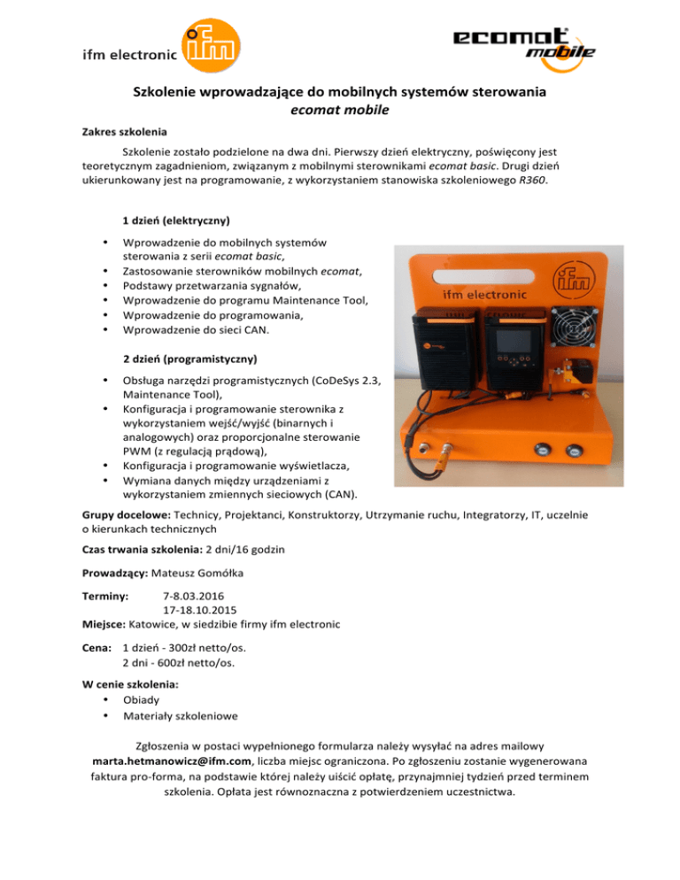 Szkoleniewprowadzającedomobilnychsystemówsterowania ecomatmobile Zakresszkolenia Szkoleniezostałopodzielonenadwadni.Pierwszydzieńelektryczny,poświęconyjest teoretycznymzagadnieniom,związanymzmobilnymisterownikamiecomatbasic.Drugidzień ukierunkowanyjestnaprogramowanie,zwykorzystaniemstanowiskaszkoleniowegoR360. 1dzień(elektryczny) • • • • • • • • • • Wprowadzeniedomobilnychsystemów sterowaniazseriiecomatbasic, Zastosowaniesterownikówmobilnychecomat, Podstawyprzetwarzaniasygnałów, WprowadzeniedoprogramuMaintenanceTool, Wprowadzeniedoprogramowania, WprowadzeniedosieciCAN. 2dzień(programistyczny) Obsługanarzędziprogramistycznych(CoDeSys2.3, MaintenanceTool), Konfiguracjaiprogramowaniesterownikaz wykorzystaniemwejść/wyjść(binarnychi analogowych)orazproporcjonalnesterowanie PWM(zregulacjąprądową), Konfiguracjaiprogramowaniewyświetlacza, Wymianadanychmiędzyurządzeniamiz wykorzystaniemzmiennychsieciowych(CAN). Grupydocelowe:Technicy,Projektanci,Konstruktorzy,Utrzymanieruchu,Integratorzy,IT,uczelnie okierunkachtechnicznych Czastrwaniaszkolenia:2dni/16godzin Prowadzący:MateuszGomółka Terminy: 7-8.03.2016 17-18.10.2015 Miejsce:Katowice,wsiedzibiefirmyifmelectronic Cena: 1dzień-300złnetto/os. 2dni-600złnetto/os. Wcenieszkolenia: • Obiady • Materiałyszkoleniowe Zgłoszeniawpostaciwypełnionegoformularzanależywysyłaćnaadresmailowy [email protected],liczbamiejscograniczona.Pozgłoszeniuzostaniewygenerowana fakturapro-forma,napodstawiektórejnależyuiścićopłatę,przynajmniejtydzieńprzedterminem szkolenia.Opłatajestrównoznacznazpotwierdzeniemuczestnictwa.