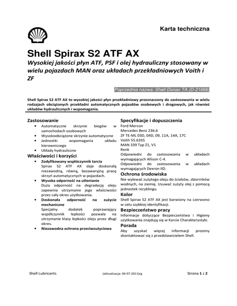 Karta techniczna Shell Spirax S2 ATF AX Wysokiej jakości płyn ATF, PSF i olej hydrauliczny stosowany w wielu pojazdach MAN oraz układach przekładniowych Voith i ZF Poprzednia nazwa: Shell Donax TA (D-21666) Shell Spirax S2 ATF AX to wysokiej jakości płyn przekładniowy przeznaczony do zastosowania w wielu rodzajach obciążonych przekładni automatycznych pojazdów osobowych i drogowych, jak również układów hydraulicznych i wspomagania. Zastosowanie Specyfikacje i dopuszczenia Ford Mercon Mercedes Benz 236.6 ZF TE-ML 03D, 04D, 09, 11A, 14A, 17C • Voith 55.6335 • MAN 339 Typ Z1, V1 Renk • Odpowiedni do zastosowania w układach Właściwości i korzyści wymagających Allison C-4. • Zodyfikowany wspłóczynnik tarcia Odpowiedni do zastosowania w układach Spirax S2 ATF AX daje doskonałą wymagających Dexron IID. niezawodną, równą, bezawaryjną pracę Ochrona środowiska skrzyń automatycznych w pojazdach. Nie wylewać zużytego oleju do ścieków, zbiorników • Wysoka odporność na utlenianie Duża odporność na degradację oleju wodnych, na ziemię. Usuwać zużyty olej z pomocą zapewnia utrzymanie jego właściwości jednostek recyklingu. Kolor przez cały okres użytkowania. • Doskonała odporność na zużycie Shell Spirax S2 ATF AX jest barwiony na czerwono w celu szybkiej identyfikacji. mechaniczne Specjalny dodatek poprawiający Bezpieczeństwo pracy współczynnik lepkości pozwala na Informacje dotyczące Bezpieczeństwa i Higieny utrzymanie klasy lepkości oleju przez długi użytkowania znajdują się w Karcie Charakterystyki. okres. Porada • Niezawodna ochrona przeciwzużyciowa Aby uzyskać więcej informacji prosimy skontaktować się z przedstawicielem Shell. • Automatyczne skrzynie biegów w samochodach osobowych Wysokoobciążone skrzynie automatyczne Jednostki wspomagania układu kierowniczego Układy hydrauliczne Shell Lubricants (aktualizacja: 04-07-2011)rg Strona 1 z 2 Typowe Właściwości Fizyczne Shell Spirax S2 ATF AX Lepkość kinematyczna 40 [0C] [cSt] 100 [0C] [cSt] Współczynnik lepkości Gęstość 15 [0C] [kg/m3] Temperatura zapłonu COC [0C] Temperatura płynięcia [0C] ISO 3104 ISO 2909 ISO 12185 ISO 2592 ISO 3016 34.6 7.1 174 874 180 -45 Powyższa charakterystyka jest typowa dla obecnej produkcji. Przyszłe partie produkcyjne będą spełniać specyfikacje produktowe Shell, niemniej mogą wystąpić pewne odchylenia od w/w wartości średnich. Shell Lubricants (aktualizacja: 04-07-2011)rg Strona 2 z 2