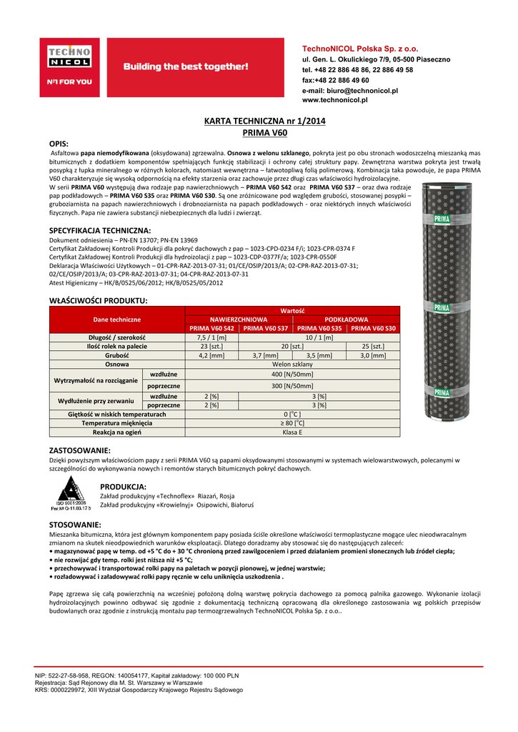 TechnoNICOL Polska Sp. z o.o. ul. Gen. L. Okulickiego 7/9, 05-500 Piaseczno tel. +48 22 886 48 86, 22 886 49 58 fax:+48 22 886 49 60 e-mail: [email protected] www.technonicol.pl KARTA TECHNICZNA nr 1/2014 PRIMA V60 OPIS: Asfaltowa papa niemodyfikowana (oksydowana) zgrzewalna. Osnowa z welonu szklanego, pokryta jest po obu stronach wodoszczelną mieszanką mas bitumicznych z dodatkiem komponentów spełniających funkcję stabilizacji i ochrony całej struktury papy. Zewnętrzna warstwa pokryta jest trwałą posypką z łupka mineralnego w różnych kolorach, natomiast wewnętrzna – łatwotopliwą folią polimerową. Kombinacja taka powoduje, że papa PRIMA V60 charakteryzuje się wysoką odpornością na efekty starzenia oraz zachowuje przez długi czas właściwości hydroizolacyjne. W serii PRIMA V60 występują dwa rodzaje pap nawierzchniowych – PRIMA V60 S42 oraz PRIMA V60 S37 – oraz dwa rodzaje pap podkładowych – PRIMA V60 S35 oraz PRIMA V60 S30. Są one zróżnicowane pod względem grubości, stosowanej posypki – gruboziarnista na papach nawierzchniowych i drobnoziarnista na papach podkładowych - oraz niektórych innych właściwości fizycznych. Papa nie zawiera substancji niebezpiecznych dla ludzi i zwierząt. SPECYFIKACJA TECHNICZNA: Dokument odniesienia – PN-EN 13707; PN-EN 13969 Certyfikat Zakładowej Kontroli Produkcji dla pokryć dachowych z pap – 1023-CPD-0234 F/i; 1023-CPR-0374 F Certyfikat Zakładowej Kontroli Produkcji dla hydroizolacji z pap – 1023-CDP-0377F/a; 1023-CPR-0550F Deklaracja Właściwości Użytkowych – 01-CPR-RAZ-2013-07-31; 01/CE/OSIP/2013/A; 02-CPR-RAZ-2013-07-31; 02/CE/OSIP/2013/A; 03-CPR-RAZ-2013-07-31; 04-CPR-RAZ-2013-07-31 Atest Higieniczny – HK/B/0525/06/2012; HK/B/0525/05/2012 WŁAŚCIWOŚCI PRODUKTU: Dane techniczne Długość / szerokość Ilość rolek na palecie Grubość Osnowa Wytrzymałość na rozciąganie wzdłużne Wartość NAWIERZCHNIOWA PODKŁADOWA PRIMA V60 S42 PRIMA V60 S37 PRIMA V60 S35 PRIMA V60 S30 7,5 / 1 [m] 10 / 1 [m] 23 [szt.] 20 [szt.] 25 [szt.] 4,2 [mm] 3,7 [mm] 3,5 [mm] 3,0 [mm] Welon szklany 400 [N/50mm] poprzeczne wzdłużne Wydłużenie przy zerwaniu poprzeczne Giętkość w niskich temperaturach Temperatura mięknięcia Reakcja na ogień 300 [N/50mm] 2 [%] 2 [%] 3 [%] 3 [%] 0 [oC ] ≥ 80 [oC] Klasa E ZASTOSOWANIE: Dzięki powyższym właściwościom papy z serii PRIMA V60 są papami oksydowanymi stosowanymi w systemach wielowarstwowych, polecanymi w szczególności do wykonywania nowych i remontów starych bitumicznych pokryć dachowych. PRODUKCJA: Zakład produkcyjny «Technoflex» Riazań, Rosja Zakład produkcyjny «Krowielnyj» Osipowichi, Białoruś STOSOWANIE: Mieszanka bitumiczna, która jest głównym komponentem papy posiada ściśle określone właściwości termoplastyczne mogące ulec nieodwracalnym zmianom na skutek nieodpowiednich warunków eksploatacji. Dlatego doradzamy aby stosować się do następujących zaleceń: • magazynować papę w temp. od +5 °C do + 30 °C chronioną przed zawilgoceniem i przed działaniem promieni słonecznych lub źródeł ciepła; • nie rozwijać gdy temp. rolki jest niższa niż +5 °C; • przechowywać i transportować rolki papy na paletach w pozycji pionowej, w jednej warstwie; • rozładowywać i załadowywać rolki papy ręcznie w celu uniknięcia uszkodzenia . Papę zgrzewa się całą powierzchnią na wcześniej położoną dolną warstwę pokrycia dachowego za pomocą palnika gazowego. Wykonanie izolacji hydroizolacyjnych powinno odbywać się zgodnie z dokumentacją techniczną opracowaną dla określonego zastosowania wg polskich przepisów budowlanych oraz zgodnie z instrukcją montażu pap termozgrzewalnych TechnoNICOL Polska Sp. z o.o.. NIP: 522-27-58-958, REGON: 140054177, Kapitał zakładowy: 100 000 PLN Rejestracja: Sąd Rejonowy dla M. St. Warszawy w Warszawie KRS: 0000229972, XIII Wydział Gospodarczy Krajowego Rejestru Sądowego