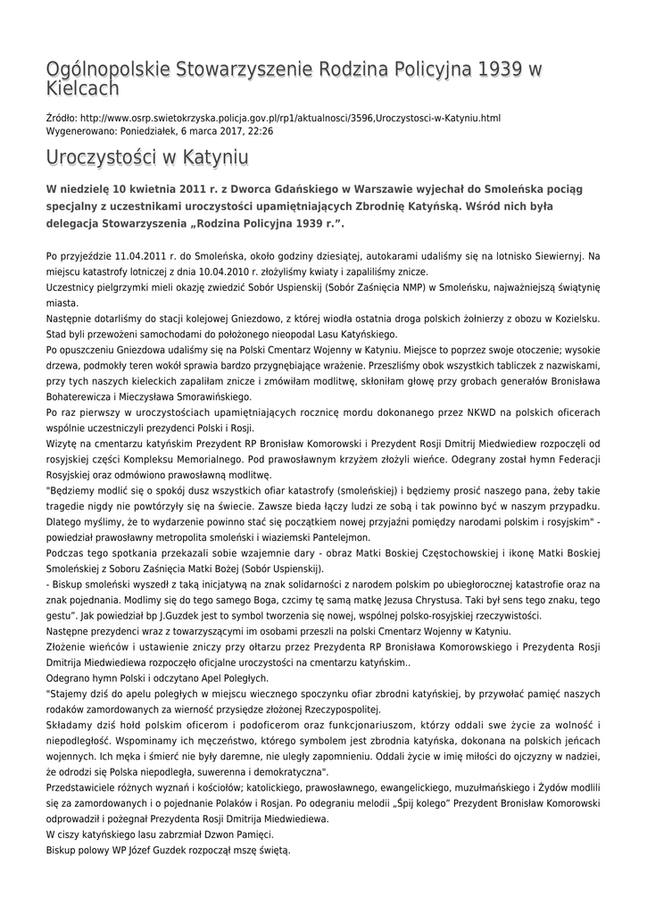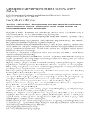 Ogólnopolskie Stowarzyszenie Rodzina Policyjna 1939 w Kielcach Źródło: http://www.osrp.swietokrzyska.policja.gov.pl/rp1/aktualnosci/3596,Uroczystosci-w-Katyniu.html Wygenerowano: Poniedziałek, 6 marca 2017, 22:26 Uroczystości w Katyniu W niedzielę 10 kwietnia 2011 r. z Dworca Gdańskiego w Warszawie wyjechał do Smoleńska pociąg specjalny z uczestnikami uroczystości upamiętniających Zbrodnię Katyńską. Wśród nich była delegacja Stowarzyszenia „Rodzina Policyjna 1939 r.”. Po przyjeździe 11.04.2011 r. do Smoleńska, około godziny dziesiątej, autokarami udaliśmy się na lotnisko Siewiernyj. Na miejscu katastrofy lotniczej z dnia 10.04.2010 r. złożyliśmy kwiaty i zapaliliśmy znicze. Uczestnicy pielgrzymki mieli okazję zwiedzić Sobór Uspienskij (Sobór Zaśnięcia NMP) w Smoleńsku, najważniejszą świątynię miasta. Następnie dotarliśmy do stacji kolejowej Gniezdowo, z której wiodła ostatnia droga polskich żołnierzy z obozu w Kozielsku. Stad byli przewożeni samochodami do położonego nieopodal Lasu Katyńskiego. Po opuszczeniu Gniezdowa udaliśmy się na Polski Cmentarz Wojenny w Katyniu. Miejsce to poprzez swoje otoczenie; wysokie drzewa, podmokły teren wokół sprawia bardzo przygnębiające wrażenie. Przeszliśmy obok wszystkich tabliczek z nazwiskami, przy tych naszych kieleckich zapaliłam znicze i zmówiłam modlitwę, skłoniłam głowę przy grobach generałów Bronisława Bohaterewicza i Mieczysława Smorawińskiego. Po raz pierwszy w uroczystościach upamiętniających rocznicę mordu dokonanego przez NKWD na polskich oficerach wspólnie uczestniczyli prezydenci Polski i Rosji. Wizytę na cmentarzu katyńskim Prezydent RP Bronisław Komorowski i Prezydent Rosji Dmitrij Miedwiediew rozpoczęli od rosyjskiej części Kompleksu Memorialnego. Pod prawosławnym krzyżem złożyli wieńce. Odegrany został hymn Federacji Rosyjskiej oraz odmówiono prawosławną modlitwę. "Będziemy modlić się o spokój dusz wszystkich ofiar katastrofy (smoleńskiej) i będziemy prosić naszego pana, żeby takie tragedie nigdy nie powtórzyły się na świecie. Zawsze bieda łączy ludzi ze sobą i tak powinno być w naszym przypadku. Dlatego myślimy, że to wydarzenie powinno stać się początkiem nowej przyjaźni pomiędzy narodami polskim i rosyjskim" powiedział prawosławny metropolita smoleński i wiaziemski Pantelejmon. Podczas tego spotkania przekazali sobie wzajemnie dary - obraz Matki Boskiej Częstochowskiej i ikonę Matki Boskiej Smoleńskiej z Soboru Zaśnięcia Matki Bożej (Sobór Uspienskij). - Biskup smoleński wyszedł z taką inicjatywą na znak solidarności z narodem polskim po ubiegłorocznej katastrofie oraz na znak pojednania. Modlimy się do tego samego Boga, czcimy tę samą matkę Jezusa Chrystusa. Taki był sens tego znaku, tego gestu”. Jak powiedział bp J.Guzdek jest to symbol tworzenia się nowej, wspólnej polsko-rosyjskiej rzeczywistości. Następne prezydenci wraz z towarzyszącymi im osobami przeszli na polski Cmentarz Wojenny w Katyniu. Złożenie wieńców i ustawienie zniczy przy ołtarzu przez Prezydenta RP Bronisława Komorowskiego i Prezydenta Rosji Dmitrija Miedwiediewa rozpoczęło oficjalne uroczystości na cmentarzu katyńskim.. Odegrano hymn Polski i odczytano Apel Poległych. "Stajemy dziś do apelu poległych w miejscu wiecznego spoczynku ofiar zbrodni katyńskiej, by przywołać pamięć naszych rodaków zamordowanych za wierność przysiędze złożonej Rzeczypospolitej. Składamy dziś hołd polskim oficerom i podoficerom oraz funkcjonariuszom, którzy oddali swe życie za wolność i niepodległość. Wspominamy ich męczeństwo, którego symbolem jest zbrodnia katyńska, dokonana na polskich jeńcach wojennych. Ich męka i śmierć nie były daremne, nie uległy zapomnieniu. Oddali życie w imię miłości do ojczyzny w nadziei, że odrodzi się Polska niepodległa, suwerenna i demokratyczna". Przedstawiciele różnych wyznań i kościołów; katolickiego, prawosławnego, ewangelickiego, muzułmańskiego i Żydów modlili się za zamordowanych i o pojednanie Polaków i Rosjan. Po odegraniu melodii „Śpij kolego” Prezydent Bronisław Komorowski odprowadził i pożegnał Prezydenta Rosji Dmitrija Miedwiediewa. W ciszy katyńskiego lasu zabrzmiał Dzwon Pamięci. Biskup polowy WP Józef Guzdek rozpoczął mszę świętą. Po mszy świętej głos zabrał Prezydent RP B. Komorowski. „ Składamy dzisiaj głowy w zadumie i modlitwie w miejscu kaźni ofiar zbrodni katyńskiej, skłaniamy przed grobami polskich oficerów, policjantów, funkcjonariuszy służby granicznej i służby więziennej, duchownych, urzędników państwa polskiego – jeńców wojennych zgładzonych podstępnie, bez procesów i bez normalnego cywilizowanego prawa do obrony. Las Katyński jest niemym świadkiem tego, że system stalinowski był okrutny także dla swych własnych obywateli – Rosjan, Białorusinów, Ukraińców”. Pani Izabella Sariusz-Skąpska prezes Federacji Rodzin Katyńskich w swoim przemówieniu bardzo pięknie przypomniała postać Andrzeja Przewoźnika, ofiary katastrofy lotniczej, którego niepodważalną zasługą są i będą już na zawsze cmentarze w Katyniu, Miednoje i Charkowie oraz cmentarz Orląt we Lwowie. Na zakończenie uroczystości rodziny, delegacje. Przedstawiciele smoleńskiej polonii złożyli kwiaty i zapalili znicze. Po wyjściu z polskiej części cmentarza katyńskiego przedstawiciele „Rodziny Policyjnej 1939 r.” przeszli na tę część cmentarza gdzie spoczywają obywatele Rosji, ofiary terroru stalinowskiego. Pod prawosławnym krzyżem zapaliliśmy znicze. Ocena: 0/5 (0) Tweetnij