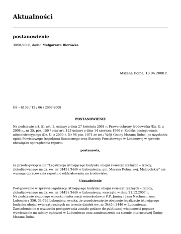 Aktualności postanowienie 30/04/2008, dodał: Małgorzata Bierówka Mszana Dolna, 18.04.2008 r. OŚ – 6136 / 12 / 06 / 2007-2008 POSTANOWIENIE Na podstawie art. 51 ust. 2, ustawy z dnia 27 kwietnia 2001 r. Prawo ochrony środowiska /Dz. U. z 2008 r., nr 25, poz. 150 / oraz art. 123 ustawy z dnia 14 czerwca 1960 r. Kodeks postępowania administracyjnego /Dz. U. z 2000 r. Nr 98 poz. 1071 ze zm./ Wójt Gminy Mszana Dolna, po uzyskaniu opinii Powiatowego Inspektora Sanitarnego oraz Starosty Powiatowego w Limanowej w sprawie obowiązku sporządzenia raportu postanawia, że przedsięwzięcie pn.”Legalizacja istniejącego budynku ubojni zwierząt rzeźnych – trzody, zlokalizowanego na dz. ew. nr 3445 i 3446 w Lubomierzu, gm. Mszana Dolna, woj. Małopolskie” nie wymaga opracowania raportu o oddziaływaniu na środowisko. Uzasadnienie Postępowanie w sprawie legalizacji istniejącego budynku ubojni zwierząt rzeźnych – trzody, zlokalizowanego na dz. ew. nr 3445 i 3446 w Lubomierzu, wszczęto w dniu 21.12.2007 r. Na podstawie złożonego wniosku i informacji wnioskodawcy P.P. Janiny i Jana Nachman zam. Lubomierz 356, 34-736 Lubomierz wynika, że przedsięwzięcie obejmuje legalizację istniejącego budynku ubojni zwierząt rzeźnych na terenie działek ew. nr 3445 i 3446 w Lubomierzu. Zawiadomienie o wszczęciu postępowania zostało podane do publicznej wiadomości poprzez wywieszenie na tablicy ogłoszeń w Lubomierzu oraz zamieszczenie na stronie internetowej Gminy Mszana Dolna. Po przeanalizowaniu materiałów zgromadzonych w sprawie stwierdzono, że przedmiotowa inwestycja zgodnie z § 3 ust. 1 pkt. 84 Rozporządzenia Rady Ministrów z dnia 9 listopada 2004 roku w sprawie określenia rodzajów przedsięwzięć mogących znacząco oddziaływać na środowisko oraz szczegółowych uwarunkowań związanych z kwalifikowaniem przedsięwzięcia do sporządzenia raportu o oddziaływaniu na środowisko (Dz. U. z 2004 r., Nr 257, poz. 2573 ze zm.) jest przedsięwzięciem mogącym znacząco oddziaływać na środowisko, dla którego sporządzenie raportu może być wymagane. Wójt Gminy pismem znak: OŚ-6136/12/01/2007 z dnia 28.12.2007 r. zwrócił się do Wojewody Małopolskiego z prośbą o opinię w sprawie obowiązku sporządzenia raportu o oddziaływaniu na środowisko dla planowanego przedsięwzięcia. Wojewoda Małopolski pismem z dnia 10.03.2008 r. znak: SR.V.MSk.6639-2-9-08 wskazał, że przedsięwzięcie zlokalizowane jest poza obszarem Europejskiej Sieci Ekologicznej Natura 2000 Ostoja Gorczańska PLH 120018 znajdującym się na „liście rządowej”, o której mowa w art. 27 ustawy z dnia 16 kwietnia 2004 r. o ochronie przyrody oraz poza obszarem potencjalnym sieci Natura 2000 Ostoje Nietoperzy Beskidu wyspowego PLH 120030. Inwestycja zlokalizowana jest poza występującymi siedliskami przyrodniczymi oraz gatunkami roślin i zwierząt, dla ochrony których zaproponowano wyznaczenie ww. obszarów Natura 2000. W ocenie Urzędu Wojewódzkiego inwestycja nie będzie mieć wpływu na w/w obszary sieci Natura 2000. Powiatowy Inspektor Sanitarny, postanowieniem z dnia 14.01.2008 r. znak: ONNZ-420-19/08 oraz Starosta Powiatowy w Limanowej, postanowieniem z dnia 10.04.2008 r. znak: OŚ.7633-15/08, wydali opinię, że w/w przedsięwzięcie wymaga sporządzenia raportu o oddziaływaniu na środowisko. Wójt Gminy na podstawie zebranych dokumentów w sprawie oraz przedstawionych opinii organu ochrony środowiska oraz PPIS stwierdził co następuje: 1. Przedsięwzięcie obejmuje legalizację istniejącego budynku ubojni zwierząt rzeźnych położonego na terenach oznaczonych w planie zagospodarowania przestrzennego jako RPU- tereny urządzeń produkcji rolniczej w związku z czym nie narusza ustaleń miejscowego planu zagospodarowania przestrzennego gminy Mszana Dolna wsi Lubomierz. 2. Inwestycja zlokalizowana jest poza występującymi siedliskami przyrodniczymi oraz gatunkami roślin i zwierząt, dla ochrony których zaproponowano wyznaczenie ww. obszarów Natura 2000. 3. Ubój prowadzony jest wewnątrz obiektu. Niewielki wzrost poziomu hałasu może występować przy rozładunku trzody chlewnej, nie będzie on jednak powodował przekroczenia dopuszczalnego poziomu hałasu na granicy działki. 4. Funkcjonowanie Zakładu, przy zachowaniu reżimu technologicznego nie spowoduje wzrostu dopuszczalnych poziomów substancji zanieczyszczających w powietrzu poza terenem, do którego inwestor posiada tytuł prawny.. 5. W ramach przedsięwzięcia planowany jest ubój 100 szt. trzody chlewnej na dobę w istniejącym obiekcie o konstrukcji murowanej, przystosowanym do uboju zwierząt.. 6. Zakład posiada własne ujęcie wody. Obiekt wyposażony jest m.in. w instalację wodno-kanalizacyjną. Ścieki socjalne i poprodukcyjne są odprowadzane do szczelnego zbiornika wybieralnego i na bieżąco wywożone są do oczyszczalni ścieków w Mszanie Dolnej. Docelowo Zakład wyposażony zostanie w oczyszczalnię ścieków. Ścieki z placu manewrowego oraz dróg dojazdowych skierowane zostaną po podczyszczeniu w separatorach do studzienek zanikowych i spełniać będą wymagania określone w przepisach Prawa wodnego oraz Rozporządzenia Ministra Środowiska z dnia 24 lipca 2006 r. w sprawie warunków jakie należy spełnić przy wprowadzaniu ścieków do wód lub do ziemi. 7. W wyniku prowadzonej działalności odpady będą zagospodarowane zgodnie z obowiązującymi przepisami ustawy o odpadach, regulaminu utrzymania czystości i porządku na terenie gminy Mszana Dolna oraz zgodnie z przedłożoną w Starostwie Powiatowym informacją o wytwarzanych odpadach i sposobach ich zagospodarowania. 8. Od strony cieku wodnego wykonany będzie na terenie Zakładu pas zieleni oraz umocniona zostanie skarpa potoku Mszanka. Przy zachowaniu powyższych warunków Zakład nie będzie powodować szkodliwego oddziaływania na środowisko powyżej dopuszczalnych poziomów. Wójt Gminy po zapoznaniu się z wnioskiem, informacj