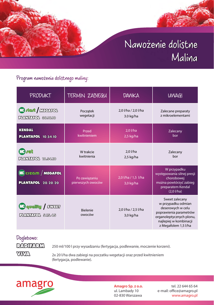 Nawożenie dolistne Malina Program nawożenia dolistnego maliny: PRODUKT TERMIN ZABIEGU DAWKA UWAGI Początek wegetacji 2,0 l/ha / 2,0 l/ha Zalecane preparaty z mikroelementami Przed kwitnieniem 2,0 l/ha 2,5 kg/ha W trakcie kwitnienia 2,5 kg/ha Po zawiązaniu pierwszych owoców Bielenie owoców 3.0 kg/ha Zalecany bor 2,0 l/ha 2,0 l/ha / 1,5 l/ha 3,0 kg/ha 2,0 l/ha / 2,5 l/ha 3,0 kg/ha Zalecany bor W przypadku występowania silnej presji chorobowej można powtórzyć zabieg preparatem Kendal (2,0 l/ha) Sweet zalecany w przypadku odmian deserowych w celu poprawienia parametrów organoleptycznych plonu, najlepiej w kombinacji z Megafolem 1,5 l/ha Doglebowo: 250 ml/100 l przy wysadzaniu (fertygacja, podlewanie, moczenie korzeni). 2x 20 l/ha dwa zabiegi na poczatku wegetacji oraz przed kwitnieniem (fertygacja, podlewanie). Amagro Sp. z o.o. ul. Lambady 10 02-830 Warszawa tel. 22 644 65 64 e-mail: [email protected] www.amagro.pl