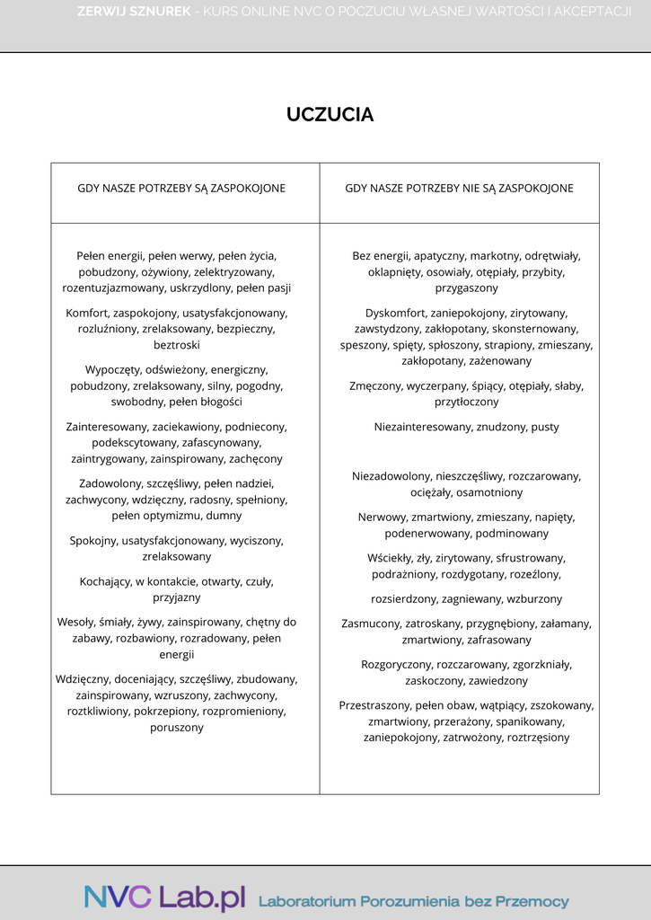 ZERWIJ SZNUREK - KURS ONLINE NVC O POCZUCIU WŁASNEJ WARTOŚCI I AKCEPTACJI UCZUCIA GDY NASZE POTRZEBY SĄ ZASPOKOJONE GDY NASZE POTRZEBY NIE SĄ ZASPOKOJONE Pełen energii, pełen werwy, pełen życia, pobudzony, ożywiony, zelektryzowany, rozentuzjazmowany, uskrzydlony, pełen pasji Bez energii, apatyczny, markotny, odrętwiały, oklapnięty, osowiały, otępiały, przybity, przygaszony Komfort, zaspokojony, usatysfakcjonowany, rozluźniony, zrelaksowany, bezpieczny, beztroski Dyskomfort, zaniepokojony, zirytowany, zawstydzony, zakłopotany, skonsternowany, speszony, spięty, spłoszony, strapiony, zmieszany, zakłopotany, zażenowany Wypoczęty, odświeżony, energiczny, pobudzony, zrelaksowany, silny, pogodny, swobodny, pełen błogości Zainteresowany, zaciekawiony, podniecony, podekscytowany, zafascynowany, zaintrygowany, zainspirowany, zachęcony Zadowolony, szczęśliwy, pełen nadziei, zachwycony, wdzięczny, radosny, spełniony, pełen optymizmu, dumny Spokojny, usatysfakcjonowany, wyciszony, zrelaksowany Kochający, w kontakcie, otwarty, czuły, przyjazny Wesoły, śmiały, żywy, zainspirowany, chętny do zabawy, rozbawiony, rozradowany, pełen energii Wdzięczny, doceniający, szczęśliwy, zbudowany, zainspirowany, wzruszony, zachwycony, roztkliwiony, pokrzepiony, rozpromieniony, poruszony Zmęczony, wyczerpany, śpiący, otępiały, słaby, przytłoczony Niezainteresowany, znudzony, pusty Niezadowolony, nieszczęśliwy, rozczarowany, ociężały, osamotniony Nerwowy, zmartwiony, zmieszany, napięty, podenerwowany, podminowany Wściekły, zły, zirytowany, sfrustrowany, podrażniony, rozdygotany, rozeźlony, rozsierdzony, zagniewany, wzburzony Zasmucony, zatroskany, przygnębiony, załamany, zmartwiony, zafrasowany Rozgoryczony, rozczarowany, zgorzkniały, zaskoczony, zawiedzony Przestraszony, pełen obaw, wątpiący, zszokowany, zmartwiony, przerażony, spanikowany, zaniepokojony, zatrwożony, roztrzęsiony