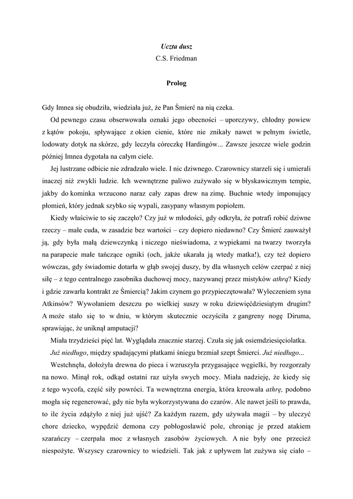 Uczta dusz C.S. Friedman Prolog Gdy Imnea się obudziła, wiedziała już, że Pan Śmierć na nią czeka. Od pewnego czasu obserwowała oznaki jego obecności – uporczywy, chłodny powiew z kątów pokoju, spływające z okien cienie, które nie znikały nawet w pełnym świetle, lodowaty dotyk na skórze, gdy leczyła córeczkę Hardingów... Zawsze jeszcze wiele godzin później Imnea dygotała na całym ciele. Jej lustrzane odbicie nie zdradzało wiele. I nic dziwnego. Czarownicy starzeli się i umierali inaczej niż zwykli ludzie. Ich wewnętrzne paliwo zużywało się w błyskawicznym tempie, jakby do kominka wrzucono naraz cały zapas drew na zimę. Buchnie wtedy imponujący płomień, który jednak szybko się wypali, zasypany własnym popiołem. Kiedy właściwie to się zaczęło? Czy już w młodości, gdy odkryła, że potrafi robić dziwne rzeczy – małe cuda, w zasadzie bez wartości – czy dopiero niedawno? Czy Śmierć zauważył ją, gdy była małą dziewczynką i niczego nieświadoma, z wypiekami na twarzy tworzyła na parapecie małe tańczące ogniki (och, jakże ukarała ją wtedy matka!), czy też dopiero wówczas, gdy świadomie dotarła w głąb swojej duszy, by dla własnych celów czerpać z niej siłę – z tego centralnego zasobnika duchowej mocy, nazywanej przez mistyków athrą? Kiedy i gdzie zawarła kontrakt ze Śmiercią? Jakim czynem go przypieczętowała? Wyleczeniem syna Atkinsów? Wywołaniem deszczu po wielkiej suszy w roku dziewięćdziesiątym drugim? A może stało się to w dniu, w którym skutecznie oczyściła z gangreny nogę Diruma, sprawiając, że uniknął amputacji? Miała trzydzieści pięć lat. Wyglądała znacznie starzej. Czuła się jak osiemdziesięciolatka. Już niedługo, między spadającymi płatkami śniegu brzmiał szept Śmierci. Już niedługo... Westchnęła, dołożyła drewna do pieca i wzruszyła przygasające węgielki, by rozgorzały na nowo. Minął rok, odkąd ostatni raz użyła swych mocy. Miała nadzieję, że kiedy się z tego wycofa, część siły powróci. Ta wewnętrzna energia, która kreowała athrę, podobno mogła się regenerować, gdy nie była wykorzystywana do czarów. Ale nawet jeśli to prawda, to ile życia zdążyło z niej już ujść? Za każdym razem, gdy używała magii – by uleczyć chore dziecko, wypędzić demona czy pobłogosławić pole, chroniąc je przed atakiem szarańczy – czerpała moc z własnych zasobów życiowych. A nie były one przecież niespożyte. Wszyscy czarownicy to wiedzieli. Tak jak z upływem lat zużywa się ciało – podobnie karleje ogień ducha, tli się, a wreszcie gaśnie. Jeśli używa się paliwa nie tylko do podtrzymania życia, ogień wypala się wielokrotnie szybciej. Skąd czerpać moc, by leczyć, równocześnie nie zużywając jej? Jak można patrzeć na siniejące dziecko i nie oczyścić jego płuc, nie tchnąć w nie na nowo życia, nawet jeśli przypłaci się to kilkoma cennymi minutami własnego? Kiedyś te minuty nie miały żadnego znaczenia. Cóż wie na temat czasu młody człowiek, w którego żyłach buzuje moc, domagając się ujścia. Dopiero z wiekiem przychodzi świadomość, że minuty składają się na godziny, godziny – na dni, dni – na lata... A wtedy do drzwi puka Śmierć. Koniec z czarami, obiecała sobie rok temu. Cały czas, jaki jeszcze jej został, poświęci sobie. Zawiadomiła mieszkańców wsi, że już nie będzie mogła ich leczyć. Jeśli chcą, mogą ją za to znienawidzić. Byłaby to wprawdzie niegodziwość po tym wszystkim, co przez lata dla nich zrobiła, ale czy to dziwne? Już taka jest natura ludzka − dobroczyńcy nie powinni oczekiwać wdzięczności. I zaczęło się. Dochodziły ją coraz to nowe plotki. Dziecko umarło na ospę – to jej wina, bo nic nie zrobiła. Ktoś inny zmarł wskutek odniesionych ran – to jej wina, bo była bezduszna. Nieważne, że choroby i urazy to część życia i tylko kosztowne cuda mogą je uleczyć. Nieważne, że przez dwadzieścia lat zużywała swoją własną energię, dokonując tych cudów. Nieważne, że przez to na własnym karku czuje już oddech Śmierci. Tego roku porzuciła mieszkańców i tylko to się teraz dla nich liczyło. Natura ludzka. Imnea pochyliła się nad ogniem i próbowała przegnać pytanie, które prędzej czy później zadaje sobie każdy czarownik: Czy było warto? Próba odpowiedzi była zawsze ryzykowna. Odpowiedz „nie”, a sam wypełnisz swoje ostatnie dni goryczą. Odpowiedz „tak”, a umieranie będzie twoją własną cholerną winą. Z zadumy wyrwało ją pukanie do drzwi. Któż ją odwiedza w tych ostatnich dniach? Przecież całe miasto traktuje ją jak pariasa. Podeszła do ciężkich, dębowych drzwi i otworzyła je. W nikłym świetle zimowego zmierzchu ujrzała dwie osoby. Nie musiała pytać, po co przyszły. Jedna z nich trzymała w ramionach zawiniątko – dziecko, ciasno okutane w kocyk. Poczucie winy i złość połączyły się w bolesne ukłucie w sercu Imnei. Przecież zapowiedziałam, że się wycofuję. Czy nie wystarczy, że odmawiam wam na rynku, w świątyni, na ulicach? Musicie przynosić mi chore dzieci pod same drzwi, żebym was wygoniła? Przez chwilę miała ochotę zatrzasnąć drzwi, ale pielęgnowana przez długie lata gościnność okazała się silniejsza. Burcząc, Imnea odsunęła się na bok, zapraszając przybyszy do środka. W przyćmionej poświacie pieca widziała już wyraźniej: wysoka wychudzona chłopka, a obok niej młoda dziewczyna w równie złym stanie. Takie osoby leczysz i odsyłasz do domu, lecz wiesz, że następnego roku Śmierć i tak się o nie upomni – umrą z głodu, wycieńczenia lub z tysiąca innych przyczyn, na które nie pomogą żadne czary. Dziewczyna wyglądała na twardą, jakby niejeden raz miała do czynienia ze zgnilizną tego świata i zdążyła się już przyzwyczaić do fetoru. To zatrważające u tak młodej osoby. Kobieta natomiast była nap