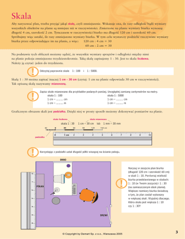 Skala Aby narysowaç plan, trzeba przyjàç jakàÊ skal´, czyli zmniejszenie. Wskazuje ona, ile razy odleg∏oÊç bàdê wymiary wszystkich obiektów na planie sà mniejsze ni˝ w rzeczywistoÊci. Zmierzone na planie wymiary biurka wynoszà: d∏ugoÊç 4 cm, szerokoÊç 2 cm. Tymczasem w rzeczywistoÊci biurko ma d∏ugoÊç 120 cm i szerokoÊç 60 cm. Spróbujmy wi´c ustaliç, ile razy zmniejszono wymiary biurka. W tym celu wystarczy podzieliç rzeczywiste wymiary biurka przez odpowiadajàce im na planie, a wi´c: 120 cm : 4 cm = 30 60 cm : 2 cm = 30 Na podstawie tych obliczeƒ mo˝emy sàdziç, ˝e wszystkie wymiary sprz´tów i odleg∏oÊci mi´dzy nimi na planie pokoju zmniejszono trzydziestokrotnie. Takà skal´ zapisujemy 1 : 30. Jest to skala liczbowa. Nale˝y jà czytaç: jeden do trzydziestu. ! Odczytaj poprawnie skale 1 : 100 i 1 : 5000. Skal´ 1 : 30 mo˝na zapisaç inaczej 1 cm – 30 cm (czytaj: 1 cm na planie odpowiada 30 cm w rzeczywistoÊci). Tak opisanà skal´ nazywamy mianowanà. ! Zapisz skale mianowane dla przyk∏adów podanych poni˝ej. Uwzgl´dnij zamian´ centymetrów na metry. skala 1 : 100 skala 1 : 5000 1 cm – .......... cm 1 cm – .......... cm 1 cm – .......... m 1 cm – .......... m Graficznym obrazem skali jest podzia∏ka. Dzi´ki niej w prosty sposób mo˝emy dokonywaç pomiarów na planie. skala liczbowa skala mianowana skala 1 : 30 30 1 cm – 30 cm lub 1 mm – 30 mm 0 30 60 90 120 0 1 cm 2 3 4 150 cm 5 6 7 8 9 10 podzia∏ka ! Korzystajàc z podzia∏ki ustal d∏ugoÊç pó∏ki wiszàcej na Êcianie pokoju. OKNO 0 1 ! PÓ¸KA 2 3 4 Narysuj w zeszycie plan biurka (d∏ugoÊç 120 cm i szerokoÊç 60 cm) w skali 1 : 10. Porównaj wielkoÊç biurka przedstawionego w skalach: 1 : 10 (w Twoim zeszycie) i 1 : 30 (na zamieszczonym obok planie). Wi´ksze rozmiary biurka Êwiadczà o tym, ˝e plan zosta∏ wykonany w wi´kszej skali. WyjaÊnij dlaczego. Która skala jest wi´ksza 1 : 10 czy 1 : 30? 5 DRZWI 6 © Copyright by Demart Sp. z o.o., Warszawa 2005 3