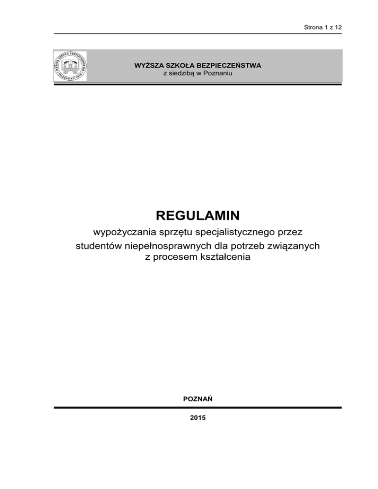 Strona 1 z 12 WYŻSZA SZKOŁA BEZPIECZEŃSTWA z siedzibą w Poznaniu REGULAMIN wypożyczania sprzętu specjalistycznego przez studentów niepełnosprawnych dla potrzeb związanych z procesem kształcenia POZNAŃ 2015 Strona 2 z 12 SPIS TREŚCI: Rozdział 1 Postanowienia ogólne .............................................................................................................. Strona 3 Rozdział 2 Uprawnienia do wypożyczenia sprzętu specjalistycznego …………………………………........ 3 Rozdział 3 Warunki wypożyczenia sprzętu specjalistycznego ………………………………....................... 4 Rozdział 4 Odpowiedzialność za wypożyczenie sprzętu specjalistycznego ……………………………….. 4 Rozdział 5 Zwrot wypożyczonego sprzętu specjalistycznego ……………………………............................ 5 Rozdział 6 Postanowienia końcowe …………………….............................................................................. 5 Załączniki: Załącznik nr 1. Upoważnienie do wypożyczenia sprzętu specjalistycznego/wypełnienia i podpisania formularza wypożyczenia sprzętu specjalistycznego ………………………………………………………… Załącznik nr 2. Wniosek wypożyczenia sprzęty specjalistycznego przez studenta niepełnosprawnego dla potrzeb związanych z procesem kształceni ……………………………………………………………… 6 7 Załącznik nr 3. Umowa użyczenia ……………………………………………………………..……………… 9 Załącznik nr 4. Protokół przekazania sprzętu specjalistycznego ………………………………………….. 11 Załącznik nr 5. Protokół zwrotu wypożyczonego sprzętu specjalistycznego …………………………….. 12 Strona 3 z 12 Rozdział 1 POSTANOWIENIA OGÓLNE §1 1. Na podstawie art. 13 ust. 1 pkt. 9 ustawy z dnia 27 lipca 2005 r. Prawo o szkolnictwie wyższym (Dz.U. z 2005 r. Nr 164, poz. 1365, z późn. zm.) oraz postanowień § 5 pkt. 12 Statutu Wyższej Szkoły Bezpieczeństwa, ustanawia się Regulamin wypożyczenia sprzętu specjalistycznego przez studentów niepełnosprawnych dla potrzeb związanych z procesem kształcenia zwany dalej Regulaminem. 2. Regulamin określa zasady wypożyczenia sprzętu specjalistycznego przez studentów, będącymi osobami niepełnosprawnymi do pełnego udziału w procesie kształcenia. 3. Przepisy Regulaminu stosuje się do osób posiadających status studenta Wyższej Szkoły Bezpieczeństwa z siedzibą w Poznaniu oraz aktualne orzeczenie o niepełnosprawności. §2 Użyte w niniejszym Regulaminie określenia oznaczają: 1) Uczelnia – Wyższa Szkoła Bezpieczeństwa z siedzibą w Poznaniu; 2) sprzęt specjalistyczny – sprzęt wyłączony z ogólnego dostępu, znajdujący się w bibliotece Wyższej Szkoły Bezpieczeństwa z siedzibą w Poznaniu. Zakupiony z dotacji udzielanej z budżetu państwa na podstawie art. 94 ust. 4a ustawy z dnia 27 lipca 2005 r. Prawo o szkolnictwie wyższym (Dz.U. z 2005 r. Nr 164, poz. 1365, z późn. zm.) na zadania związane ze stwarzaniem studentom będącymi osobami niepełnosprawnymi warunków do pełnego udziału w procesie kształcenia w Wyższej Szkole Bezpieczeństwa; 3) studenci niepełnosprawni – osoby posiadające status studenta Wyższej Szkoły Bezpieczeństwa oraz aktualne orzeczenie o niepełnosprawności; 4) dokument stwierdzający niepełnosprawność – legitymacja, orzeczenie lekarskie oraz każdy inny dokument potwierdzający niepełnosprawność studenta; 5) dysponent – osoba upoważniona przez studenta niepełnosprawnego do wypożyczenia w jego imieniu sprzętu specjalistycznego; 6) wypożyczenie sprzętu specjalistycznego – umowa użyczenia w rozumieniu art. 710 i n. kodeksu cywilnego; 7) biblioteka – miejsce należące do Uczelni, w którym można wypożyczyć sprzęt specjalistyczny. §3 1. Wypożyczenie sprzętu specjalistycznego, o którym mowa w niniejszym Regulaminie, jest przeznaczone dla studentów niepełnosprawnych Uczelni. 2. Właścicielem sprzętu specjalistycznego jest Wyższa Szkoła Bezpieczeństwa z siedzibą w Poznaniu. 3. Miejscem w którym dochodzi do wypożyczenia sprzętu specjalistycznego jest biblioteka Uczelni. Rozdział 2 UPRAWNIENIA DO WYPOŻYCZENIA SPRZĘTU SPECJALISTYCZNEGO §4 1. Ze sprzętu specjalistycznego w ramach wypożyczenia mogą korzystać studenci niepełnosprawni: 1) legitymujący się orzeczeniem o stopniu niepełnosprawności; 2) posiadający uregulowany status studenta w chwili składania wniosku o wypożyczenie; 3) nie przybywający na długoterminowym urlopie od zajęć, w tym przebywający na urlopie udzielonym przez dziekana wydziału oraz studenci wyjeżdżający na studia zagraniczne. 2. Uprawniona osoba o której mowa w ust. 1 może wypożyczyć sprzęt specjalistyczny za pośrednictwem wyznaczonego przez nią Dysponenta. Dysponent powinien posiadać odpowiednie upoważnienie, którego wzór stanowi załącznik nr 1 niniejszego Regulaminu. Strona 4 z 12 Rozdział 3 WARUNKI WYPOŻYCZENIA SPRZĘTU SPECJALISTYCZNEGO §5 1. Miejscem w którym można wypożyczyć sprzęt specjalistyczny jest biblioteka Uczelni. 2. Studenci niepełnosprawni mogą wypożyczyć sprzęt specjalistyczny bezpłatnie na okres nie dłuższy niż jeden semestr. 3. Wypożyczenia sprzętu specjalistycznego może dokonać zgodnie z § 4 ust. 1 student niepełnosprawnych lub zgodnie z § 4 ust. 2 dysponent. 4. Wymogiem formalnym jest wypełnienie wniosku wypożyczenia sprzętu specjalistycznego zgodnie z załącznikiem nr 2 do niniejszego Regulaminu oraz umowy wypożyczenia sprzętu specjalistycznego zawieranej ze studentem, według wzoru stanowi załącznik nr 3 do Regulaminu. 5. Do wniosku o wypożyczenie sprzętu student dołącza kopię orzeczenia o stopniu niepełnosprawność studenta. 6. W razie, gdy okres na jaki orzeczono niepełnosprawność upływa przed koń