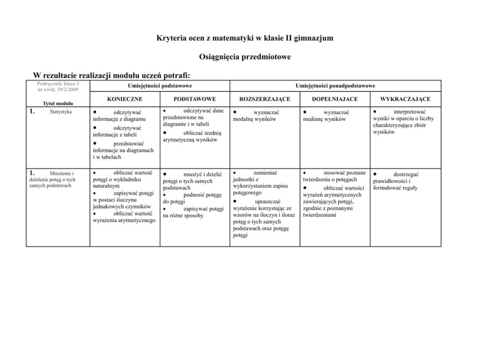 Kryteria ocen z matematyki w klasie II gimnazjum Osiągnięcia przedmiotowe W rezultacie realizacji modułu uczeń potrafi: Podręcznik klasa 2 nr ewid. 39/2/2009 Umiejętności podstawowe KONIECZNE Tytuł modułu 1. Statystyka odczytywać informacje z diagramu odczytywać informacje z tabeli przedstawiać informacje na diagramach i w tabelach 1. Mnożenie i dzielenie potęg o tych samych podstawach obliczać wartość potęgi o wykładniku naturalnym zapisywać potęgi w postaci iloczynu jednakowych czynników obliczać wartość wyrażenia arytmetycznego Umiejętności ponadpodstawowe ROZSZERZAJĄCE PODSTAWOWE odczytywać dane przedstawione na diagramie i w tabeli DOPEŁNIAJACE wyznaczać modalną wyników wyznaczać medianę wyników zamieniać jednostki z wykorzystaniem zapisu potęgowego stosować poznane twierdzenia o potęgach obliczać średnią arytmetyczną wyników mnożyć i dzielić potęgi o tych samych podstawach podnosić potęgę do potęgi zapisywać potęgi na różne sposoby WYKRACZAJĄCE upraszczać wyrażenie korzystając ze wzorów na iloczyn i iloraz potęg o tych samych podstawach oraz potęgę potęgi obliczać wartości wyrażeń arytmetycznych zawierających potęgi, zgodnie z poznanymi twierdzeniami interpretować wyniki w oparciu o liczby charakteryzujące zbiór wyników dostrzegać prawidłowości i formułować reguły Podręcznik klasa 2 nr ewid. 39/2/2009 Umiejętności podstawowe KONIECZNE Tytuł modułu Mnożenie i dzielenie potęg o tych samych wykładnikach 1. obliczać potęgi liczb o wykładnikach naturalnych 1. Potęga o wykładniku całkowitym obliczać potęgi o wykładniku naturalnym zapisywać potęgi w postaci iloczynu jednakowych czynników obliczać wartość wyrażeń arytmetycznych zgodnie z kolejnością wykonywania działań wyznaczyć odwrotność danej liczby przedstawić liczbę w postaci potęgi o wykładniku całkowitym 1. Wielokąty wpisane w okrąg rozpoznawać wielokąty wpisane w okrąg wskazywać środek okręgu opisanego na trójkącie Umiejętności ponadpodstawowe ROZSZERZAJĄCE PODSTAWOWE mnożyć i dzielić potęgi o tych samych wykładnikach obliczać wartość wyrażeń, stosując wzory dotyczące działań na potęgach przekształcać wyrażenia algebraiczne do najprostszej postaci przedstawiać wyrażenia algebraiczne zawierające potęgi o wykładnikach całkowitych w najprostszej postaci obliczać potęgi o wykładniku ujemnym stosować poznane twierdzenia o potęgach do potęg o wykładnikach całkowitych korzystać z poznanych wzorów dotyczących potęg wyznaczać konstrukcyjnie środek okręgu opisanego na trójkącie: ostrokątnym, prostokątnym, rozwartokątnym opisać okrąg na trójkącie DOPEŁNIAJACE formułować reguły posługiwać się poznanymi pojęciami matematycznymi doprowadzać wyrażenia algebraiczne do najprostszej postaci zgodnie z poznanymi regułami WYKRACZAJĄCE zapisywać liczby w notacji wykładniczej i zamieniać notację wykładniczą na postać dziesiętną formułować reguły posługiwać się poznanymi pojęciami matematycznymi badać własności czworokątów wpisanych w okrąg wyznaczać, o ile to możliwe, środki okręgów opisanych na czworokątach zapisywać liczby z wykorzystaniem dziesiątkowego pozycyjnego systemu liczenia i całkowitych wykładników liczby 10 korzystać z własności wielokątów wpisanych w okrąg formułować warunki określające możliwości wpisywania wielokątów w okrąg dostrzegać analogie formułować hipotezy Podręcznik klasa 2 nr ewid. 39/2/2009 Umiejętności podstawowe KONIECZNE Tytuł modułu Umiejętności ponadpodstawowe ROZSZERZAJĄCE PODSTAWOWE DOPEŁNIAJACE 1. Położenie prostej względem okręgu rozpoznawać na rysunku styczne i sieczne badać wzajemne położenie prostych: siecznej i stycznej do okręgu wyznaczać konstrukcyjnie styczną do okręgu 1. Wielokąty opisane na okręgu rozpoznawać trójkąty opisane na okręgu rozpoznawać wielokąty opisane na okręgu wyznaczać środek okręgu wpisanego w trójkąt rysować wielokąty opisane na okręgu 1. obliczać i szacować z zadaną dokładnością długość okręgu, gdy dany jest jego promień obliczać pole koła, gdy dana jest długość promienia lub średnicy obliczać długość promienia, gdy dana jest długość okręgu obliczać długość promienia lub średnicy, gdy dane jest pole koła obliczać pole pierścienia kołowego obliczać długość łuku obliczać pole wycinka koła posługiwać się przybliżeniami dziesiętnymi liczby π obliczać wartości liczbowe wyrażeń algebraicznych redukować wyrazy podobne w sumie algebraicznej mnożyć sumę algebraiczną przez jednomian wyłączać wspólny czynnik poza nawias mnożyć sumy algebraiczne Obwód i pole koła 1. Mnożenie sum algebraicznych przedstawiać sumę w postaci iloczynu znajdować punkty płaszczyzny spełniające podane warunki WYKRACZAJĄCE uzasadnić konstrukcję stycznej do okręgu wykorzystywać własności wielokątów opisanych na okręgu określać własności odcinka kołowego obliczać pole odcinka kołowego Podręcznik klasa 2 nr ewid. 39/2/2009 Umiejętności podstawowe KONIECZNE Tytuł modułu Umiejętności ponadpodstawowe ROZSZERZAJĄCE PODSTAWOWE DOPEŁNIAJACE WYKRACZAJĄCE 1. zapisywać kwadrat sumy dwóch wyrażeń w postaci sumy algebraicznej zapisywać kwadrat różnicy dwóch wyrażeń w postaci sumy algebraicznej przekształcać kwadrat sumy i różnicy dwóch wyrażeń na sumę algebraiczną z wykorzystaniem wzorów skróconego mnożenia stosować praktycznie wzory na kwadrat sumy i kwadrat różnicy do obliczania wartości kwadratów liczb naturalnych przekształcać wyrażenia algebraiczne z wykorzystaniem wzorów skróconego mnożenia uzasadnić geometrycznie wzór na kwadrat sumy rozwiązywać równania z wykorzystaniem wzorów skróconego mnożenia na kwadrat sumy i kwadrat różnicy uzasadniać proste prawidłowości z wykorzystaniem wzorów na kwadrat sumy i kwadrat róż