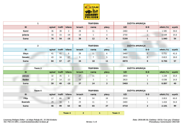 1 TRAFIENIA ZUŻYTA AMUNICJA ID zginał trafił bilans brzuch ramię plecy UZI D-D efekt.(%) wynik Karol 36 39 3 29 11 5 2460 0 1.585 39.0 Jelenio 34 15 -19 10 1 4 2730 1 0.549 15.0 Suma 70 54 -16 39 12 9 5190 1 1.040 54 2 TRAFIENIA ZUŻYTA AMUNICJA ID zginał trafił bilans brzuch ramię plecy UZI D-D efekt.(%) wynik Slayx 41 41 0 29 11 6 5460 0 0.751 41.0 Smooki 43 16 -27 5 7 5 2610 0 0.613 16.0 Suma 84 57 -27 34 18 11 8070 0 0.706 57 Team 3 TRAFIENIA ZUŻYTA AMUNICJA ID zginał trafił bilans brzuch ramię plecy UZI D-D efekt.(%) wynik Janusz 32 35 3 27 11 2 2850 0 1.228 35.0 Radon 27 14 -13 10 3 1 2610 1 0.536 14.0 Suma 59 49 -10 37 14 3 5460 1 0.897 49 Team 4 TRAFIENIA ZUŻYTA AMUNICJA ID zginał trafił bilans brzuch ramię plecy UZI D-D efekt.(%) wynik Filip 17 65 48 42 54 24 2310 1 2.813 65.0 Dominik 29 34 5 23 11 3 2400 1 1.416 34.0 Suma 46 99 53 65 65 27 4710 2 2.101 99 Team 4 Laserowy Poligon Zoltar - ul.Aleja Pokoju 81, 31-564 Kraków Tel.:792-111-091, e-mail:[email protected] 2 1 Strona 1 z 8 Team 3 Data: 2016-08-16; Godzina: 18:54; Czas gry: 25minut Prowadzący: Gamemaster ZOLTAR 99 Laserowy Poligon Zoltar - ul.Aleja Pokoju 81, 31-564 Kraków Tel.:792-111-091, e-mail:[email protected] 57 54 Strona 2 z 8 49 Data: 2016-08-16; Godzina: 18:54; Czas gry: 25minut Prowadzący: Gamemaster ZOLTAR 1 TRAFIENIA ZUŻYTA AMUNICJA ID zginał trafił bilans brzuch ramię plecy UZI efekt.(%) wynik Slayx 44 53 9 37 12 8 5700 0.930 53.0 Janusz 33 48 15 37 11 8 4290 1.119 48.0 Dominik 28 47 19 33 9 8 3510 1.339 47.0 Filip 51 38 -13 22 17 6 3870 0.982 38.0 Karol 46 32 -14 30 3 1 3210 0.997 32.0 Radon 39 26 -13 23 1 2 2940 0.884 26.0 Jelen 28 21 -7 19 1 1 2070 1.014 21.0 Troll 44 20 -24 11 8 1 3360 0.595 20.0 Suma 313 285 -28 212 62 35 28950 0.984 285 Laserowy Poligon Zoltar - ul.Aleja Pokoju 81, 31-564 Kraków Tel.:792-111-091, e-mail:[email protected] Strona 3 z 8 Data: 2016-08-16; Godzina: 19:38; Czas gry: 25minut Prowadzący: Gamemaster ZOLTAR 1 TRAFIENIA ZUŻYTA AMUNICJA ID zginał trafił bilans brzuch ramię plecy UZI Mhgun ATank efekt.(%) wynik Slayx 43 44 2 28 18 8 7050 0 0 0.624 44.0 Bot 23 42 19 21 30 20 2460 870 30 1.250 42.0 Mit 39 30 -9 21 3 6 4290 0 0 0.699 30.0 Filip 27 17 -9 10 6 2 4350 0 0 0.391 17.0 Suma 132 133 3 80 57 36 18150 870 30 0.698 133 2 TRAFIENIA ZUŻYTA AMUNICJA ID zginał trafił bilans brzuch ramię plecy UZI Mhgun ATank efekt.(%) wynik Janusz 34 49 15 31 18 7 5580 0 0 0.878 49.0 Karol 34 42 8 37 8 3 3330 0 0 1.261 42.0 Radon 37 20 -17 13 2 5 2970 0 0 0.673 20.0 Jelen 28 19 -9 17 1 1 1650 0 0 1.152 19.0 Suma 133 130 -3 98 29 16 13530 0 0 0.961 130 Laserowy Poligon Zoltar - ul.Aleja Pokoju 81, 31-564 Kraków Tel.:792-111-091, e-mail:[email protected] 1 2 133 130 Strona 4 z 8 Data: 2016-08-16; Godzina: 20:20; Czas gry: 32minut Prowadzący: Gamemaster ZOLTAR Drużyny Miejsce 4 Laserowy Poligon Zoltar - ul.Aleja Pokoju 81, 31-564 Kraków Tel.:792-111-091, e-mail:[email protected] Rozgrywki Nazwa 1 2 3 Suma 1 54 - 133 187 2 57 - 130 187 Team 4 99 - - 99 Team 3 49 - - 49 Strona 5 z 8 Data: 2016-08-16 Prowadzący: Gamemaster ZOLTAR Zestawienie wg wyniku Miejsce TRAFIENIA ZUŻYTA AMUNICJA ID zginał trafił bilans brzuch ramię plecy UZI D-D Mhgun aTank efekt.(%) wynik Slayx 94.88 102.70 7.83 70.30 29.65 16.20 13334.25 0.00 0.00 0.00 0.770 102.70 Dominik 68.40 97.20 28.80 67.20 24.00 13.20 7092.00 1.20 0.00 0.00 1.370 97.20 Janusz 73.25 97.03 23.78 70.58 28.85 12.38 9199.50 0.00 0.00 0.00 1.055 97.03 4 Filip 71.28 93.03 21.75 57.45 60.55 25.25 7662.75 0.80 0.00 0.00 1.214 93.03 5 Karol 86.85 83.05 -3.80 70.33 16.20 6.68 6617.25 0.00 0.00 0.00 1.255 83.05 6 Bot 43.13 78.75 35.63 39.38 56.25 37.50 4612.50 0.00 1631.25 56.25 1.250 78.75 7 Mit 73.13 56.25 -16.88 39.38 5.63 11.25 8043.75 0.00 0.00 0.00 0.699 56.25 8 Troll 105.60 48.00 -57.60 26.40 19.20 2.40 8064.00 0.00 0.00 0.00 0.595 48.00 9 Radon 75.93 44.50 -31.43 34.53 4.45 5.53 6296.25 0.80 0.00 0.00 0.707 44.50 10 Jelen 59.85 43.01 -16.84 38.74 2.14 2.14 4030.88 0.00 0.00 0.00 1.067 43.01 11 Smooki 103.20 38.40 -64.80 12.00 16.80 12.00 6264.00 0.00 0.00 0.00 0.613 38.40 12 Jelenio 81.60 36.00 -45.60 24.00 2.40 9.60 6552.00 2.40 0.00 0.00 0.549 36.00 Laserowy Poligon Zoltar - ul.Aleja Pokoju 81, 31-564 Kraków Tel.:792-111-091, e-mail:[email protected] Strona 6 z 8 Data: 2016-08-16 Prowadzący: Gamemaster ZOLTAR Zestawienie wg bilansu Miejsce TRAFIENIA ZUŻYTA AMUNICJA ID zginał trafił bilans brzuch ramię plecy UZI D-D Mhgun aTank efekt.(%) wynik Bot 43.13 78.75 35.63 39.38 56.25 37.50 4612.50 0.00 1631.25 56.25 1.250 78.75 Dominik 68.40 97.20 28.80 67.20 24.00 13.20 7092.00 1.20 0.00 0.00 1.370 97.20 Janusz 73.25 97.03 23.78 70.58 28.85 12.38 9199.50 0.00 0.00 0.00 1.055 97.03 4 Filip 71.28 93.03 21.75 57.45 60.55 25.25 7662.75 0.80 0.00 0.00 1.214 93.03 5 Slayx 94.88 102.70 7.83 70.30 29.65 16.20 13334.25 0.00 0.00 0.00 0.770 102.70 6 Karol 86.85 83.05 -3.80 70.33 16.20 6.68 6617.25 0.00 0.00 0.00 1.255 83.05 7 Jelen 59.85 43.01 -16.84 38.74 2.14 2.14 4030.88 0.00 0.00 0.00 1.067 43.01 8 Mit 73.13 56.25 -16.88 39.38 5.63 11.25 8043.75 0.00 0.00 0.00 0.699 56.25 9 Radon 75.93 44.50 -31.43 34.53 4.45 5.53 6296.25 0.80 0.00 0.00 0.707 44.50 10 Jelenio 81.60 36.00 -45.60 24.00 2.40 9.60 6552.00 2.40 0.00 0.00 0.549 36.00 11 Troll 105.60 48.00 -57.60 26.40 19.20 2.40 8064.00 0.00 0.00 0.00 0.595 48.00 12 Smooki 103.20 38.40 -64.80 12.00 16.80 12.00 6264.00 0.00 0.00 0.00 0.613 38.40 Laserowy Poligon Zoltar - ul.Aleja Pokoju 81, 31-564 Kraków Tel.:792-111-091, e-mail:[email protected] Strona 7 z 8 Data: 2016-08-16 Prowadzący: Gamemaster ZOLTAR Zestawienie wg efektywności Miejsce TRAFIENIA ZUŻYTA AMUNICJA ID zginał trafił bilans brzuch ramię plecy UZI D-D Mhgun aTank efekt.(%) wynik Dominik 68.40 97.20 28.80 67.20 24.00 13.20 7092.00 1.20 0.00 0.00 1.370 97.20 Karol 86.85 83.05 -3.80 70.33 16.20 6.68 6617.25 0.00 0.00 0.00 1.255 83.05 Bot 43.13 78.75 35.63 39.38 56.25 37.50 4612.50 0.00 1631.25 56.25 1.250 78.75 4