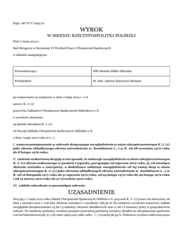 Sygn. akt VI U 2393/12 WYROK W IMIENIU RZECZYPOSPOLITEJ POLSKIEJ Dnia 7 maja 2013 r. Sąd Okręgowy w Szczecinie VI Wydział Pracy i Ubezpieczeń Społecznych w składzie następującym: Przewodniczący: SSO Monika Miller-Młyńska Protokolant: St. sekr. sądowy Katarzyna Herman po rozpoznaniu na rozprawie w dniu 7 maja 2013 r. w S. sprawy K. J. (1) przeciwko Zakładowi Ubezpieczeń Społecznych Oddziałowi w S. o wysokość emerytury na skutek odwołania K. J. (1) od decyzji Zakładu Ubezpieczeń Społecznych Oddziału w S. z dnia 7 maja 2012 roku nr (...) I. umarza postępowanie w zakresie dotyczącym uwzględnienia w stażu ubezpieczeniowym K. J. (1) jako okresu składkowego okresu zatrudnienia w Kombinacie (...) w K. od 28 września 1972 roku do 8 lutego 1976 roku; II. zmienia zaskarżoną decyzję w ten sposób, że nakazuje uwzględnienie w stażu ubezpieczeniowym K. J. (1) okresu wskazanego w punkcie I wyroku, poczynając od stycznia 2012 roku, tj. od miesiąca złożenia wniosku o emeryturę, a dodatkowo nakazuje uwzględnienie od tej samej daty w stażu ubezpieczeniowym K. J. (1) jako okresów składkowych okresu zatrudnienia w Kombinacie (...) w K. od 16 listopada 1971 roku do 31 stycznia 1972 roku, od 24 lutego 1972 roku do 29 lutego 1972 roku i od 13 marca 1972 roku do 27 września 1972 roku; III. oddala odwołanie w pozostałym zakresie. UZASADNIENIE Decyzją z 7 maja 2012 roku Zakład Ubezpieczeń Społecznych Oddział w S. przyznał K. J. (1) prawo do emerytury od dnia 1 stycznia 2012 r. (od daty złożenia wniosku) w wysokości 796,95 zł. Do ustalenia wysokości emerytury Zakład uwzględnił ubezpieczonemu 13 lat i 5 miesięcy okresów składkowych oraz 11 lat i 6 miesięcy pracy w gospodarstwie rolnym. Do ustalenia podstawy wymiaru przyjęto przeciętną podstawę wymiaru składek na ubezpieczenia społeczne z 20 lat kalendarzowych, tj. z lat 1960-1963 oraz 1966-1980. (...) wyniósł 36,34 %. Podstawa wymiaru obliczona przez pomnożenie wwpw 36,34% przez kwotę bazową 2822,66 zł wyniosła 1025,75 zł, po waloryzacji od 1 marca 2012 r. 1128,43 zł. Pismem z 11 czerwca 2012 r. K. J. (1) odwołał się od powyższej decyzji, wnosząc o jej zmianę poprzez zaliczenie do jego stażu pracy okresu zatrudnienia w PGR S., w PGR P., w Zakładzie (...) oraz Spółdzielni (...). Ubezpieczony wskazał, że dokumentacja z okresów zatrudnienia we wskazanych zakładach pracy uległa zniszczeniu, jednakże fakt jego pracy mogą potwierdzić świadkowie. Dodatkowo wskazał, że organ rentowy nie wziął pod uwagę najbardziej korzystnego okresu do naliczenia świadczenia. Ubezpieczony wskazał, że w okresach zatrudnienia nie uwzględnionych przez ZUS, jego wynagrodzenie było zbliżone do wynagrodzeń wskazanych w dokumentacji przesłanej z Ł. dotyczącej wysokości płac z 40 miesięcy pracy. Organ rentowy wniósł o oddalenie odwołania w całości. W uzasadnieniu wskazano, że do obliczenia podstawy wymiaru emerytury przyjęto wynagrodzenie wynikające z przedłożonych dokumentów oraz wynagrodzenie minimalne. Odnośnie możliwości uwzględnienia dodatkowych okresów zatrudnienia i wynagrodzeń otrzymywanych w tym czasie organ rentowy wyjaśnił, że ubezpieczony nie przedłożył żadnej dokumentacji potwierdzających sporne zatrudnienie oraz wskazujących na wysokość osiągniętego wówczas wynagrodzenia. W piśmie procesowym z 6 listopada 2012 r. ubezpieczony sprecyzował, że domaga się doliczenia do stażu pracy okresu zatrudnienia od 15 lutego 1959 r. do 20 października 1965 r. w Zakładzie (...) w P., okresu zatrudnienia od 15 marca 1968 r. do 14 listopada 1971 r. w Państwowym Gospodarstwie Rolnym w S., od 1 marca 1976 r. do 30 października 1978 r. w Zakładzie (...) oraz od 16 listopada 1971 r. do 8 lutego 1976 r. w PGR w P.. Dodatkowo wskazał, że wnosi o obliczenie podstawy wymiaru należnej mu emerytury z uwzględnieniem - za okresy zatrudnienia za które nie dysponuje dokumentacją dotyczącą płac - średnich zarobków wyliczonych na podstawie zarobków wynikających z zachowanej dokumentacji płacowej. Sąd ustalił następujący stan faktyczny: K. J. (1)urodził się (...)roku. W dniu 23 stycznia 2012 roku złożył w organie rentowym wniosek o przyznanie mu prawa do emerytury. Okoliczność niesporna, a nadto dowód: wniosek - k. 1-3 plik I akt rentowych. Decyzją z 7 maja 2012 roku Zakład Ubezpieczeń Społecznych Oddział w S. przyznał K. J. (1) prawo do emerytury od dnia 1 stycznia 2012 r. (od daty złożenia wniosku) w wysokości 796,95 zł. Do ustalenia wysokości emerytury Zakład uwzględnił 13 lat i 5 miesięcy okresów składkowych oraz 11 lat 6 miesięcy pracy w gospodarstwie rolnym. Do ustalenia podstawy wymiaru przyjęto przeciętną podstawę wymiaru składek na ubezpieczenia społeczne z 20 lat kalendarzowych tj. z lat 1960-1963, 1966-1980. (...) wyniósł 36,34 %. Podstawa wymiaru obliczona przez pomnożenie wwpw 36,34% przez kwotę bazową 2822,66 zł wyniosła 1025,75 zł, po waloryzacji od 1 marca 2012 r. - 1128,43 zł. Dowód: decyzja z 7.05.2012 r. - k. 56 plik I akt rentowych Na potrzeby zaskarżonej decyzji organ rentowy uznał za udowodnione przez ubezpieczonego okresy: - zatrudnienia w Zakładzie (...) w P. od dnia 31 grudnia 1960 r. do 1 stycznia 1963 r. - zatrudnienia w Przedsiębiorstwie Budownictwa Rolniczego (...) od dnia 20 listopada 1966 r. do 19 września 1967 r. - zatrudnienia w Zakładzie (...) od 2 października 1967 r. do 8 marca 1968 r. - zatrudnienia w Państwowym Gospodarstwie Rolnym w S. od 15 marca 1968 r. do 14 listopada 1971 r. - zatrudnienia w Kombinacie (...) - Zakład (...) w K. (P. P.) : od 1 lutego 1972 r. do 23 lutego 1972 r., od 1 marca 1972 r. do 12 marca 1972 r., od 1 lipca 1973 r. do 22 października 1973 r., od 1 listopada 1973 r. do 24 grudnia 1973 r., od 1 stycznia 1974 r. do 15 lutego 1974 r., od 1 marca 1974 r. do 24 marca 1974 r., od 1 kwietnia 1974 r. do 24 kwietnia 1974 r., od 1 maja 1974 r