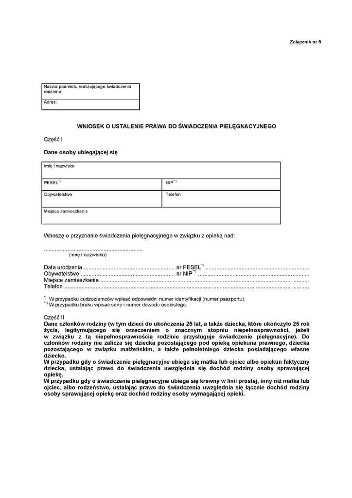 Załącznik nr 5 W przypadku gdy o prawo do świadczenia pielęgnacyjnego ubiega się rodzina zastępcza spokrewniona z dzieckiem, na której zgodnie z przepisami ustawy z dnia 25 lutego 1964 r. — Kodeks rodzinny i opiekuńczy (Dz. U. Nr 9, poz. 59, z późn. zm.) ciąży obowiązek alimentacyjny, ustalając prawo do świadczenia uwzględnia się dochód rodziny zastępczej oraz dochód tego dziecka. Przy ustalaniu dochodu w składzie rodziny uwzględnia się również dziecko, którego niepełnosprawność uprawnia do pobierania świadczenia pielęgnacyjnego, nawet jeżeli posiada ono własne dziecko. (wypełnić w przypadku nieubiegania się o zasiłek rodzinny) W skład rodziny wchodzą: 1 ............................................. imię i nazwisko 2 ............................................... imię i nazwisko 3 ............................................... imię i nazwisko 4 ............................................... imię i nazwisko PESEL urząd skarbowy J urząd skarbowy PESEL1 urząd skarbowy PESEL1 urząd skarbowy PESEL1 W przypadku cudzoziemców wpisać odpowiedni numer identyfikacji (numer paszportu). Część III Inne dane (wypełnić w przypadku nieubiegania się o zasiłek rodzinny) 1. Łączna kwota alimentów świadczonych na rzecz innych osób wyniosła w roku 2. Dochód utracony z roku ............. *) wyniósł ......... zł... gr miesięcznie. 3. Dochód uzyskany w roku ........... **) wyniósł ......... zł... gr miesięcznie. zł. gr. Wpisać rok, z którego dochód stanowi podstawę ustalenia dochodu rodziny. Wpisać rok, w którym osoba uzyskała dochód, po roku stanowiącym podstawę ustalenia dochodu rodziny. Część IV Oświadczenie służące ustaleniu prawa do świadczenia pielęgnacyjnego Oświadczam, że: — — — — — — — — powyższe dane są prawdziwe, zapoznałam/em się z warunkami uprawniającymi do świadczenia pielęgnacyjnego, nie mam ustalonego prawa do emerytury, renty, renty socjalnej, zasiłku stałego, zasiłku przedemerytalnego lub świadczenia przedemerytalnego, osoba wymagająca opieki: a) nie pozostaje w związku małżeńskim, b) nie została umieszczona w rodzinie zastępczej, z wyjątkiem rodziny zastępczej spokrewnionej z dzieckiem, albo, w związku z koniecznością kształcenia, rewalidacji lub rehabilitacji w placówce zapewniającej całodobową opiekę, w tym w specjalnym ośrodku szkolno-wychowawczym i nie korzysta w niej z całodobowej opieki przez więcej niż 5 dni w tygodniu, z wyjątkiem zakładów opieki zdrowotnej, osoba w rodzinie nie ma ustalonego prawa do wcześniejszej emerytury na to dziecko, osoba w rodzinie nie ma ustalonego prawa do dodatku do zasiłku rodzinnego z tytułu opieki nad dzieckiem w okresie korzystania z urlopu wychowawczego albo świadczenia pielęgnacyjnego, nie jestem zatrudniona/y ani nie wykonuję innej pracy zarobkowej, członkowi rodziny nie przysługuje za granicą świadczenie na pokrycie wydatków związanych z pielęgnacją tej osoby, chyba że przepisy o koordynacji systemów zabezpieczenia społecznego lub dwustronne umowy o zabezpieczeniu społecznym stanowią inaczej. W przypadku zmiany liczby członków rodziny, wyjazdu członka rodziny poza granicę Rzeczypospolitej Polskiej, z wyjątkiem wyjazdu lub pobytu turystycznego, leczniczego lub związanego z podjęciem przez dziecko kształcenia poza granicami Rzeczypospolitej Polskiej, uzyskania dochodu lub innych zmian mających wpływ na prawo do świadczenia pielęgnacyjnego, zwłaszcza ukończenia przez dziecko 25 roku życia, osoba ubiegająca się jest zobowiązana niezwłocznie powiadomić o tych zmianach podmiot realizujący świadczenia rodzinne. (data, podpis osoby ubiegającej się) Do wniosku dołączam następujące dokumenty: 1) ......................................................................... 2) ......................................................................... 3) ......................................................................... 4) ......................................................................... Pouczenie Świadczenie pielęgnacyjne z tytułu rezygnacji z zatrudnienia lub innej pracy zarobkowej przysługuje osobom, na których zgodnie z przepisami ustawy z dnia 25 lutego 1964 r. — Kodeks rodzinny i opiekuńczy (Dz. U. Nr 9, poz. 59, z późn. zm.) ciąży obowiązek alimentacyjny, a także opiekunowi faktycznemu dziecka, jeżeli nie podejmuje lub rezygnuje z zatrudnienia lub innej pracy zarobkowej w celu sprawowania opieki nad dzieckiem legitymującym się orzeczeniem o niepełnosprawności łącznie ze wskazaniami: konieczności stałej lub długotrwałej opieki lub pomocy innej osoby w związku ze znacznie ograniczoną możliwością samodzielnej egzystencji oraz konieczności stałego współudziału na co dzień opiekuna dziecka w procesie jego leczenia, rehabilitacji i edukacji, albo osobą legitymującą się orzeczeniem o znacznym stopniu niepełnosprawności (art. 17 ust. 1 ustawy z dnia 28 listopada 2003 r. o świadczeniach rodzinnych, zwanej dalej „ustawą"). W przypadku gdy o świadczenie pielęgnacyjne ubiega się matka lub ojciec albo opiekun faktyczny dziecka, ustalając prawo do świadczenia uwzględnia się dochód rodziny osoby sprawującej opiekę. W przypadku gdy o świadczenie pielęgnacyjne ubiega się krewny w linii prostej, inny niż matka lub ojciec, albo rodzeństwo, ustalając prawo do świadczenia uwzględnia się łącznie dochód rodziny osoby sprawującej opiekę oraz dochód rodziny osoby wymagającej opieki. W przypadku gdy o prawo do świadczenia pielęgnacyjnego ubiega się rodzina zastępcza spokrewniona z dzieckiem, na której zgodnie z przepisami ustawy z dnia 25 lutego 1964 r. — Kodeks rodzinny i opiekuńczy ciąży obowiązek alimentacyjny, ustalając prawo do świadczenia uwzględnia się dochód rodziny zastępczej oraz dochód tego dziecka. Przy ustalaniu dochodu w składzie rodziny uwzględnia się również dziecko, 