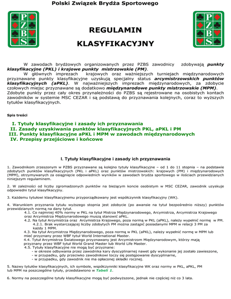 Polski Związek Brydża Sportowego REGULAMIN KLASYFIKACYJNY W zawodach brydżowych organizowanych przez PZBS zawodnicy zdobywają punkty klasyfikacyjne (PKL) i krajowe punkty mistrzowskie (PM). W głównych imprezach krajowych oraz ważniejszych turniejach międzynarodowych przyznawane punkty klasyfikacyjne uzyskują specjalny status arcymistrzowskich punktów klasyfikacyjnych (aPKL). W najważniejszych imprezach międzynarodowych, za zdobycie czołowych miejsc przyznawane są dodatkowo międzynarodowe punkty mistrzowskie (MPM). Zdobyte punkty przez cały okres przynależności do PZBS są rejestrowane na osobistych kontach zawodników w systemie MSC CEZAR i są podstawą do przyznawania kolejnych, coraz to wyższych tytułów klasyfikacyjnych. Spis treści I. Tytuły klasyfikacyjne i zasady ich przyznawania II. Zasady uzyskiwania punktów klasyfikacyjnych PKL, aPKL i PM III. Punkty klasyfikacyjne aPKL i MPM w zawodach międzynarodowych IV. Przepisy przejściowe i końcowe I. Tytuły klasyfikacyjne i zasady ich przyznawania 1. Zawodnikom zrzeszonym w PZBS przyznawane są kolejno tytuły klasyfikacyjne – od 1 do 11 stopnia – na podstawie zdobytych punktów klasyfikacyjnych (PKL i aPKL) oraz punktów mistrzowskich: krajowych (PM) i międzynarodowych (MPM), otrzymywanych za osiągnięcie odpowiednich wyników w zawodach brydża sportowego w ilościach przewidzianych niniejszym regulaminem. 2. W zależności od liczby zgromadzonych punktów na bieżącym koncie osobistym w MSC CEZAR, zawodnik uzyskuje odpowiedni tytuł klasyfikacyjny. 3. Każdemu tytułowi klasyfikacyjnemu przyporządkowany jest współczynnik klasyfikacyjny (WK). 4. Warunkiem przyznania tytułu wyższego stopnia jest zdobycie (po awansie na tytuł bezpośrednio niższy) punktów przewidzianych normą na dany tytuł. 4.1. Co najmniej 40% normy w PKL na tytuł Mistrza Międzynarodowego, Arcymistrza, Arcymistrza Krajowego oraz Arcymistrza Międzynarodowego muszą stanowić aPKL. 4.2. Na tytuł Arcymistrza oraz Arcymistrza Krajowego, poza normą w PKL (aPKL), należy wypełnić normę w PM. 4.2.1. Brak wystarczającej liczby zdobytych PM można zastąpić posiadanymi MPM w relacji 3 PM za każdy 1 MPM. 4.3. Na tytuł Arcymistrza Międzynarodowego, poza normą w PKL (aPKL), należy wypełnić normę w MPM lub mieć przyznany przez WBF tytuł World International Master. 4.4. Tytuł Arcymistrza Światowego przyznawany jest Arcymistrzom Międzynarodowym, którzy mają przyznany przez WBF tytuł World Grand Master lub World Life Master. 4.5. Tytuły klasyfikacyjne nie mogą być przyznane: - w okresie odbywania przez zawodnika kary dyscyplinarnej nawet gdy wykonanie jej zostało zawieszone, - w przypadku, gdy przeciwko zawodnikowi toczy się postępowanie dyscyplinarne, - w przypadku, gdy zawodnik nie ma opłaconej składki rocznej. 5. Nazwy tytułów klasyfikacyjnych, ich symbole, współczynniki klasyfikacyjne WK oraz normy w PKL, aPKL, PM lub MPM na poszczególne tytuły, przedstawiono w Tabeli 1. 6. Normy na poszczególne tytuły klasyfikacyjne mogą być podwyższone, jednak nie częściej niż co 3 lata. 7. Do każdego tytułu po wypełnieniu 20% wymaganej normy na wyższy tytuł będzie dodawany symbol ♣, po kolejnych 20% - symbol ♦, oraz zgodnie z tą zasadą kolejno ♥ i ♠. Symbole – po wypełnieniu wymaganej na nie normy – będą automatycznie ujawniane w MSC Cezar. 8. Uprawnienia wynikające z posiadanych tytułów regulowane są postanowieniami właściwych oraz uchwałami ZG PZBS. regulaminów Tabela 1 Tytuł klasyfikacyjny Stopień 1 Kandydat 2 Symbol Współczynnik Norma na tytuła WK PKL PM K 0,5 Adept Ad 1 100 3 Mistrz Klubowy M 1,5 200 4 Mistrz Okręgowy MO 2 500 MR 2,5 1000 b 50 5 Mistrz Regionalny 6 Mistrz Krajowy MK 4 2000 7 Mistrz Międzynarodowy MM 7 5000c 8 Arcymistrz A 13 (12) 9 Arcymistrz Krajowy AK MPM 15 10000c 2 c 5 15000 10 Arcymistrz Międzynarodowy AM 19 (18) 11 Arcymistrz Światowy AS 24 20000 c 5d WGM lub WLM e a - liczba punktów konieczna do zdobycia po awansie na tytuł bezpośrednio niższy, b - dawniej Mistrz Rejonowy, c - 40% normy w aPKL, d - lub tytuł World International Master, e - tytuł Arcymistrza Światowego przyznawany jest arcymistrzom AM, którzy uzyskali tytuł World Grand Master lub World Life Master. (World Grand Master, World Life Master i World International Master – najwyższe tytuły nadawane przez World Bridge Federation) II. Zasady uzyskiwania punktów klasyfikacyjnych PKL, aPKL i PM 9. W Drużynowych Mistrzostwach Polski (DMP) na wszystkich szczeblach, zawodnicy drużyny zdobywają premię w PKL zgodnie z zajętym przez drużynę miejscem w klasyfikacji końcowej sezonu. 9.1. Zawodnicy, którzy uzyskają tytuły mistrzów i wicemistrzów Polski otrzymują odpowiednio 5-3-1 PM. 9.2. Podstawą naliczenia PKL zawodnikom są rozegrane przez nich mecze w danym sezonie. 9.3. Wysokość premii za poszczególne miejsca dla wszystkich szczebli rozgrywek drużynowych przedstawiono w Tabeli 2. Tabela 2 Szczebel rozgrywek I liga II liga (każda grupa) III liga IV liga (każda grupa) liga popul. (każda grupa) liga szkolna Miejsce 1 2 3 4 5 6 7 8 9 10 11 12 13 14 15 16 2000 1700 1500 1400 1300 1200 1100 1000 950 920 890 870 850 830 810 800 800 720 670 620 570 530 490 460 430 400 370 350 330 320 310 300 300 260 240 230 220 210 200 190 185 180 175 170 165 160 155 150 300 260 240 230 130 następne proporcjonalnie mniej tak, by ostatnia otrzymała: 150 140 135 100 90 85 80 50 40 32 24 150 (wyliczone liczby PKL zaokrąglamy do najbliższej liczby całkowitej) 9.4. Punkty otrzymują wszyscy zawodnicy, którzy grali w przewidzianych regulaminem rozgrywek meczach drużyny w danym sezonie. 9.4.1. Zawodnicy, którzy rozegrali wymagane minimum WM (50%) rozdań rozegranych przez drużynę w sezonie (bez walkowerów), otrzymują 100% premii. 100 60 12 9.4.2.Pozostali otrzymują PKL zgodnie ze wzorem: (RR/WM)×PP gdzie: RR - liczba rozegranych rozdań (bez walkowerów), WM - wymagan
