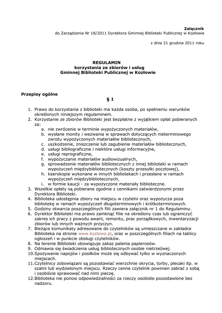 Załącznik do Zarządzenia Nr 18/2011 Dyrektora Gminnej Biblioteki Publicznej w Kozłowie z dnia 21 grudnia 2011 roku REGULAMIN korzystania ze zbiorów i usług Gminnej Biblioteki Publicznej w Kozłowie Przepisy ogólne §1 1. Prawo do korzystania z biblioteki ma każda osoba, po spełnieniu warunków określonych niniejszym regulaminem. 2. Korzystanie ze zbiorów Biblioteki jest bezpłatne z wyjątkiem opłat pobieranych za: a. nie zwrócenie w terminie wypożyczonych materiałów, b. wysłane monity i wezwania w sprawach dotyczących nieterminowego zwrotu wypożyczonych materiałów bibliotecznych, c. uszkodzenie, zniszczenie lub zagubienie materiałów bibliotecznych, d. usługi bibliograficzne i niektóre usługi informacyjne, e. usługi reprograficzne, f. wypożyczanie materiałów audiowizualnych, g. sprowadzenie materiałów bibliotecznych z innej biblioteki w ramach wypożyczeń międzybibliotecznych (koszty przesyłki pocztowej), h. kserokopie wykonane w innych bibliotekach i przesłane w ramach wypożyczeń międzybibliotecznych, i. w formie kaucji - za wypożyczone materiały biblioteczne. 3. Wszelkie opłaty są pobierane zgodnie z cennikami zatwierdzonymi przez Dyrektora Biblioteki. 4. Biblioteka udostępnia zbiory na miejscu w czytelni oraz wypożycza poza bibliotekę w ramach wypożyczeń długoterminowych i krótkoterminowych. 5. Godziny otwarcia poszczególnych filii zawiera załącznik nr 1 do Regulaminu. 6. Dyrektor Biblioteki ma prawo zamknąć filie na określony czas lub ograniczyć zakres ich pracy z powodu awarii, remontu, prac porządkowych, inwentaryzacji zbiorów lub innych ważnych przyczyn. 7. Bieżące komunikaty adresowane do czytelników są umieszczane w zakładce Biblioteka na stronie www.kozlowo.pl, oraz w poszczególnych filiach na tablicy ogłoszeń i w punkcie obsługi czytelników. 8. Na terenie Biblioteki obowiązuje zakaz palenia papierosów. 9. Odmawia się świadczenia usług bibliotecznych osobie nietrzeźwej. 10.Spożywanie napojów i posiłków może się odbywać tylko w wyznaczonych miejscach. 11.Czytelnicy zobowiązani są pozostawiać wierzchnie okrycia, torby, plecaki itp. w szatni lub wydzielonym miejscu. Rzeczy cenne czytelnik powinien zabrać z sobą i osobiście sprawować nad nimi pieczę. 12.Biblioteka nie ponosi odpowiedzialności za rzeczy osobiste pozostawione bez nadzoru. 13.Z Biblioteki nie można wynosić materiałów bibliotecznych nie podlegających wypożyczeniu. Dotyczy to również sprzętu i innych składników majątkowych Biblioteki. Warunki korzystania ze zbiorów Biblioteki §2 1. Warunkiem korzystania ze zbiorów Biblioteki jest wypełnienie i podpisanie druku zobowiązania. 2. W tym celu należy: a. wypełnić własnoręcznie zobowiązanie zawierającą dane osobowe z adresem zamieszkania i numerem PESEL, b. zapoznać się z regulaminem korzystania ze zbiorów i podpisem zobowiązać się do jego przestrzegania. Złożenie podpisu oznacza przyjęcie odpowiedzialności za stan i terminowy zwrot wypożyczonych materiałów bibliotecznych oraz wyrażenie zgody na wykorzystanie danych osobowych czytelnika do ich przetwarzania przez Bibliotekę w ramach posiadanych uprawnień. c. okazać dyżurującemu bibliotekarzowi dokument stwierdzający tożsamość w celu sprawdzenia zgodności danych na zobowiązaniu. 3. Czytelnicy niepełnoletni mogą założyć druk zobowiązania na podstawie legitymacji szkolnej i pisemnego poręczenia rodzica lub opiekuna prawnego oraz dokumentu stwierdzającego tożsamość jednego z rodziców lub opiekuna prawnego. Przy zapisie do Biblioteki osoby niepełnoletniej obecność rodzica lub opiekuna prawnego jest konieczna. 4. Administratorem danych osobowych czytelników, jest Gminna Biblioteka Publiczna w Kozłowie. Dane te podlegają ochronie prawnej na podstawie Ustawy z dnia 29 sierpnia 1997 r. o ochronie danych osobowych (Dz.U. 2002 Nr 101 poz. 926 ze zm.). Dane osobowe są gromadzone w celu świadczenia usług bibliotecznych, egzekwowania zwrotu wypożyczonych materiałów i należności z tytułu nieprzestrzegania regulaminu korzystania z usług biblioteki oraz w celach statystycznych i badawczych. 5. Czytelnikowi przysługuje prawo wglądu do danych osobowych oraz ich poprawienia na warunkach określonych w Ustawie o ochronie danych osobowych. 6. Czytelnik rezygnujący z usług biblioteki ma prawo zażądać usunięcia jego danych osobowych z ewidencji czytelników, a Biblioteka ma obowiązek usunąć te dane pod warunkiem, że czytelnik zwrócił wszystkie wypożyczone materiały i nie ma żadnych zobowiązań wobec Biblioteki. 7. Czytelnik jest zobowiązany do poinformowania Biblioteki o każdorazowej zmianie danych osobowych i adresowych. 8. Czytelnik zarejestrowany w danym roku bieżącym ma prawo do: a. wypożyczania zbiorów we wszystkich działach i filiach Biblioteki, b. korzystania ze zbiorów bibliotecznych na miejscu (Czytelnia) i ze zbiorów podręcznych w filiach bibliotecznych, c. używania za wiedzą i zgodą bibliotekarza własnego przenośnego komputera, przy czym Biblioteka nie ponosi odpowiedzialności za jego ewentualne uszkodzenie, kradzież lub utratę danych, d. uzyskania bezpłatnej informacji bibliotecznej, bibliograficznej i rzeczowej z wyłączeniem odpłatnych usług ujętych w załączniku nr 6, e. korzystania z usług reprograficznych na zasadach określonych w § 8 i załączniku nr 5, f. zgłaszania do dyrekcji Biblioteki uwag, propozycji, wniosków, zażaleń w formie ustnej lub pisemnej. Odpowiedzi na pisemne wnioski i zażalenia udziela się w trybie przewidzianym przepisami prawa administracyjnego. Odpowiedzialność czytelnika za wypożyczone materiały biblioteczne §3 1. Czytelników obowiązuje: a. troskliwe obchodzenie się z udostępnionymi materiałami, m.in. zakaz podkreślania, kalkowania, pisania uwag na marginesach, używania książek i czasopism jako podkładek przy pisaniu itp. b. ochrona wypożyczonych materiałów przed uszkodzeniam