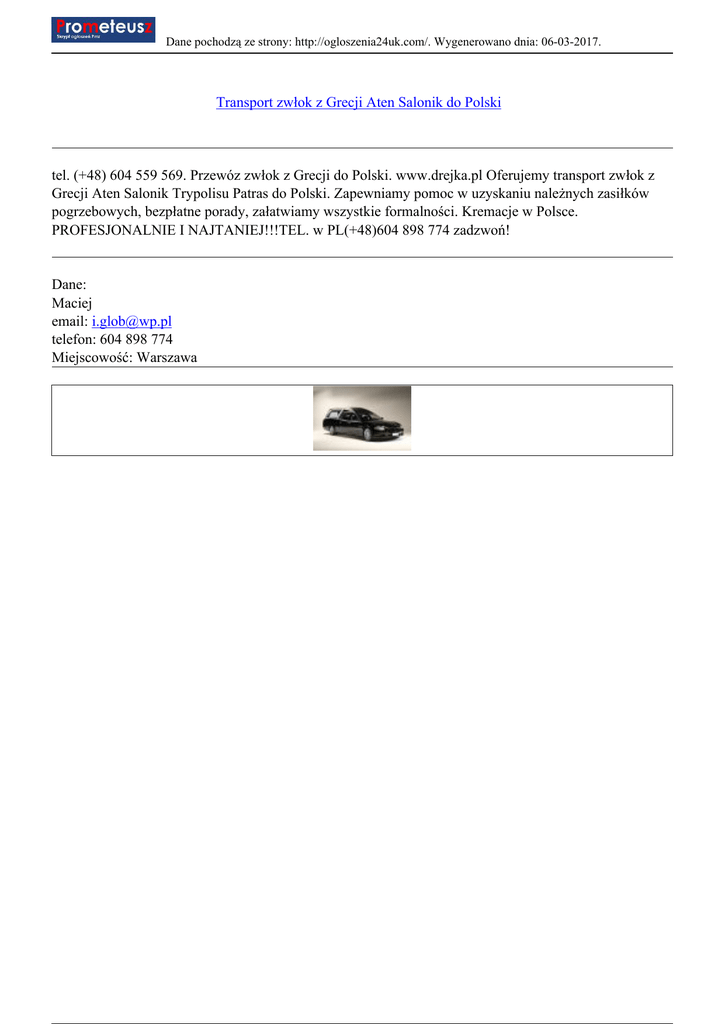Dane pochodzą ze strony: http://ogloszenia24uk.com/. Wygenerowano dnia: 06-03-2017. Transport zwłok z Grecji Aten Salonik do Polski tel. (+48) 604 559 569. Przewóz zwłok z Grecji do Polski. www.drejka.pl Oferujemy transport zwłok z Grecji Aten Salonik Trypolisu Patras do Polski. Zapewniamy pomoc w uzyskaniu należnych zasiłków pogrzebowych, bezpłatne porady, załatwiamy wszystkie formalności. Kremacje w Polsce. PROFESJONALNIE I NAJTANIEJ!!!TEL. w PL(+48)604 898 774 zadzwoń! Dane: Maciej email: [email protected] telefon: 604 898 774 Miejscowość: Warszawa