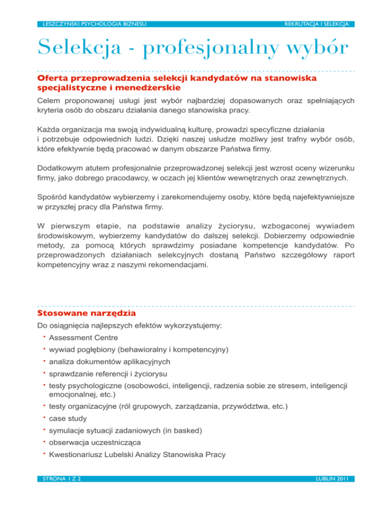 LESZCZYŃSKI PSYCHOLOGIA BIZNESU REKRUTACJA I SELEKCJA Selekcja - profesjonalny wybór Oferta przeprowadzenia selekcji kandydatów na stanowiska specjalistyczne i menedżerskie Celem proponowanej usługi jest wybór najbardziej dopasowanych oraz spełniających kryteria osób do obszaru działania danego stanowiska pracy. Każda organizacja ma swoją indywidualną kulturę, prowadzi specyficzne działania i potrzebuje odpowiednich ludzi. Dzięki naszej usłudze możliwy jest trafny wybór osób, które efektywnie będą pracować w danym obszarze Państwa firmy. Dodatkowym atutem profesjonalnie przeprowadzonej selekcji jest wzrost oceny wizerunku firmy, jako dobrego pracodawcy, w oczach jej klientów wewnętrznych oraz zewnętrznych. Spośród kandydatów wybierzemy i zarekomendujemy osoby, które będą najefektywniejsze w przyszłej pracy dla Państwa firmy. W pierwszym etapie, na podstawie analizy życiorysu, wzbogaconej wywiadem środowiskowym, wybierzemy kandydatów do dalszej selekcji. Dobierzemy odpowiednie metody, za pomocą których sprawdzimy posiadane kompetencje kandydatów. Po przeprowadzonych działaniach selekcyjnych dostaną Państwo szczegółowy raport kompetencyjny wraz z naszymi rekomendacjami. Stosowane narzędzia Do osiągnięcia najlepszych efektów wykorzystujemy: • Assessment Centre • wywiad pogłębiony (behawioralny i kompetencyjny) • analiza dokumentów aplikacyjnych • sprawdzanie referencji i życiorysu • testy psychologiczne (osobowości, inteligencji, radzenia sobie ze stresem, inteligencji emocjonalnej, etc.) • testy organizacyjne (ról grupowych, zarządzania, przywództwa, etc.) • case study • symulacje sytuacji zadaniowych (in basked) • obserwacja uczestnicząca • Kwestionariusz Lubelski Analizy Stanowiska Pracy STRONA 1 Z 2 LUBLIN 2011 LESZCZYŃSKI PSYCHOLOGIA BIZNESU REKRUTACJA I SELEKCJA Dane kontaktowe Maciej Leszczyński mobile +48 698 166 354 mail [email protected] Ewelina Kliza mobile +48 505 467 004 mail [email protected] Adres korespondencyjny: ul. Bernardyńska 11/29 20-109 Lublin Adres firmy: Leszczyński Psychologia Biznesu Ul. Odrodzenia 15/1 59-140 Chocianów NIP 502-000-46-82 REGON 021378736 Dodatkowo oferujemy • rekrutacja pracowników liniowych, specjalistów, menedżerów • pełne usługi selekcyjne na różnych poziomach organizacji • planowanie ścieżek kariery • tworzenie programu rozwoju talentów • doradztwo w zakresie tworzenia wewnętrznych narzędzi HR • szkolenia • coaching • badania wizerunkowe • budowanie systemu ocen pracowniczych STRONA 2 Z 2 LUBLIN 2011