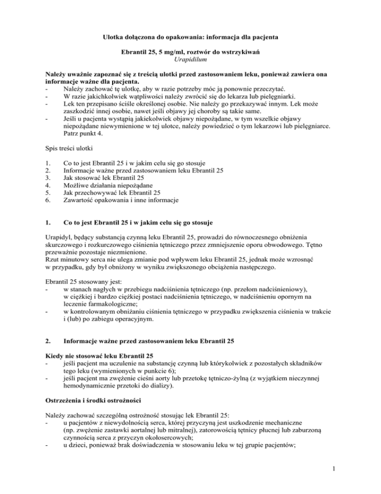 Ulotka dołączona do opakowania: informacja dla pacjenta Ebrantil 25, 5 mg/ml, roztwór do wstrzykiwań Urapidilum Należy uważnie zapoznać się z treścią ulotki przed zastosowaniem leku, ponieważ zawiera ona informacje ważne dla pacjenta. Należy zachować tę ulotkę, aby w razie potrzeby móc ją ponownie przeczytać. W razie jakichkolwiek wątpliwości należy zwrócić się do lekarza lub pielęgniarki. Lek ten przepisano ściśle określonej osobie. Nie należy go przekazywać innym. Lek może zaszkodzić innej osobie, nawet jeśli objawy jej choroby są takie same. Jeśli u pacjenta wystąpią jakiekolwiek objawy niepożądane, w tym wszelkie objawy niepożądane niewymienione w tej ulotce, należy powiedzieć o tym lekarzowi lub pielęgniarce. Patrz punkt 4. Spis treści ulotki 1. 2. 3. 4. 5. 6. Co to jest Ebrantil 25 i w jakim celu się go stosuje Informacje ważne przed zastosowaniem leku Ebrantil 25 Jak stosować lek Ebrantil 25 Możliwe działania niepożądane Jak przechowywać lek Ebrantil 25 Zawartość opakowania i inne informacje 1. Co to jest Ebrantil 25 i w jakim celu się go stosuje Urapidyl, będący substancją czynną leku Ebrantil 25, prowadzi do równoczesnego obniżenia skurczowego i rozkurczowego ciśnienia tętniczego przez zmniejszenie oporu obwodowego. Tętno przeważnie pozostaje niezmienione. Rzut minutowy serca nie ulega zmianie pod wpływem leku Ebrantil 25, jednak może wzrosnąć w przypadku, gdy był obniżony w wyniku zwiększonego obciążenia następczego. Ebrantil 25 stosowany jest: w stanach nagłych w przebiegu nadciśnienia tętniczego (np. przełom nadciśnieniowy), w ciężkiej i bardzo ciężkiej postaci nadciśnienia tętniczego, w nadciśnieniu opornym na leczenie farmakologiczne; w kontrolowanym obniżaniu ciśnienia tętniczego w przypadku zwiększenia ciśnienia w trakcie i (lub) po zabiegu operacyjnym. 2. Informacje ważne przed zastosowaniem leku Ebrantil 25 Kiedy nie stosować leku Ebrantil 25 jeśli pacjent ma uczulenie na substancję czynną lub którykolwiek z pozostałych składników tego leku (wymienionych w punkcie 6); jeśli pacjent ma zwężenie cieśni aorty lub przetokę tętniczo-żylną (z wyjątkiem nieczynnej hemodynamicznie przetoki do dializy). Ostrzeżenia i środki ostrożności Należy zachować szczególną ostrożność stosując lek Ebrantil 25: u pacjentów z niewydolnością serca, której przyczyną jest uszkodzenie mechaniczne (np. zwężenie zastawki aortalnej lub mitralnej), zatorowością tętnicy płucnej lub zaburzoną czynnością serca z przyczyn okołosercowych; u dzieci, ponieważ brak doświadczenia w stosowaniu leku w tej grupie pacjentów; 1 - u pacjentów z zaburzeniami czynności wątroby (konieczne może być zmniejszenie dawki leku Ebrantil 25); u pacjentów z umiarkowanymi lub ciężkimi zaburzeniami czynności nerek (konieczne może być zmniejszenie dawki leku Ebrantil 25); u pacjentów w podeszłym wieku. Ze względu na zmienioną wrażliwość osób w podeszłym wieku, leki obniżające ciśnienie należy stosować początkowo w mniejszych dawkach; u pacjentów leczonych równocześnie cymetydyną (patrz punkt Lek Ebrantil 25 a inne leki). Jeśli podano wcześniej inny lek zmniejszający ciśnienie tętnicze, przed podaniem leku Ebrantil 25 należy czekać na uwidocznienie wpływu podanego leku na wartość ciśnienia, a następnie odpowiednio zmniejszyć dawkowanie leku Ebrantil 25. Nadmiernie szybki spadek ciśnienia krwi może prowadzić do zwolnienia lub zatrzymania akcji serca. Ciąża i karmienie piersią Jeśli pacjentka jest w ciąży lub karmi piersią, przypuszcza, że może być w ciąży lub gdy planuje mieć dziecko, powinna poradzić się lekarza przed zastosowaniem tego leku. Nie zaleca się stosowania leku Ebrantil 25 w czasie ciąży, chyba że potencjalne korzyści dla matki przeważają nad potencjalnymi zagrożeniami dla płodu. Podczas stosowania leku Ebrantil 25 nie należy karmić piersią. Prowadzenie pojazdów i obsługiwanie maszyn Ze względu na indywidualną reakcję na lek, zdolność prowadzenia pojazdów i obsługiwania maszyn może być upośledzona. Może to się zdarzyć zwłaszcza na początku leczenia, przy zwiększeniu dawki leku, zmianie leku na inny oraz w przypadku spożywania alkoholu w trakcie stosowania leku. Lek Ebrantil 25 a inne leki Należy powiedzieć lekarzowi o wszystkich lekach przyjmowanych przez pacjenta obecnie lub ostatnio, a także o lekach, które pacjent planuje przyjmować. Działanie leku może być nasilone przez: jednoczesne stosowanie antagonistów receptorów alfa-adrenergicznych (np. klonidyna), leków rozszerzających naczynia oraz innych leków obniżających ciśnienie; odwodnienie organizmu spowodowane np. wymiotami lub biegunką; alkohol. Równoczesne stosowanie cymetydyny (lek przeciw nadkwasocie) może spowodować wzrost stężenia urapidylu w surowicy. Ze względu na brak wystarczających danych dotyczących wzajemnego oddziaływania leku Ebrantil 25 i inhibitorów konwertazy angiotensyny (leki stosowane w nadciśnieniu i chorobach serca), nie należy stosować tych leków równocześnie. 3. Jak stosować lek Ebrantil 25 Stany nagłe w przebiegu nadciśnienia tętniczego (np. przełom nadciśnieniowy), ciężkie i bardzo ciężkie postaci nadciśnienia tętniczego, nadciśnienie oporne na leczenie farmakologiczne. 1) Wstrzyknięcia dożylne 10 do 50 mg urapidylu należy powoli podawać dożylnie z jednoczesnym monitorowaniem ciśnienia krwi. Obniżenie ciśnienia występuje zwykle w ciągu 5 minut po podaniu leku. W zależności od reakcji, podanie leku Ebrantil 25 można powtórzyć. 2 2) Wlew kroplowy dożylny lub wlew ciągły z użyciem pompy infuzyjnej W celu utrzymania poziomu ciśnienia tętniczego uzyskanego po wstrzyknięciu, należy przygotować wlew kroplowy roztworu w następujący sposób: do 500 ml roztworu do infuzji, np. 0,9% roztworu chlorku sodu, 5% lub 10% roztworu glukozy, należy dodać 
