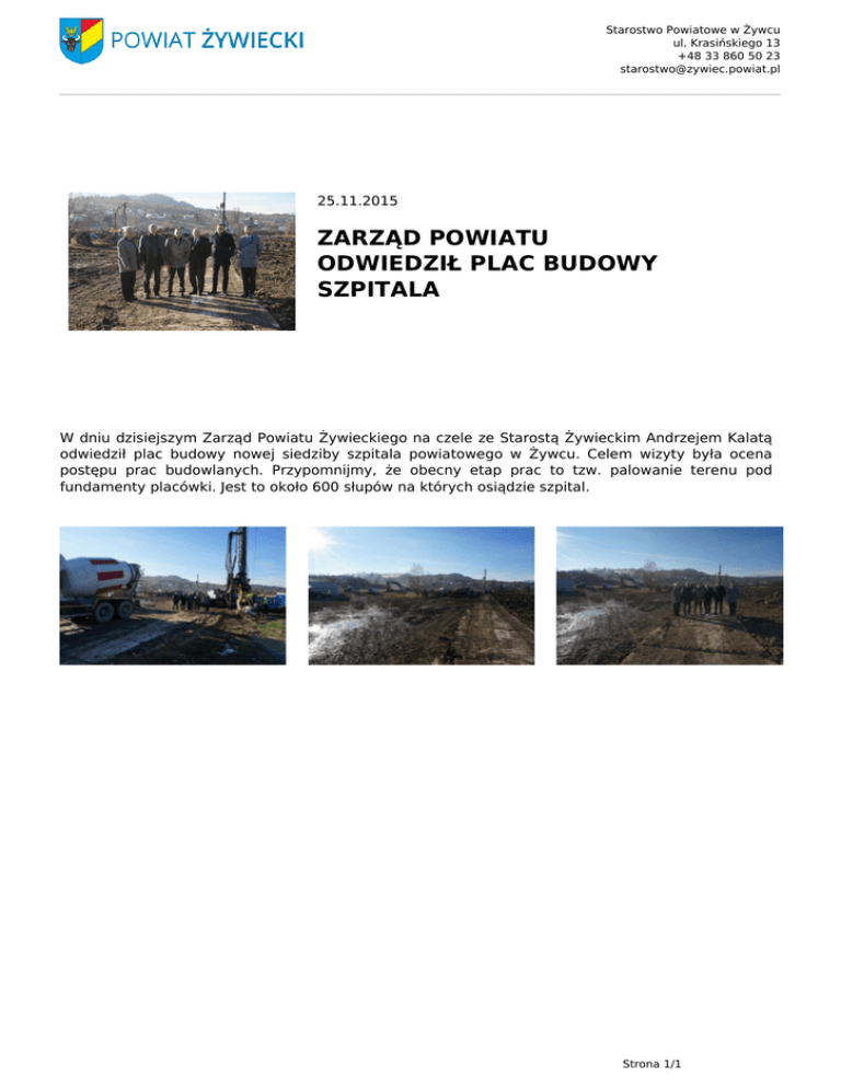 Starostwo Powiatowe w Żywcu ul. Krasińskiego 13 +48 33 860 50 23 [email protected] 25.11.2015 ZARZĄD POWIATU ODWIEDZIŁ PLAC BUDOWY SZPITALA W dniu dzisiejszym Zarząd Powiatu Żywieckiego na czele ze Starostą Żywieckim Andrzejem Kalatą odwiedził plac budowy nowej siedziby szpitala powiatowego w Żywcu. Celem wizyty była ocena postępu prac budowlanych. Przypomnijmy, że obecny etap prac to tzw. palowanie terenu pod fundamenty placówki. Jest to około 600 słupów na których osiądzie szpital. Strona 1/1 Powered by TCPDF (www.tcpdf.org)