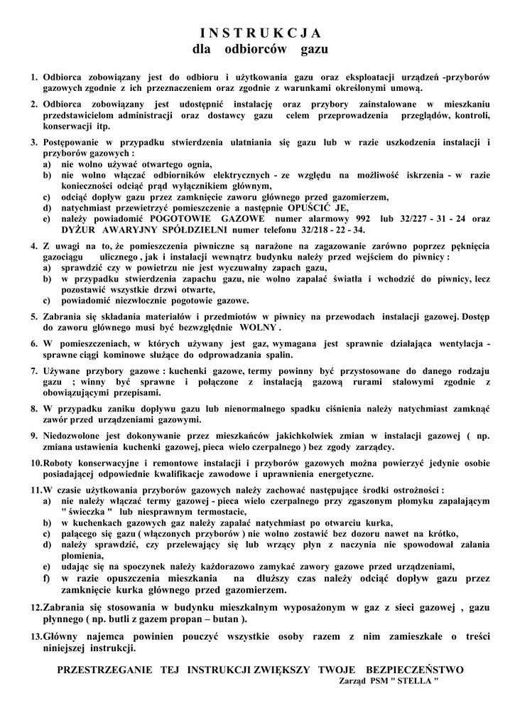 INSTRUKCJA dla odbiorców gazu 1. Odbiorca zobowiązany jest do odbioru i użytkowania gazu oraz eksploatacji urządzeń -przyborów gazowych zgodnie z ich przeznaczeniem oraz zgodnie z warunkami określonymi umową. 2. Odbiorca zobowiązany jest udostępnić instalację przedstawicielom administracji oraz dostawcy gazu konserwacji itp. oraz przybory zainstalowane w mieszkaniu celem przeprowadzenia przeglądów, kontroli, 3. Postępowanie w przypadku stwierdzenia ulatniania się gazu lub w razie uszkodzenia instalacji i przyborów gazowych : a) nie wolno używać otwartego ognia, b) nie wolno włączać odbiorników elektrycznych - ze względu na możliwość iskrzenia - w razie konieczności odciąć prąd wyłącznikiem głównym, c) odciąć dopływ gazu przez zamknięcie zaworu głównego przed gazomierzem, d) natychmiast przewietrzyć pomieszczenie a następnie OPUŚCIĆ JE, e) należy powiadomić POGOTOWIE GAZOWE numer alarmowy 992 lub 32/227 - 31 - 24 oraz DYŻUR AWARYJNY SPÓŁDZIELNI numer telefonu 32/218 - 22 - 34. 4. Z uwagi na to, że pomieszczenia piwniczne są narażone na zagazowanie zarówno poprzez pęknięcia gazociągu ulicznego , jak i instalacji wewnątrz budynku należy przed wejściem do piwnicy : a) sprawdzić czy w powietrzu nie jest wyczuwalny zapach gazu, b) w przypadku stwierdzenia zapachu gazu, nie wolno zapalać światła i wchodzić do piwnicy, lecz pozostawić wszystkie drzwi otwarte, c) powiadomić niezwłocznie pogotowie gazowe. 5. Zabrania się składania materiałów i przedmiotów w piwnicy na przewodach instalacji gazowej. Dostęp do zaworu głównego musi być bezwzględnie WOLNY . 6. W pomieszczeniach, w których używany jest gaz, wymagana jest sprawnie działająca wentylacja sprawne ciągi kominowe służące do odprowadzania spalin. 7. Używane przybory gazowe : kuchenki gazowe, termy powinny być przystosowane do danego rodzaju gazu ; winny być sprawne i połączone z instalacją gazową rurami stalowymi zgodnie z obowiązującymi przepisami. 8. W przypadku zaniku dopływu gazu lub nienormalnego spadku ciśnienia należy natychmiast zamknąć zawór przed urządzeniami gazowymi. 9. Niedozwolone jest dokonywanie przez mieszkańców jakichkolwiek zmian w instalacji gazowej ( np. zmiana ustawienia kuchenki gazowej, pieca wielo czerpalnego ) bez zgody zarządcy. 10. Roboty konserwacyjne i remontowe instalacji i przyborów gazowych można powierzyć jedynie osobie posiadającej odpowiednie kwalifikacje zawodowe i uprawnienia energetyczne. 11. W czasie użytkowania przyborów gazowych należy zachować następujące środki ostrożności : a) nie należy włączać termy gazowej - pieca wielo czerpalnego przy zgaszonym płomyku zapalającym " świeczka " lub niesprawnym termostacie, b) w kuchenkach gazowych gaz należy zapalać natychmiast po otwarciu kurka, c) palącego się gazu ( włączonych przyborów ) nie wolno zostawić bez dozoru nawet na krótko, d) należy sprawdzić, czy przelewający się lub wrzący płyn z naczynia nie spowodował zalania płomienia, e) udając się na spoczynek należy każdorazowo zamykać zawory gazowe przed urządzeniami, f) w razie opuszczenia mieszkania na dłuższy czas należy odciąć dopływ gazu przez zamknięcie kurka głównego przed gazomierzem. 12. Zabrania się stosowania w budynku mieszkalnym wyposażonym w gaz z sieci gazowej , gazu płynnego ( np. butli z gazem propan – butan ). 13. Główny najemca powinien pouczyć wszystkie osoby razem z nim zamieszkałe o treści niniejszej instrukcji. PRZESTRZEGANIE TEJ INSTRUKCJI ZWIĘKSZY TWOJE BEZPIECZEŃSTWO Zarząd PSM " STELLA "