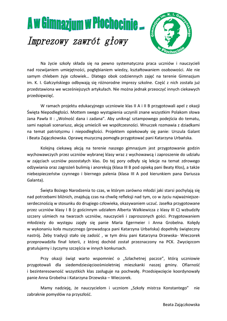 Na życie szkoły składa się na pewno systematyczna praca uczniów i nauczycieli nad rozwijaniem umiejętności, pogłębianiem wiedzy, kształtowaniem osobowości. Ale nie samym chlebem żyje człowiek… Dlatego obok codziennych zajęć na terenie Gimnazjum im. K. I. Gałczyńskiego odbywają się różnorodne imprezy szkolne. Część z nich została już przedstawiona we wcześniejszych artykułach. Nie można jednak przeoczyć innych ciekawych przedsięwzięć. W ramach projektu edukacyjnego uczniowie klas II A i II B przygotowali apel z okazji Święta Niepodległości. Mottem swego wystąpienia uczynili znane wszystkim Polakom słowa Jana Pawła II : „Wolność dana i zadana”. Aby uniknąć sztampowego podejścia do tematu, sami napisali scenariusz, akcję umieścili we współczesności. Wnuczek rozmawia z dziadkami na temat patriotyzmu i niepodległości. Projektem opiekowały się panie: Urszula Galant i Beata Zajączkowska. Oprawę muzyczną pomogła przygotować pani Katarzyna Urbańska. Kolejną ciekawą akcją na terenie naszego gimnazjum jest przygotowanie godzin wychowawczych przez uczniów wybranej klasy wraz z wychowawcą i zaproszenie do udziału w zajęciach uczniów pozostałych klas. Do tej pory odbyły się lekcje na temat zdrowego odżywiania oraz zagrożeń bulimią i anoreksją (klasa III B pod opieką pani Beaty Kłos), a także niebezpieczeństw czynnego i biernego palenia (klasa III A pod kierunkiem pana Dariusza Galanta). Święta Bożego Narodzenia to czas, w którym zarówno młodzi jaki starsi pochylają się nad potrzebami bliźnich, znajdują czas na chwilę refleksji nad tym, co w życiu najważniejszeserdecznością w stosunku do drugiego człowieka, okazywaniem uczuć. Jasełka przygotowane przez uczniów klasy I B (z gościnnym udziałem Alberta Walkiewicza z klasy III C) wzbudziły szczery uśmiech na twarzach uczniów, nauczycieli i zaproszonych gości. Przygotowaniem młodzieży do występu zajęły się panie Maria Egermeier i Anna Grobelna. Kolędy w wykonaniu koła muzycznego (prowadząca pani Katarzyna Urbańska) dopełniły świąteczny nastrój. Żeby tradycji stało się zadość , w tym dniu pani Katarzyna Drzewska- Wieczorek przeprowadziła finał loterii, z której dochód został przeznaczony na PCK. Zwycięzcom gratulujemy i życzymy szczęścia w innych konkursach. Przy okazji świąt warto wspomnieć o „Szlachetnej paczce”, którą uczniowie przygotowali dla siedemdziesięcioośmioletniej mieszkanki naszej gminy. Ofiarność i bezinteresowność wszystkich klas zasługuje na pochwałę. Przedsięwzięcie koordynowały panie Anna Grobelna i Katarzyna Drzewska – Wieczorek. Mamy nadzieję, że nauczycielom i uczniom „Szkoły mistrza Konstantego” zabraknie pomysłów na przyszłość. nie Beata Zajączkowska