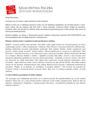 Drogi Darczyńco, Cieszymy się, że razem z nami zmieniasz świat na lepsze! Miłość wyraża się w trafionym prezencie, który nie jest banalnym podarkiem, ale strzałem prosto w serce. Sami wiemy, jak się czujemy, gdy ktoś trafi w nasze marzenia, zwłaszcza kiedy wydają się nierealne. Wyobraź sobie, jak poczuła się rodzina, która otrzymała przygotowaną przez Ciebie paczkę. Być może od dawna nie dostała prezentu. Poniżej znajduje się relacja z dostarczenia paczki rodzinie (oznaczonej numerem KUJ-909-030024) oraz słowa podziękowania od obdarowanych i wolontariusza: Relacja z dostarczenia i rozpakowywania paczki przez rodzinę: Radość i szczęście rodziny była ogromna. Pan Piotr i pani Agata bardzo się wzruszyli patrząc na dzieci rozdzierające paczki z takim entuzjazmem i radością. Panu Piotrowi wzruszenie dosłownie odebrało głos. Rodzinę najbardziej ucieszyły indywidualne podarunki. Były trafione idealnie. Każdy rozpakował swój prezent i wtedy zaczęły się piski i okrzyki radości. Oliwia podskoczyła ze szczęścia na widok płyty ''One Direction'' - była tak ucieszona, że aż wskoczyła na tatę i mocno go uściskała. Mateusz dosłownie zakochał się w książce. Marysia skakała z radości - oglądała wcześniej taką lalkę i skrycie o niej marzyła. Zosi natomiast najbardziej spodobał się czerwony plecaczek/torebka - oznajmiła, że jest jej i koniec. Pan Piotr nie dowierzał na widok kołowrotka. Pani Agata była zaskoczona wysoką jakością kosmetyków, które otrzymała - nigdy takich nie miała. Jeszcze bardziej wzruszyła się, gdy ujrzała blender. Wszystkimi targały emocje nie do opisania. Najzabawniejsze były reakcje Mateusza-nawet paczka z budyniami uradowała go ogromnie: "Mamo, tu są budynie! Ja uwielbiam, ja kocham budynie!". Tak niewiele mu potrzeba do szczęścia. Paczki z żywnością bardzo ucieszyły dzieci. Było czuć, iż rodzinę przepełnia radość. To było cudowne. Co chce Państwu powiedzieć od siebie rodzina: "Ze szczerego serca dziękujemy darczyńcy za te cudowne paczki. Nie spodziewaliśmy się, aż tak wielkiej hojności. Dzieci jak i ja z żoną jesteśmy bardzo wdzięczni za tak wielkie zaangażowanie. Brak mi słów na okazanie wdzięczności. Pragniemy z rodziną poznać darczyńcę i chcielibyśmy podziękować tym dobrym ludziom osobiście."