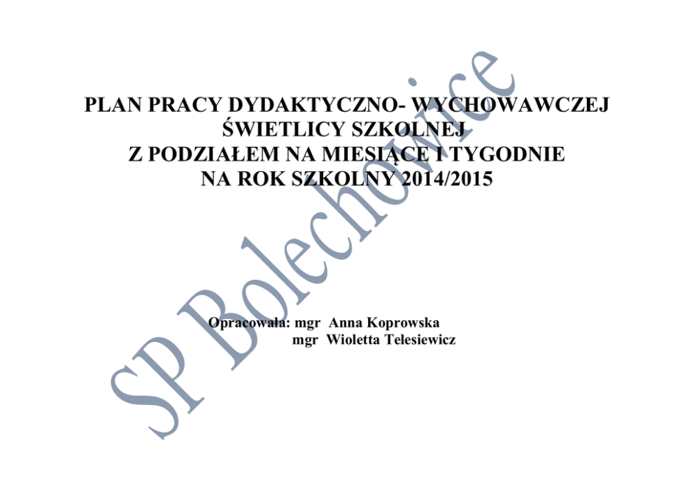 PLAN PRACY DYDAKTYCZNO- WYCHOWAWCZEJ ŚWIETLICY SZKOLNEJ Z PODZIAŁEM NA MIESIĄCE I TYGODNIE NA ROK SZKOLNY 2014/2015 Opracowała: mgr Anna Koprowska mgr Wioletta Telesiewicz WRZESIEŃ 2014r. Data 02.09. – 05.09 Tematyka zajęć Temat tygodnia ŻEGNAMY WAKACJE I WITAMY SZKOŁĘ 1. 2. 3. 4. 5. 6. 09.09. – 12.09. 1. BEZPIECZNA DROGA DO SZKOŁY 2. 3. 4. 5. 6. 7. 8. 15.0919.09. W KRÓLESTWIE JESIENI 1. 2. 3. 4. 5. 6. 7. 8. 9. Zadania i cele Uroczyste rozpoczęcie roku szkolnego 2013/14 Omówienie zasad bezpieczeństwa i higieny pracy w świetlicy. Zapoznanie dzieci z regulaminem świetlicy. Podpisanie kontraktu. Wypowiedzi dzieci na temat wakacyjnych przeżyć na podstawie doświadczeń oraz przedstawionych ilustracji. Zapoznanie z wierszem Tadeusza Kubiaka „ Pożegnanie wakacji”. Gry i zabawy integracyjne „Poznajmy się” – wzajemne poznawanie swoich imion, dzielenie się swoimi zainteresowaniami. „Wakacyjna pocztówka”- praca plastyczna wykonana techniką kolażu. Nauka piosenki „Samba turystyczna” . Prezentowanie wakacyjnych skarbów i pamiątek. Prace organizacyjno- porządkowe w świetlicy. Zajęcia sportowo- rekreacyjne na boisku szkolnym lub sali gimnastycznej. Pomoc w odrabianiu lekcji (w razie potrzeby). - kształtowanie umiejętności postępowania zgodnie z przyjętymi normami i zasadami, - wdrażanie do kulturalnego zachowania w świetlicy i do współpracy w grupie, - wzmacnianie więzi koleżeńskich - rozwijanie umiejętności plastycznych Rozmowa kierowana na temat bezpiecznego zachowania się na drodze na podstawie wiersza pt. „Gdy zamierzasz przejść przez ulicę”, zdobytej wiedzy uczniów oraz plakatów. Dobieranie zdań i tekstów do przedstawianych ilustracji o tematyce „ Droga ucznia do szkoły” Wspólne formułowanie zasad poruszania się po drogach – wykonanie plakatów. Kolorowanie znaków drogowych ważnych dla pieszych Dekoracja świetlicy- wykonanie gazetki ściennej. Czy znam znaki drogowe?- gra planszowa. Omówienie scenki rodzajowej „Na skrzyżowaniu” Praca z książeczką „Jak unikać wypadków drogowych”. Wspólne czytanie i opowiadanie. Podsumowanie omawianej tematyki quizem pytań – praca z podziałem na grupy. Odgadywanie zaszyfrowanych haseł – rozwiązywanie krzyżówek i rebusów. Pomoc w odrabianiu lekcji. Zabawy dowolne w kącikach zainteresowań. - zapoznanie dzieci z zasadami bezpieczeństwa obowiązującymi w szkole, - wdrażanie do podporządkowania się poleceniom wychowawcy - przypomnienie zasad bezpieczeństwa na jezdni i chodniku - wdrażanie do pracy w grupie - rozwijanie zainteresowań czytelniczych Rozmowy na temat cykliczności pór roku: określenie charakterystycznych cech jesieni. Swobodne wypowiedzi uczniów na temat piękna polskiej jesieni, zmian zachodzących jesienią w polu, lesie, w sadzie Jesień w literaturze- wiersze i proza –przykłady. Oglądanie –„Atlasu grzybów”. Pogadanka z dziećmi- „Grzyby jadalne i trujące Układanie krzyżówek z hasłem jesień (praca w grupach). Zapoznanie z nowymi technikami plastycznymi – rozwijanie zdolności manualnych, wykonanie drzewa jesiennego, słoneczników. Wykonanie gazetki pt.: „Jesień”. Obrazki z figur geometrycznych - odciskanie pieczątkami wykonanymi z ziemniaka. Wyścigi na wesoło – wprowadzenie elementów współzawodnictwa - przypomnienie charakterystycznych cech jesieni -kształtowanie umiejętności pracy w grupie -rozwijanie zdolności manualnych -wdrażanie w zasady prawidłowego współzawodnictwa -rozwijanie zainteresowań czytelniczych 22.0926.09. MOJA SZKOŁAMÓJ DRUGI DOM 1. 2. 3. 4. 5. 6. 7. 8. Przeglądanie strony internetowej szkoły Oglądanie zdjęć z historii szkoły, Za co lubię moją szkołę?- burza mózgów Szkoła w przyszłości- malowanie farbami Rebusy, rozsypanki z hasłem: SZKOŁA, HYMN, PATRON Zabawy ruchowe „Labirynt” ,”Wąż”, ”Miotła Czarownicy”, ”Koguty i kury” Zajęcia muzyczno-rytmiczne Gry i zabawy ruchowe na świeżym powietrzu, zasady bezpiecznej zabawy w budynku szkolnym, ćwiczenia zręcznościowe. -zapoznanie z historią powstania szkoły -rozwijanie umiejętności plastycznych -wyrabianie kreatywności i pobudzanie wyobraźni twórczej -wdrażanie do zabawy w grupie -pobudzanie zmysłu muzycznego