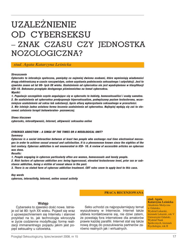 UZALE˚NIENIE OD CYBERSEKSU – ZNAK CZASU CZY JEDNOSTKA NOZOLOGICZNA? stud. Agata Katarzyna LeÊnicka Streszczenie Cyberseks to interakcja spo∏eczna, pomi´dzy co najmniej dwiema osobami, które wymieniajà wiadomoÊci drogà elektronicznà w czasie rzeczywistym, celem uzyskania podniecenia seksualnego i satysfakcji. Jest to zjawisko znane od lat 80- tych XX wieku. Uzale˝nienie od cyberseksu nie jest wyodr´bnione w klasyfikacji ICD-10. Dokonano przeglàdu dost´pnego piÊmiennictwa na temat cyberseksu. Wyniki: 1. Populacje szczególnie cz´sto anga˝ujàce si´ w cyberseks to kobiety, homoseksualiÊci i osoby samotne. 2. Do uzale˝nienia od cyberseksu predysponuje hiperseksualizm, podwy˝szony poziom testosteronu, wczeÊniejsze uzale˝nienie od seksu lub substancji, bycie ofiarà wykorzystania seksualnego w przesz∏oÊci. 3. Nie istnieje ˝adna ustalona forma leczenia uzale˝nienia od cyberseksu. Najlepiej wydajà si´ zaÊ tu stosowaç za∏o˝enia terapii behawioralno- poznawczej. S∏owa kluczowe cyberseks, interaktywnoÊç, Internet, aktywnoÊç seksualna online CYBERSEX ADDICTION – A SINGA OF THE TIMES OR A NOSOLOGICAL UNIT? Summary Cybersex is a social interaction between at least two people who exchange real time electronical messages in order to achieve sexual arousal and satisfaction. It is a phenomenon known since the eighties of the last century. Cybersex addiction is not enumerated in ICD- 10. A review of accessible articles on cybersex was done. Results: 1. People engaging in cybersex particularly often are women, homosexuals and lonely people. 2. Risk factors of cybersex addiction are: being hypersexual, elevated testosterone level, prior sex or substance addiction, being a victiim of sexual abuse in the past. 3. There is no stated form of cybersex addiction treatment. CBT rules seem to apply best to this case. Key words cybersex, interactivity, Internet, online sexual activity PRACA RECENZOWANA stud. Agata Katarzyna LeÊnicka Wst´p Cyberseks to zjawisko doÊç nowe. Istnieje od lat 80- tych XX wieku. Pojawi∏ si´ wraz z upowszechnieniem si´ Internetu i stanowi przyk∏ad na to, jak technologia wkroczy∏a w ˝ycie codzienne modyfikujàc form´ realizacji immanentnego pop´du jakim jest pop´d seksualny u cz∏owieka. Przeglàd Seksuologiczny, lipiec/wrzesieƒ 2008, nr 15 Seks uchodzi za najpopularniejszy temat wyszukiwany w Internecie. Internet tak˝e u∏atwia kontaktowanie si´, nie dziwi zatem, ˝e powstajà fora internetowe dla amatorów prawie ka˝dej parafilii. Internet sta∏ si´ tak˝e nowà drogà do poszukiwania partnerów zarówno realnych jak i wirtualnych. Akademia Medyczna w Gdaƒsku, Wydzia∏ Lekarski, kierunek Lekarski, rok V Uniwersytet Gdaƒski, Wydzia∏ Nauk Spo∏ecznych, kierunek Psychologia, rok II 17 W tym miejscu otwiera si´ pole dla cyberseksu, czyli dos∏ownie seksu uprawianego przez Internet. Cyberseks jest definiowany jako wymiana tekstów opisujàcych fantazje seksualne, mo˝e towarzyszyç mu masturbacja [1, 2]. Cyberseks mo˝e tak˝e obejmowaç u˝ywanie materia∏ów o treÊci seksualnej (obrazy, dêwi´ki, tekst) uzyskane albo przez Internet albo jako dane komputerowe z intencjà uzyskania podniecenia seksualnego i stymulacji [3]. Najbardziej przejrzystà definicj´ tego zjawiska podaje Doring [4], piszàc, ˝e jest to interakcja spo∏eczna pomi´dzy co najmniej dwiema osobami, które wymieniajà wiadomoÊci drogà elektronicznà, w czasie rzeczywistym, celem uzyskania podniecenia seksualnego i satysfakcji. Mo˝e si´ odbywaç za poÊrednictwem tekstu (jest to najpopularniejsza forma, cyberseks uprawiana g∏ównie na czatach) ale tak˝e np. z przekazem z kamery. W Êwietle rosnàcej technicyzacji i popularnoÊci Internetu wydaje si´ istotne zbadanie opisywanego zjawiska. Cel Celem niniejszej pracy by∏a analiza dost´pnego piÊmiennictwa na temat uzale˝nienia cyberseksu i identyfikacja czynników ryzyka takiego uzale˝nienia, jego statusu nozologicznego jak równie˝ potencjalnych konsekwencji takiej aktywnoÊci. Materia∏ i metody Dokonano analizy treÊci artyku∏ów z baz PsychINFO i PsychArticles zawierajàcych has∏o „cybersex”. Znaleziono 18 takich pozycji. Wyniki Cyberseks to aktywnoÊç najcz´Êciej podejmowana przez osoby prywatne, choç mo˝liwy jest udzia∏ p∏atny prostytutek [4]. Najcz´Êciej jest to przelotny kontakt, ale jest mo˝liwe, ˝e wywiàzuje si´ z tego d∏ugotrwa∏a, sta∏a relacja. Najcz´Êciej jest to relacja dwóch przypadkowo spotkanych osób, ale bywa, ˝e partnerzy tego rodzaju interakcji znali si´ wczeÊniej w ˝yciu realnym lub, ˝e relacja rozwija si´ z wczeÊniejszego kontaktu w cyberprzestrzeni, który nie by∏ zwiàzany z seksem (np. spotkanie na liÊcie dyskusyjnej). JeÊli partnerzy znajà si´ z ˝ycia realnego, to bywa, ˝e z powodu dzielàcej ich odleg∏oÊci, cyberseks staje si´ formà zast´pczà dla dotychczasowej aktywnoÊci seksualnej. Zdarza si´ tak˝e, ˝e cyberseks mo˝e prowadziç do realnego spotkania [4, 5], choç rów18 nie prawdopodobne jest, ˝e osoba anga˝ujàca si´ w cyberseks ma tak˝e partnera w ˝yciu realnym i nie jest zainteresowana spotkaniami z cyberpartnerem. Cyberseks jest czynnoÊcià, która mo˝e uzale˝niaç. Ustalono, ˝e jest to raczej uzale˝nienie od seksu, a nie od Internetu [1, 3]. W literaturze wymienia si´ czynniki sprzyjajàce uzale˝nieniu od cyberseksu, najcz´Êciej sà to czynniki u∏atwiajàce powstanie uzale˝nienia. Cooper podaje trzy g∏ówne cechy cyberseksu, a mianowicie: jego dost´pnoÊç, stosunkowo tanie po∏àczenia z Internetem oraz anonimowoÊç w Internecie [3]. Na tych trzech filarach ma si´ opieraç uzale˝nienie od cyberseksu. Jednak wydaje si´, ˝e takich czynników ryzyka jest znacznie wi´cej, próbuje si´ nawet wyodr´bniç grupy ryzyka jeÊli chodzi o uzale˝nienie od cyberseksu. Przypuszcza si´, ˝e kobietom cyberseks pozwala otwarcie cieszyç si´ seksem ze wzgl´du na anonimowoÊç, 