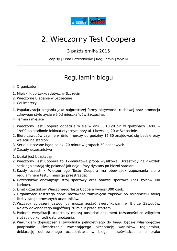 2. Wieczorny Test Coopera 3 października 2015 Zapisy | Lista uczestników | Regulamin | Wyniki Regulamin biegu I. Organizator 1. Miejski Klub Lekkoatletyczny Szczecin 2. Wieczorne Bieganie w Szczecinie II. Cel imprezy 1. Popularyzacja biegania jako najprostszej formy aktywności ruchowej oraz promocja zdrowego stylu życia wśród mieszkańców Szczecina. III.Termin i miejsce 1. Wieczorny Test Coopera odbędzie w się w dniu 3.10.2015r. w godzinach 16:00 – 19:00 na stadionie lekkoatletycznym przy ul. Litewskiej 20 w Szczecinie. 2. Biuro zawodów czynne w dniu imprezy od godziny 15:30 znajdować się będzie przy wejściu na stadion. 3. Serie puszczane będą co ok. 20 minut w grupach 30 osobowych. IV.Zasady uczestnictwa 1. Udział jest bezpłatny. 2. Wieczorny Test Coopera to 12-minutowa próba wysiłkowa. Uczestnicy na gwizdek sędziego starają się pokonać jak najdłuższy dystans po bieżni stadionu. 3. Każdy uczestnik Wieczornego Testu Coopera ma obowiązek zapoznania się z regulaminem testu i musi go przestrzegać. 4. Uczestników obowiązuje strój sportowy oraz obuwie sportowe (bez kolców lub korków). 5. Limit uczestników Wieczornego Testu Coopera wynosi 300 osób. 6. Organizator zastrzega sobie możliwość zamknięcia zapisów po osiągnięciu takiej liczby zarejestrowanych uczestników. 7. Wszyscy zgłoszeni zawodnicy muszą zostać zweryfikowani w Biurze Zawodów. Należy dokonać tego najpóźniej 20 minut przed startem. 8. Podczas weryfikacji uczestnicy muszą posiadać dokument tożsamości ze zdjęciem służący do kontroli daty urodzenia. 9. Warunkiem dopuszczenia zawodnika pełnoletniego do biegu będzie własnoręczne podpisanie Oświadczenia zawierającego akceptację warunków regulaminu, deklarację dobrowolnego uczestnictwa w biegu i zaświadczenie o braku przeciwskazań lekarskich do udziału w Imprezie w Biurze Zawodów. 10.Zawodnicy muszą posiadać numery startowe podczas testu. 11.Minimalny wiek uczestników to ukończony 16 rok życia. 12.W przypadku osób, które do dnia Imprezy nie ukończyły 18 roku życia, wymagane jest dodatkowo posiadanie pozwolenia na udział podpisanego przez rodziców lub prawnych opiekunów. 13.Decyzje opieki medycznej dotyczące kontunuowania biegu podczas imprezy są ostateczne. 14.Uczestnicy biorą udział w imprezie na własną odpowiedzialność. 15.Organizator nie zapewnia jakiegokolwiek ubezpieczenia na życie, zdrowotnego lub od odpowiedzialności cywilnej. V. Zgłoszenia 1. Zgłoszenia odbywać się będą na stronie internetowej pod adresem www.wieczornebieganie.pl poprzez wypełnienie formularza zgłoszeniowego. 2. W zgłoszeniu podaje się: imię i nazwisko, rok urodzenia, adres e-mail. VI.Klasyfikacja Klasyfikacja odbędzie się na podstawie tabeli (dane wyrażone w metrach): Kobiety Wiek 16-19 20-29 30-39 40-49 50+ Bardzo dobry 2700+ 2700+ 2500+ 2300+ 2200+ Dobry 2300–2700 2200–2700 2000–2500 1900–2300 1900–2200 Zadowalający 2100–2300 1800–2200 1700–2000 1500–1900 1500–1900 Słaby 1600–2100 1500–1800 1400–1700 1200–1500 1200–1500 Bardzo słaby 16001500140012001200- Dobry 2400–2800 2400–2800 2300–2700 2100–2500 2000–2400 Zadowalający 2100–2400 2200–2400 1900–2300 1700–2100 1600–2000 Słaby 1700–2100 1600–2200 1500–1900 1400–1700 1300–1600 Bardzo słaby 17001600150014001300- Mężczyźni Wiek 16-19 20-29 30-39 40-49 50+ Bardzo dobry 2800+ 2800+ 2700+ 2500+ 2400+ VII.Certyfikat 1. Wszyscy uczestnicy, którzy ukończą Wieczorny Test Coopera otrzymają imienne certyfikaty potwierdzające przebyty dystans na adres e-mail podany w zgłoszeniu. VIII.Postanowienia końcowe 1. Podczas biegu wszyscy uczestnicy muszą mieć numery startowe przypięte z przodu okrycia wierzchniego uczestnika. Zasłanianie numeru startowego w części lub w całości grozi dyskwalifikacją. 2. Organizator dla każdego uczestnika zapewni wodę mineralną. 3. Organizator nie odpowiada za rzeczy zaginione w trakcie trwania imprezy. 4. W sprawach nie objętych regulaminem rozstrzyga Organizator.