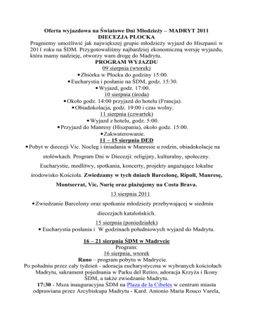 Oferta wyjazdowa na Światowe Dni Młodzieży – MADRYT 2011 DIECEZJA PŁOCKA Pragniemy umożliwić jak największej grupie młodzieży wyjazd do Hiszpanii w 2011 roku na ŚDM. Przygotowaliśmy najbardziej ekonomiczną wersję wyjazdu, która mamy nadzieję, otworzy wam drogę do Madrytu. PROGRAM WYJAZDU 09 sierpnia (wtorek) • Zbiórka w Płocku do godziny 15:00. • Eucharystia i posłanie na ŚDM, godz. 15:30. • Wyjazd, godz. 17:00. 10 sierpnia (środa) • Około godz. 14:00 przyjazd do hotelu (Francja). • Obiadokolacja, godz. 19:00 i czas wolny. 11 sierpnia (czwartek) • Wyjazd z hotelu, godz. 5:00. • Przyjazd do Manresy (Hiszpania), około godz. 15:00. • Zakwaterowanie. 11 – 15 sierpnia DED • Pobyt w diecezji Vic. Nocleg i śniadania w Manresie u rodzin, obiadokolacje na stołówkach. Program Dni w Diecezji: religijny, kulturalny, społeczny. Eucharystie, modlitwy, spotkania, koncerty, projekty angażujące lokalne środowisko Kościoła. Zwiedzamy w tych dniach Barcelonę, Ripoll, Manresę, Montserrat, Vic, 3urię oraz plażujemy na Costa Brava. 13 sierpnia 2011 • Zwiedzanie Barcelony oraz spotkanie młodzieży przebywającej w siedmiu diecezjach katalońskich. 15 sierpnia (poniedziałek) • Eucharystia posłania i W godzinach południowych wyjazd do Madrytu. 16 – 21 sierpnia ŚDM w Madrycie Program: 16 sierpnia, wtorek Rano – program pobytu w Madrycie. Po południu przez cały tydzień - adoracja eucharystyczna w wybranych kościołach Madrytu, sakrament pojednania w Parku del Retiro, adoracja Krzyża i Ikony ŚDM, a także zwiedzanie Madrytu. 17:30 - Msza inauguracyjna ŚDM na Plaza de la Cibeles w centrum miasta odprawiana przez Arcybiskupa Madrytu - Kard. Antonio Maria Rouco Varela, koncelebrowana przez biskupów i kapłanów uczestniczących w ŚDM. Wieczorem - Festiwal Młodych: program kulturalny, w ramach którego będą koncerty, wystawy, spektakle, zwiedzanie muzeów, pokazy artystyczne, warsztaty i spotkania w różnych częściach miasta. 17 sierpnia, środa 9:00 - katechezy w grupach językowych prowadzone przez biskupów i animowane przez grupy/wspólnoty młodzieżowe. Będą odbywały się w kościołach, szkołach, audytoriach i ośrodkach sportowych w Madrycie. W ciągu dnia zwiedzanie Madrytu. Wieczorem - Festiwal Młodych. 18 sierpnia, czwartek 9:00 – katechezy, zwiedzanie Madrytu 16.00 - ceremonia powitania Ojca Świętego w centrum miasta Wieczorem - Festiwal Młodych 19 sierpnia, piątek 9:00 – katechezy, zwiedzanie Madrytu Wieczorem - Festiwal Młodych 21.00 - Droga Krzyżowa. Nabożeństwo 14 stacji Męki Jezusa (stacje hiszpańskiego Wielkiego Tygodnia) z różnych miejsc Półwyspu Iberyjskiego. Grupy wyjdą w procesji na ulice Madrytu wzdłuż Paseo de Recoletos, od Plaza de la Cibeles do Plaza de Colon. 20 sierpnia, sobota • Rano - pielgrzymka na miejsce czuwania - dawne lotnisko Cuatro Vientos (Czterech Wiatrów), około 8 km od centrum miasta 16:00 - Cuatro Vientos, przygotowanie do czuwania, świadectwa, koncerty, modlitwa. 20:00 - czuwanie modlitewne z Ojcem Świętym, homilia do młodych, adoracja eucharystyczna, 23:00 - noc pod gołym niebem na Cuatro Vientos, możliwość indywidualnej modlitwy i adoracji najświętszego sakramentu w specjalnych namiotach. 21 sierpnia, niedziela • 09:00 - Cuatro Vientos, Msza święta na zakończenie ŚDM koncelebrowana przez papieża, biskupów i księży z całego świata, 12.00 - modlitwa południowa Anioł Pański i błogosławieństwo Benedykta XVI Popołudnie: koncerty dla młodzieży i powrót do parafii goszczących. 22 sierpnia (poniedziałek) •Rano wyjazd z Madrytu i zakwaterowanie w hotelu na Costa Brava (śniadanie, obiadokolacja). • Plażowanie/czas wolny. 23 sierpnia (wtorek) • Śniadanie i około godz. 9:00 wyjazd. • Około godz. 19:00 zakwaterowanie w hotelu we Francji i obiadokolacja. 24 sierpnia (środa) • Śniadanie i około godz. 12:00 wyjazd do Polski. 25 sierpnia (czwartek) • Przyjazd do Płocka około godz. 9:00 rano. Koszt wyjazdu: 2.800 złotych (800 zł i 500 euro). Formy płatności: 800 zł na konto DIECEZJI PŁOCKIEJ - jest zaliczką i rejestracją; 500 euro w biurze DDM Studnia lub u wyznaczonych księży w całej diecezji. Euro można wpłacać w ratach: I rata - 250 euro do końca lutego, II rata - 250 euro do końca maja. UWAGA - UWAGA - UWAGA -UWAGA - UWAGA Cena 2.800 złotych obowiązuje do końca listopada 2010 roku. Dla osób rejestrujących się od 01 grudnia 2010 roku koszt wyjazdu wynosi 3.000 złoty. (zaliczka i pierwsza wpłata wynosi wtedy 1.000 złotych) Pośpiesz się! Zaoszczędzisz 200 złotych! Co należy zrobić, abyś się zapisał/a na ŚDM? Wyślij zgłoszenie mailowo na adres [email protected] , podając: imię, nazwisko, adres, PESEL, numer dowodu osobistego lub paszportu; lub listownie do Diecezjalnego Centrum ŚDM na adres: Młodzieżowe Centrum Edukacyjno Wychowawcze STUD3IA ul. Górna 1a 09-402 Płock Dokonaj wpłaty zaliczki w wysokości: 800 zł do 30 listopada 2010 roku Od 1grudnia 2010 roku zaliczka wynosi 1000 zł i całkowity koszt wyjazdu jest większy o 200zł. Wpłaty na konto: Diecezja Płocka ul. Tumska 3 09-402 Płock 3r konta: 30 1240 3174 1111 0010 3091 9449 Tytuł wpłaty : Madryt 2011 + Imię, 3azwisko, Adres (np. Madryt 2011 + Jan Kowalski, ul. Słoneczna 5, 05-864 Ząbki) Potwierdzeniem zgłoszenia mailowego jest wpłata na konto.