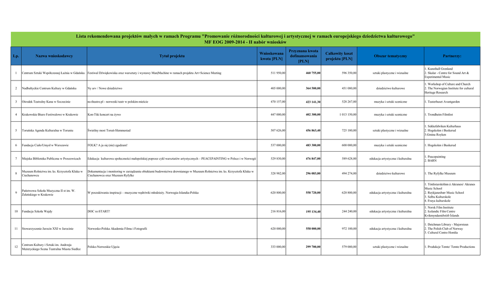 Lista rekomendowana projektów małych w ramach Programu "Promowanie różnorodności kulturowej i artystycznej w ramach europejskiego dziedzictwa kulturowego" MF EOG 2009-2014 - II nabór wniosków Lp. Nazwa wnioskodawcy Tytuł projektu Wnioskowana kwota [PLN] Przyznana kwota dofinansowania [PLN] Całkowity koszt projektu [PLN] Obszar tematyczny Partnerzy: 1. Kunsthall Grenland 2. Skalar - Centre for Sound Art & Experimental Music 1 Centrum Sztuki Współczesnej Łaźnia w Gdańsku Festiwal Dźwiękowiska oraz warsztaty i wystawy Man|Machine w ramach projektu Art+Science Meeting 511 950,00 460 755,00 596 350,00 sztuki plastyczne i wizualne 2 Nadbałtyckie Centrum Kultury w Gdańsku Ny arv / Nowe dziedzictwo 405 000,00 364 500,00 451 080,00 dziedzictwo kulturowe 3 Ośrodek Teatralny Kana w Szczecinie no.theatre.pl - norweski teatr w polskim mieście 470 157,00 423 141,30 528 267,00 muzyka i sztuki sceniczne 1. Teaterhuset Avantgarden 4 Krakowskie Biuro Festiwalowe w Krakowie Kon-Tiki koncert na żywo 447 000,00 402 300,00 1 013 150,00 muzyka i sztuki sceniczne 1. Trondheim Filmfest 5 Toruńska Agenda Kulturalna w Toruniu Świetlny most Toruń-Slemmestad 507 626,00 456 863,40 725 180,00 sztuki plastyczne i wizualne 6 Fundacja Ciało/Umysł w Warszawie FOLK? A ja się (nie) zgadzam! 537 000,00 483 300,00 600 000,00 muzyka i sztuki sceniczne 7 Miejska Biblioteka Publiczna w Proszowicach Edukacja kulturowa społeczności małopolskiej poprzez cykl warsztatów artystycznych – PEACEPAINTING w Polsce i w Norwegii 529 830,00 476 847,00 589 628,00 edukacja artystyczna i kulturalna 8 Muzeum Rolnictwa im. ks. Krzysztofa Kluka w Ciechanowcu Dokumentacja i monitoring w zarządzaniu obiektami budownictwa drewnianego w Muzeum Rolnictwa im. ks. Krzysztofa Kluka w Ciechanowcu oraz Muzeum Ryfylke 328 982,00 296 083,80 494 274,00 dziedzictwo kulturowe 9 Państwowa Szkoła Muzyczna II st im. W. Żeleńskiego w Krakowie W poszukiwaniu inspiracji – muzyczne wędrówki młodzieży. Norwegia-Islandia-Polska 620 800,00 558 720,00 620 800,00 edukacja artystyczna i kulturalna 1. Tónlistarskólinn á Akranesi/ Akranes Music School 2. Reykjanesbær Music School 3. Selbu Kulturskole 4. Frøya kulturskole 10 Fundacja Szkoła Wajdy DOC re-START! 216 816,00 195 134,40 244 240,00 edukacja artystyczna i kulturalna 1. Norsk Film Institute 2. Icelandic Film Centre Kvikmyndamiðstöð Íslands 11 Stowarzyszenie Jarocin XXI w Jarocinie Norwesko-Polska Akademia Filmu i Fotografii 620 000,00 558 000,00 972 100,00 edukacja artystyczna i kulturalna 1. Deichman Library - Majorsteun 2. The Polish Club of Norway 3. Cultural Centre Homlia 12 Centrum Kultury i Sztuki im. Andrzeja Meżeryckiego Scena Teatralna Miasta Siedlce Polsko-Norweskie Ujęcia 333 000,00 299 700,00 579 000,00 sztuki plastyczne i wizualne 1. Workshop of Culture and Church 2. The Norwegian Institute for cultural Heritage Research 1. Sekkefabriken Kulturhaus 2. Hogskolen i Buskerud 3.Gmina Royken 1. Hogskolen i Buskerud 1. Peacepainting 2. BARN 1. The Ryfylke Museum 1. Produkcje Temte/ Temte Productions
